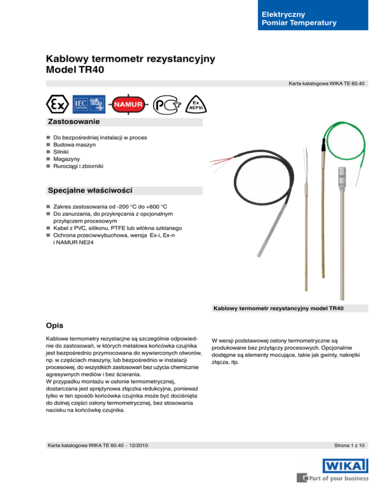 Elektryczny Pomiar Temperatury Kablowy termometr rezystancyjny Model TR40 Karta katalogowa WIKA TE 60.40 Zastosowanie Do bezpośredniej instalacji w proces Budowa maszyn Silniki Magazyny Rurociągi i zbiorniki Specjalne właściwości Zakres zastosowania od -200 °C do +600 °C Do zanurzania, do przykręcania z opcjonalnym przyłączem procesowym Kabel z PVC, silikonu, PTFE lub włókna szklanego Ochrona przeciwwybuchowa, wersja Ex-i, Ex-n i NAMUR NE24 Kablowy termometr rezystancyjny model TR40 Opis Kablowe termometry rezystacjne są szczególnie odpowiednie do zastosowań, w których metalowa końcówka czujnika jest bezpośrednio przymocowana do wywierconych otworów, np. w częściach maszyny, lub bezpośrednio w instalacji procesowej, do wszystkich zastosowań bez użycia chemicznie agresywnych mediów i bez ścierania. W przypadku montażu w osłonie termometrycznej, dostarczana jest sprężynowa złączka redukcyjna, ponieważ tylko w ten sposób końcówka czujnika może być dociśnięta do dolnej części osłony termometrycznej, bez stosowania nacisku na końcówkę czujnika. Karta katalogowa WIKA TE 60.40 ∙ 12/2010 W wersji podstawowej osłony termometryczne są produkowane bez przyłączy procesowych. Opcjonalnie dostępne są elementy mocujące, takie jak gwinty, nakrętki złącza, itp. Strona 1 z 10 Sensor Sensor znajduję się w końcówce czujnika. Sposób podłączania sensora 2 - przewodowy: rezystancja przewodu jest traktowana jako błąd pomiaru 3 - przewodowy: w przypadku kabli o długości ok. 30m lub więcej mogą wystąpić błędy pomiaru 4 - przewodowy: wewnętrzna rezystancja kabla podłączonych przewodów jest nieistotna Błąd graniczny sensora Klasa B Klasa A Klasa AA Kombinacje 2-przewodowe Klasy A / Klasa AA nie jest możliwa, ponieważ rezystancja przewodu czujnika mieści się poza skalą dokładności sensora. Dokładna specyfikacja czujnika Pt100, patrz informacja techniczna IN 00.17 na stronie www.wikapolska.pl Konstrukcja końcówki czujnika Wersja standardowa W wersji standardowej czujnik jest dobrany odpowiednio do wybranej wartości pomiarowej. Czujnik może być stosowany do obciążeń z przyspieszeniem do 30 m/s². (Badanie zgodne z DIN EN 60751) Czułość końcówki (czujnik cienkowarstwowy) Do końcówki czujnika podłączony jest dodatkowy rezystor pomiarowy. Ze względu na jego bezpośrednie podłączenie do końcówki, wersja ta nie może być stosowana jako termometr samoistnie bezpieczny. Końcówka czujnika odporna na wibrację (max. 10 g) W przypadku tej szczególnie odpornej wersji stosuje się dodatkowe rezystory. Aby zapewnić długookresową rezystancję na wysokie obciążenia (100 m/s²) dodatkowo wybrano specjalną konstrukcję wewnętrzną. (Badanie oparte na DIN EN 60751) Czujnik metalowy Materiał: stal CrNi Średnica: 2 mm, 3 mm, 6 mm lub 8 mm Długość: do wyboru Niezależnie od konstrukcji końcówki czujnika nie można odchylać na pierwszych 60 mm. W przypadku pomiarów temperatury w ciałach stałych średnica wywierconego otworu, do którego ma być włożony czujnik, powinna być maksymalnie o 1 mm większa niż średnica czujnika. Kablowe termometry rezystancyjne mogą mieć dwie konstrukcje: Wersja cylindryczna Konstrukcja cylindryczna charakteryzuje się sztywną budową metalowej końcówki czujnika, dlatego też konstrukcje te nie mogą być zginane. Rezystor pomiarowy jest wewnątrz podłączony bezpośrednio do izolowanej żyły, tak więc kable cylindryczne osłon termometrycznych mogą być wykorzystywane jedynie do wartości temperatur określonych dla kabla (patrz temperatury robocze). Konstrukcja budowy płaszcza W przypadku termometrów rezystancyjnych z płaszczem miękka część czujnika jest wykonana z kabla o izolacji mineralnej (kabel MI). Zbudowana jest z osłony zewnętrznej ze stali nierdzewnej z wewnętrznym kablem, izolowanej mocno sprasowanym proszkiem ceramicznym. Rezystor pomiarowy jest podłączony bezpośrednio do wewnętrznych przewodów osłoniętego kabla, dlatego też jest odpowiedni do stosowania w wyższych temperaturach. Ze względu na elastyczność i niewielkie średnice termometrów rezystancyjnych z płaszczem mogą być wykorzystywane w trudno dostępnych miejscach. Poza końcówką czujnika i przejściem do kabla łączącego, osłona może być zginana do 3-krotnej średnicy promienia. Zapamiętaj: W przypadku odpowiednio wysokiego natężenia przepływu, należy wziąć pod uwagę elastyczność osłoniętego termometru rezystancyjnego. Strona 2 z 10 Karta katalogowa WIKA TE 60.40 ∙ 12/2010 Maksymalne temperatury robocze Przejścia W zależności od konstrukcji, złącze między częścią metalową termometru rezystancyjnego a kablem lub przewodem łączącym jest zaciskane, walcowane lub odlewane. Złącze nie powinno być zanurzane w płynie procesowym i nie może być zginane. Zaciski mocujące nie powinny być przymocowane do przejścia. Typ i wymiary przejścia zależą głównie od połączenia pomiędzy żyłami wejściowymi a metalowym czujnikiem oraz wymogów dotyczących uszczelnienia. Wymiar T oznacza długość przejścia Krtyerium Wymiar T w mm Ø przejścia w mm Ø czujnika = Ø przejścia nie dotyczy Ø 2 ... 4,5 mm z przejściem zaciskowym taka sama jak czujnika 45 6 45 7 45 8 45 10 Ø 6 mm z przejściem zaciskowym Ø 6 mm z przejściem zaciskowym 1) Ø 8 mm z przejściem zaciskowym 1) Przy dużej liczbie przewodów (np. 2 x 3-przewodowe i ekranowe) Przyłącze kablowe Różne materiały izolacyjne mogą być dostosowane do różnych panujących warunków. Końcówka kabla może być dostarczona w stanie gotowym do podłączenia z opcjonalnie przymocowaną wtyczką. Przyłącze kablowe (standardowe) Materiał przewodu: Cu (skrętki) Przekrój przewodu: ok. 0,22 mm² (wersja standardowa) Liczba przewodów: w zależności od sposobu podłączenia Materiał izolacyjny: PCV, silikon, PTFE lub włókno szklane Ekranowanie (opcja) Maksymalne temperatury ro