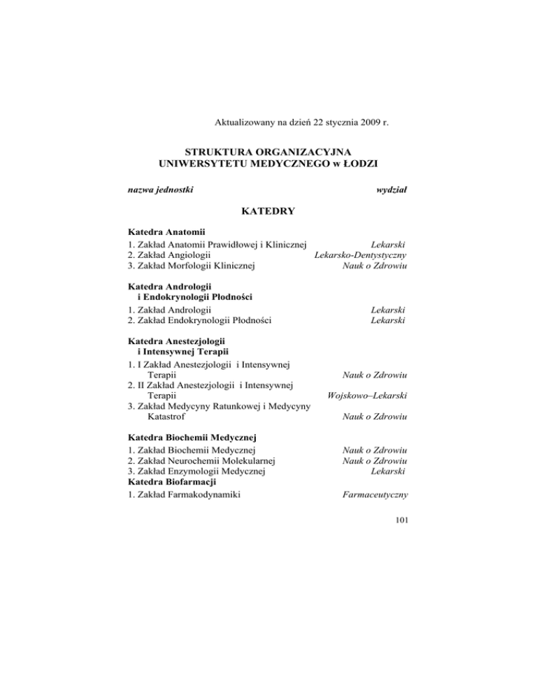 Aktualizowany na dzień 22 stycznia 2009 r. STRUKTURA ORGANIZACYJNA UNIWERSYTETU MEDYCZNEGO w ŁODZI nazwa jednostki wydział KATEDRY Katedra Anatomii 1. Zakład Anatomii Prawidłowej i Klinicznej Lekarski 2. Zakład Angiologii Lekarsko-Dentystyczny 3. Zakład Morfologii Klinicznej Nauk o Zdrowiu Katedra Andrologii i Endokrynologii Płodności 1. Zakład Andrologii 2. Zakład Endokrynologii Płodności Katedra Anestezjologii i Intensywnej Terapii 1. I Zakład Anestezjologii i Intensywnej Terapii 2. II Zakład Anestezjologii i Intensywnej Terapii 3. Zakład Medycyny Ratunkowej i Medycyny Katastrof Katedra Biochemii Medycznej 1. Zakład Biochemii Medycznej 2. Zakład Neurochemii Molekularnej 3. Zakład Enzymologii Medycznej Katedra Biofarmacji 1. Zakład Farmakodynamiki Lekarski Lekarski Nauk o Zdrowiu Wojskowo–Lekarski Nauk o Zdrowiu Nauk o Zdrowiu Nauk o Zdrowiu Lekarski Farmaceutyczny 101 Uniwersytet Medyczny w Łodzi 2. Zakład Biofarmacji 3. Zakład Farmacji Szpitalnej 4. Zakład Farmakogenetyki Farmaceutyczny Farmaceutyczny Pielęgniarstwa i Położnictwa Katedra Biofizyki Molekularnej i Medycznej 1. Zakład Biofizyki Molekularnej i Medycznej Nauk o Zdrowiu Katedra Biologii i Biotechnologii Farmaceutycznej 1. Zakład Biologii i Botaniki Farmaceutycznej 2. Zakład Biosyntezy Środków Leczniczych 3. Zakład Mikrobiologii Farmaceutycznej Farmaceutyczny Farmaceutyczny Farmaceutyczny Katedra Biologii i Genetyki Medycznej 1. Zakład Biologii i Genetyki Fizjoterapii 2. Zakład Biologii i Parazytologii Lekarskiej Lekarski 3. Zakład Diagnostyki i Leczenia Chorób Pasożytniczych i Grzybic Lekarsko–Dentystyczny 4. Zakład Genetyki Medycznej Lekarsko–Dentystyczny Katedra Biomedycznych Podstaw Pielęgniarstwa 1. Zakład Patomorfologii Wieku Rozwojowego 2. Zakład Nauk Podstawowych w Pielęgniarstwie Pielęgniarstwa i Położnictwa Pielęgniarstwa i Położnictwa Katedra Chemii Biomedycznej 1. Zakład Biologii Molekularnej Nowotworów Lekarski 2. Zakład Chemii Biomedycznej Nauk o Zdrowiu 3. Zakład Chemii Biomolekularnej Lekarski 4. Zakład Farmakologii Molekularnej Lekarsko–Dentystyczny Katedra Chemii Bioorganicznej i Biokoordynacyjnej 1. Zakład Chemii Bioorganicznej 102 Farmaceutyczny STATUT 2. Zakład Chemii Fizycznej i Biokoordynacyjnej Farmaceutyczny Katedra Chemii Farmaceutycznej i Biochemii 1. Zakład Chemii Farmaceutycznej i Analizy Leków 2. Zakład Biochemii Farmaceutycznej Katedra Chemii i Biochemii Klinicznej 1. Zakład Chemii i Biochemii Klinicznej 2. Zakład Chronofarmakologii Katedra Chemii Medycznej 1. Zakład Syntezy i Technologii Środków Leczniczych 2. Zakład Chemii Bionieorganicznej 3. Zakład Chemii Analitycznej Farmaceutyczny Farmaceutyczny Fizjoterapii Fizjoterapii Farmaceutyczny Farmaceutyczny Farmaceutyczny Katedra Chirurgii 1. Klinika Chirurgii Gastroenterologicznej, Onkologicznej i Ogólnej Lekarski 2. Klinika Chirurgii Ogólnej i Kolorektalnej Wojskowo–Lekarski 3. Klinika Chirurgii Ogólnej i Transplantacyjnej Pielęgniarstwa i Położnictwa 4. Klinika Chirurgii Klatki Piersiowej, Chirurgii Ogólnej i Onkologicznej Wojskowo–Lekarski 5. Klinika Chirurgii Czaszkowo-Szczękowo-Twarzowej Lekarsko–Dentystyczny 6. Klinika Chirurgii Plastycznej, Rekonstrukcyjnej i Estetycznej Lekarski 7. Oddział Kliniczny Chirurgii Klatki Piersiowej i Rehabilitacji Oddechowej Fizjoterapii 8. Oddział Kliniczny Chirurgii Ogólnej i Onkologicznej Nauk Biomedycznych i Kształcenia Podyplomowego 103 Uniwersytet Medyczny w Łodzi 9. Oddział Kliniczny Chirurgii Szczękowo-Twarzowej Wojskowo-Lekarski 10. Oddział Kliniczny Dydaktyki w Pielęgniarstwie Pielęgniarstwa i Położnictwa 11. Zakład Chirurgii Wojskowej Wojskowo-Lekarski I Katedra Chorób Oczu 1. Klinika Chorób Oczu Lekarski 2. Zakład Patofizjologii Widzenia Obuocznego i Leczenia Zeza Pielęgniarstwa i Położnictwa II Katedra Chorób Oczu 1. Klinika Okulistyki i Rehabilitacji Wzrokowej 2. Zakład Diagnostyki Chorób Oczu Wojskowo–Lekarski Wojskowo–Lekarski II Katedra Chorób Układu Nerwowego 1. Klinika Chorób Układu Pozapiramidowego Fizjoterapii 2. Klinika Neurologii i Epileptologii z Oddziałem Udarowym Wojskowo–Lekarski 3. Klinika Psychiatrii Dorosłych Wojskowo–Lekarski 4. Oddział Kliniczny Propedeutyki Neurologicznej z Pododdziałem Udarowym Nauk Biomedycznych. i Kształcenia Podyplomowego 5. Zakład Neurologii Polowej Wojskowo-Lekarski 6. Zakład Orzecznictwa Sądowo-Psychiatrycznego Wojskowo-Lekarski 7. Zakład Psychiatrii Wojskowej Wojskowo-Lekarski Katedra Chorób Zakaźnych i Hepatologii 1. Klinika Chorób Zakaźnych i Hepatologii Katedra Chorób Zakaźnych 104 Lekarski STATUT 1. Klinika Chorób Zakaźnych i Chorób Wątroby Wojskowo–Lekarski Katedra Dermatologii i Wenerologii 1.Klinika Dermatologii i Wenerologii Lekarski 2.Zakład Immunodermatologii Pielęgniarstwa i Położnictwa 3.Zakład Psychodermatologii Lekarski II Katedra Dermatologii 1. Klinika Dermatologii, Dermatologii Dziecięcej i Onkologicznej 2. Klinika Dermatologii Ogólnej, Estetycznej i Dermatochirurgii Wojskowo–Lekarski Fizjoterapii Katedra Diagnostyki Laboratoryjnej 1. Zakład Diagnostyki Laboratoryjnej Lekarski 2. Zakład Zaburzeń Krzepnięcia Krwi Nauk o Zdrowiu 3. Zakład Diagnostyki Laboratoryjnej i Biochemii Klinicznej Wojskowo–Lekarski 4. Zakład Podstaw Molekularnych Kardionefrologii i Nadciśnienia Tętniczego Wojskowo-Lekarski Katedra Endokrynologii 1. Klinika Chirurgii Endokrynologicznej, Ogólnej i Naczyniowej Lekarski 2. Klinika Endokrynologii Pielęgniarstwa i Położnictwa 3. Zakład Chirurgii Doświadczalnej Nauk Biomedycznych i Kształcenia Podyplomowego 4. Zakład Immunoendokrynologii Lekarski 5. Zakład Neuroendokrynologii Wojskowo–Lekarski Katedra Endokrynologii i Chorób Metabolicznych 1. Klinika Chirurgii Ogólnej, Onkologicznej i Gruczołów Dokrewnych 2. Klinika Endokrynologii i Chorób Metabolicznych Lekarski Lekarski 105 Uniwersytet Medyczny w Łodzi 3. Oddział Kliniczny Medycyny Nuklearne