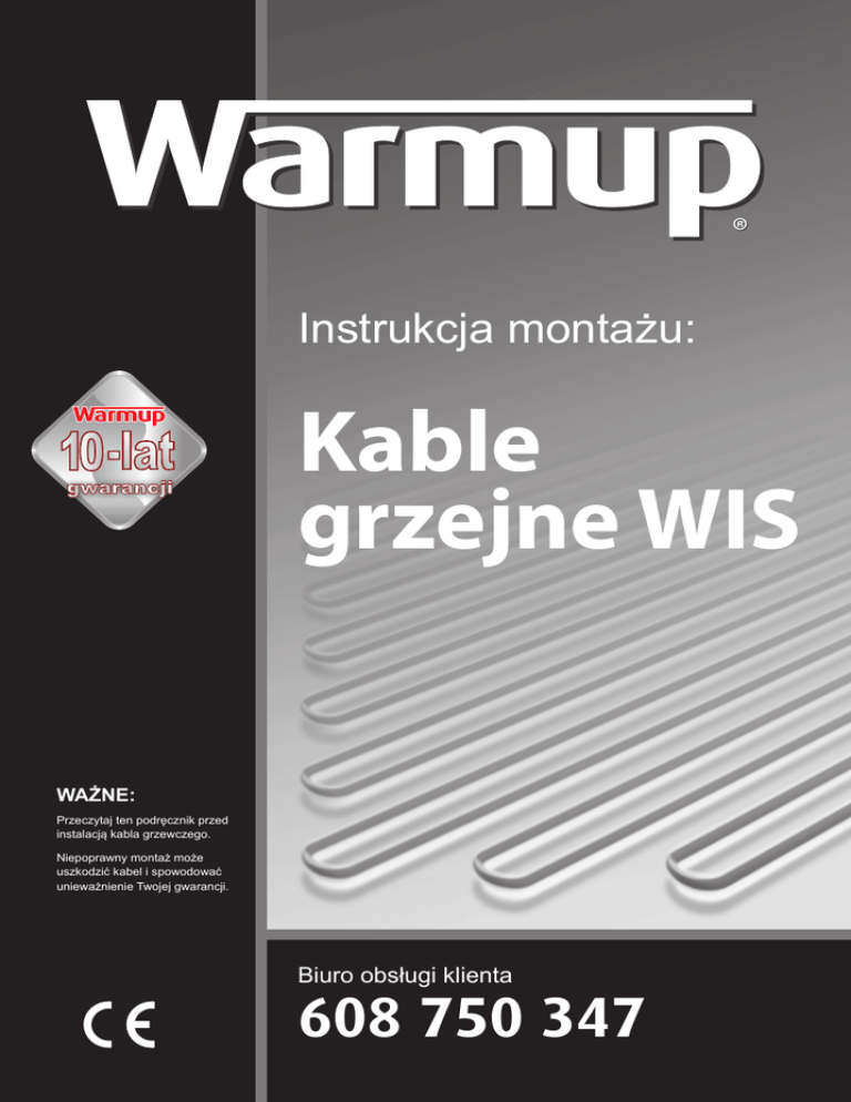 Überschrift ® Instrukcja montażu: Kable grzejne WIS WAŻNE: Przeczytaj ten podręcznik przed instalacją kabla grzewczego. Niepoprawny montaż może uszkodzić kabel i spowodować unieważnienie Twojej gwarancji. Biuro obsługi klienta 608 750 347 Biuro obsługi klienta - 608 750 347 Spis treści Spis treści 2 Co wolno a czego nie 2 Produkt 3 3 Uwagi na temat instalacji elektrycznej Przygotowanie podłoża 4 Montaż 5 Podłączanie termostatu 6 Testowanie 6 Gwarancja 7 Przewodnik po typoszeregu oraz odległości między kablami grzejnymi 8 Co wolno a czego nie Kable grzejne muszą być układane w odległości minimum 50 mm od ! siebie. ! Kable grzejne nie mogą się ze sobą krzyżować lub stykać . ! Kabel grzejny nie może być przecięty, uszkodzony lub skrócony. ! Cały kabel grzejny wraz z mufą połączeniową, musi być zatopiony w betonowej wylewce. ! Montaż kabla grzejnego należy przeprowadzać nie wcześniej, niż 30 dni od wykonania bazowej warstwy podłoża betonowego w celu zagwarantowania jej całkowitego wyschnięcia. ! Nie montować kabla grzejnego na schodach lub w ścianach. Jeśli przestrzegane będą instrukcje zawarte w niniejszym podręczniku, nie powinieneś mieć żadnych problemów z montażem systemu grzewczego. Jeśli potrzebujesz pomocy na którymkolwiek etapie, zadzwoń do naszego biura obsługi klienta 608 2 750 347. Biuro obsługi klienta - 608 750 347 Produkt Niniejszy produkt Warmup to kabel grzejny przeznaczony do systemów elektrycznego ogrzewania podłogowego. Kabel grzejny został zaprojektowany do umieszczenia wewnątrz podłoża betonowego o co najmniej 50 mm grubości. Kabel jest podwójnie izolowany, zbudowany z dwóch żył grzejnych otoczonych stalowym oplotem uziemiającym. Kabel jest wyposażony w 3 metrowe „zimne złącze” z fabryczną mufą do połączenia z termostatem. System przeznaczony jest do pracy w instalacji elektrycznej o napięciu 220-240V AC i wytwarza moc 20W/m. Isolierung Izolacja zewnętrzna (PVC) Erdgeflecht Isolierung Doppelkern Izolacja Ekran Żyły grzejne uziemiający wewnętrzna o podwójnym (ECTFE) rdzeniu UWAGI NA TEMAT INSTALACJI ELEKTRYCZNEJ Przed zainstalowaniem kabla grzejnego należy zapewnić odpowiedniej mocy zasilanie elektryczne 220-240V. System grzewczy wymaga wyłącznika różnicowo-prądowego RCD, przez który powinien być zasilony termostat. Wszystkie instalacje i podłączenia elektryczne muszą być wykonywane przez wykwalifikowanego elektryka zgodnie z obowiązującymi przepisami i normami, elektrycznymi oraz budowlanymi. Instalacja więcej niż jednego kabla grzejnego wymaga, by WSZYSTKIE „zimne” kable zasilające były połączone z termostatem równolegle, a nie szeregowo. Podłączenie dwóch lub więcej kabli grzejnych równolegle do jednego termostatu może wymagać podtynkowej puszki rozgałęźnej. Zimny przewód zasilający składa się z trzech przewodów: fazowego, neutralnego i ochronnego. Należy zachować ostrożność i upewnić się, że łączny pobór prądu kabli grzejnych podłączanych razem do jednego termostatu nie przekracza 16A - patrz przewodnik po typoszeregu. Kabel grzewczy nie może być przecięty, skrócony, narażony na działanie sił lub obciążenia. Jeśli to konieczne, “zimny“ przewód zasilający może zostać skrócony. LL Uwaga: termostat z kablem grzejnym musi być zasilany poprzez wyłącznik różnicowo-prądowy RCD. Biuro obsługi klienta - 608 750 347 3 Przygotowanie podłoża Kabel grzejny Warmup® powinien być umieszczony w płycie betonowej o grubości minimum 50 mm, gdzie co najmniej 30 mm z tej warstwy powinno znajdować się powyżej kabla. W zależności od konstrukcji podłoża, możliwe może być zastosowanie dodatkowej izolacji podłoża. Więcej szczegółów na rysunkach poniżej. A J EŚLI BETONOWA PODŁOGA MA GRUBOŚĆ 10 CM LUB MNIEJ I JEST ZAIZOLOWANA: Można zainstalować kabel grzejny bezpośrednio na niej Posadzka 30mm wylewka betonowa Kabel grzejny Wylewka samopoziomująca Izolacja B J EŚLI BETONOWA PODŁOGWA JEST GRUBSZA NIŻ 10 CM LUB JEST BEZ IZOLACJI: Można zainstalować izolację przed ułożeniem kabla grzejnego Posadzka 30mm wylewka betonowa Kabel grzejny 20mm wylewka betonowa Płyta izolacyjna Płyta fundamentowa lub strop Podłoże powinno być odpowiednie do betonu. Powinno być solidne, wykonane z odpowiedniego materiału, wolne od zanieczyszczeń i kurzu. Wszelkie otwory w podłodze powinny być uszczelnione lub wypełnione odpowiednim materiałem. Należy usunąć wszystkie ostre przedmioty lub materiały, które potencjalnie mogą uszkodzić kabel grzejny podczas jego montażu. 4 Biuro obsługi klienta - 608 750 347 Montaż Zalecane jest sporządzenie planu pomieszczenia w celu określenia położenia termostatu, kabla grzejnego i podłogowego czujnika temperatury. Schemat ten powinien być załączony do dokumentacji powykonawczej i zachowany na przyszłość. 1 Taśmy mocujące powinny być ułożone prostopadle do prowadzonych kabli grzewczych. Należy je przymocować do izolacji lub betonowej posadzki przy użyciu śrub, gwoździ lub kleju. Ważne, by mocowanie taśm do podłoża było pewne i stabilne, by zapobiec ich przesuwaniu się podczas układania kabla grzejnego. Taśmy montażowe powinny być równomiernie rozłożone na podłodze w odległości 0,75 m od siebie. Powinny być rozmieszczone tak, by pozostawić ok. 10cm wolnej przestrzeni przy ścianach po obrzeżach pokoju. Kabel grzewczy powinien być układany tam i z powrotem, a mocowany do metalowych taśm mocujących. Odstępy pomiędzy kablami są indywidualne i zależne od wymaganej mocy na m2 - (patrz przewodnik po typoszeregu i odległościach między kablami). Kable powinny być rozkładane w równych odstępach, by zapewnić równomiernie ogrzewanie podłogi (minimalny odstęp pomiędzy kablami to 50 mm). Kable grzewcze nie mogą się ze sobą krzyżować lub stykać. “Zimny” przewód zasilający powinien być podłączony