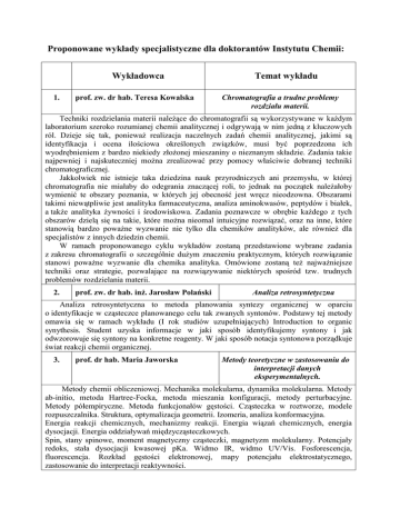 Proponowane wykłady specjalistyczne dla doktorantów Instytutu Chemii: Wykładowca 1. prof. zw. dr hab. Teresa Kowalska Temat wykładu Chromatografia a trudne problemy rozdziału materii. Techniki rozdzielania materii należące do chromatografii są wykorzystywane w każdym laboratorium szeroko rozumianej chemii analitycznej i odgrywają w nim jedną z kluczowych ról. Dzieje się tak, ponieważ realizacja naczelnych zadań chemii analitycznej, jakimi są identyfikacja i ocena ilościowa określonych związków, musi być poprzedzona ich wyodrębnieniem z bardzo niekiedy złożonej mieszaniny o nieznanym składzie. Zadania takie najpewniej i najskuteczniej można zrealizować przy pomocy właściwie dobranej techniki chromatograficznej. Jakkolwiek nie istnieje taka dziedzina nauk przyrodniczych ani przemysłu, w której chromatografia nie miałaby do odegrania znaczącej roli, to jednak na początek należałoby wymienić te obszary poznania, w których jej obecność jest wręcz nieodzowna. Obszarami takimi niewątpliwie jest analityka farmaceutyczna, analiza aminokwasów, peptydów i białek, a także analityka żywności i środowiskowa. Zadania poznawcze w obrębie każdego z tych obszarów dzielą się na takie, które można nieomal intuicyjne rozwiązać, oraz na inne, które stanowią bardzo poważne wyzwanie nie tylko dla chemików analityków, ale również dla specjalistów z innych dziedzin chemii. W ramach proponowanego cyklu wykładów zostaną przedstawione wybrane zadania z zakresu chromatografii o szczególnie dużym znaczeniu praktycznym, których rozwiązanie stanowi poważne wyzwanie dla chemika analityka. Omówione zostaną też najważniejsze techniki oraz strategie, pozwalające na rozwiązywanie niektórych spośród tzw. trudnych problemów rozdzielania materii. 2. prof. zw. dr hab. inż. Jarosław Polański Analiza retrosyntetyczna Analiza retrosyntetyczna to metoda planowania syntezy organicznej w oparciu o identyfikacje w cząsteczce planowanego celu tak zwanych syntonów. Podstawy tej metody omawia się w ramach wykładu (I rok studiów uzupełniających) Introduction to organic synythesis. Student uzyska informacje w jaki sposób identyfikujemy syntony i jak odwzorowuje się syntony na konkretne reagenty. W jaki sposób notacja syntonowa porządkuje świat reakcji chemii organicznej. 3. prof. dr hab. Maria Jaworska Metody teoretyczne w zastosowaniu do interpretacji danych eksperymentalnych. Metody chemii obliczeniowej. Mechanika molekularna, dynamika molekularna. Metody ab-initio, metoda Hartree-Focka, metoda mieszania konfiguracji, metody perturbacyjne. Metody półempiryczne. Metoda funkcjonałów gęstości. Cząsteczka w roztworze, modele rozpuszczalnika. Struktura, optymalizacja geometrii. Izomeria, analiza konformacyjna. Energia reakcji chemicznych, mechanizmy reakcji. Energia wiązań chemicznych, energia dysocjacji. Energia oddziaływań międzycząsteczkowych. Spin, stany spinowe, moment magnetyczny cząsteczki, magnetyzm molekularny. Potencjały redoks, stała dysocjacji kwasowej pKa. Widmo IR, widmo UV/Vis. Fosforescencja, fluorescencja. Rozkład gęstości elektronowej, mapy potencjału elektrostatycznego, zastosowanie do interpretacji reaktywności. 4. prof. dr hab. Barbara Machura, dr hab. prof. UŚ Jan Małecki Problemy współczesnej chemii koordynacyjnej Celem wykładu jest zapoznanie ze współczesnymi aspektami chemii koordynacyjnej w zakresie syntezy, nowoczesnych metod badawczych i opisu struktury molekularnej i elektronowej związków kompleksowych (w tym polimerów koordynacyjnych) oraz interpretacji właściwości fizykochemicznych związków koordynacyjnych w oparciu o ich strukturę elektronową, molekularną i krystaliczną. Zostaną omówione również możliwości modelowania właściwości fizykochemicznych związków kompleksowych, w tym polimerów koordynacyjnych, poprzez odpowiedni dobór ligandów i jonu centralnego. Trwająca od wielu lat fascynacja związkami koordynacyjnymi jest konsekwencją ich szerokich zastosowań jako katalizatory licznych procesów przemysłowych i reakcji organicznych, jako magnetyki molekularne, materiały luminescencyjne czy leki. Szczegółowo zostaną omówione następujące zagadnienia: przybliżenie słabego i silnego pola; diagramy korelacyjne i reguły wyboru przejść elektronowych; jedno-, dwu- lub trójwymiarowe organiczno-nieorganiczne polimery koordynacyjne (elementy budulcowe, zasady projektowania, charakterystyka strukturalna oraz zastosowania), uporządkowanie magnetyczne (ferro-, antyferro, ferri-magnetyzm) w związkach wielordzeniowych oraz związki kompleksowe w diagnostyce i terapii chorób. 5. prof. zw. dr hab. inż. Stanisław Krompiec Kataliza homogeniczna w syntezie związków karbo- i heterocyklicznych Trudno przecenić znaczenie związków karbocyklicznych, np. pochodnych cykloheksanu, benzenu, naftalenu czy antracenu oraz związków heterocyklicznych, w tym pirydyny, pirolu, furanu, kabazolu, oksiranów - są obecne w organizmach żywych, są wytwarzane przez przemysł farmaceutyczny, stosowane w przemyśle spożywczym, w nowoczesnej technologii elektronowej. Szczególne miejsce w syntezie tych związków zajmują katalizatory, a wśród tych ostatnich naturalne biokatalizatory oraz bedące ich imitacjami (coraz doskonalszymi) syntetyczne katalizatory - związki i kompleksy metali, w tym metaloorganiczne. W trakcie wykładu omówione zostaną nowoczesne metody otrzymywania związków karbo- i hetrocyklicznych z wykorzystaniem takich reakcji, jak metateza, różnego typu cykloaddycje ([4 + 2], [3 + 2], [2 + 2 + 2] i inne), epoksydacja, karbonylowanie, addycja do wiązań wielokrotnych, katalizowanych kompleksami metali. Podane zostaną przykłady reakcji tandemowych i kaskadowych prowadzące od nieraz prostych substratów do zlożonych produktów cyklicznych, w tym pochodzenia naturalnego. Pokazane zostaną przykłady wykorzystania do tych reakcji katalizy z udziałem ko