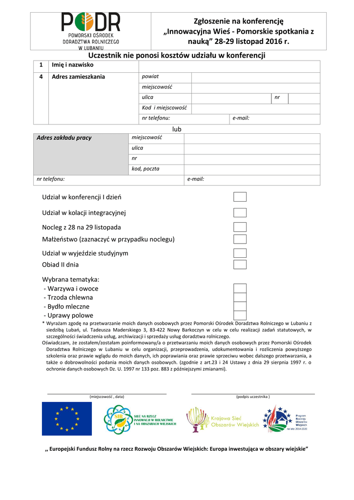 Zgłoszenie na konferencję „Innowacyjna Wieś - Pomorskie spotkania z nauką” 28-29 listopad 2016 r. Uczestnik nie ponosi kosztów udziału w konferencji 1 Imię i nazwisko 4 Adres zamieszkania powiat miejscowość ulica nr Kod i miejscowość nr telefonu: e-mail: lub Adres zakładu pracy miejscowość ulica nr kod, poczta nr telefonu: e-mail: Udział w konferencji I dzień Udział w kolacji integracyjnej Nocleg z 28 na 29 listopada Małżeństwo (zaznaczyć w przypadku noclegu) Udział w wyjeździe studyjnym Obiad II dnia Wybrana tematyka: - Warzywa i owoce - Trzoda chlewna - Bydło mleczne - Uprawy polowe * Wyrażam zgodę na przetwarzanie moich danych osobowych przez Pomorski Ośrodek Doradztwa Rolniczego w Lubaniu z siedzibą Lubań, ul. Tadeusza Maderskiego 3, 83-422 Nowy Barkoczyn w celu w celu realizacji zadań statutowych, w szczególności świadczenia usług, archiwizacji i sprzedaży usług doradztwa rolniczego. Oświadczam, że zostałem/zostałam poinformowany/a o przetwarzaniu moich danych osobowych przez Pomorski Ośrodek Doradztwa Rolniczego w Lubaniu w celu organizacji, przeprowadzenia, udokumentowania i rozliczenia powyższego szkolenia oraz prawie wglądu do moich danych, ich poprawiania oraz prawie sprzeciwu wobec dalszego przetwarzania, a także o dobrowolności podania moich danych osobowych. (zgodnie z art.23 i 24 Ustawy z dnia 29 sierpnia 1997 r. o ochronie danych osobowych Dz. U. 1997 nr 133 poz. 883 z późniejszymi zmianami). (miejscowość , data) (podpis uczestnika ) ,, Europejski Fundusz Rolny na rzecz Rozwoju Obszarów Wiejskich: Europa inwestująca w obszary wiejskie”