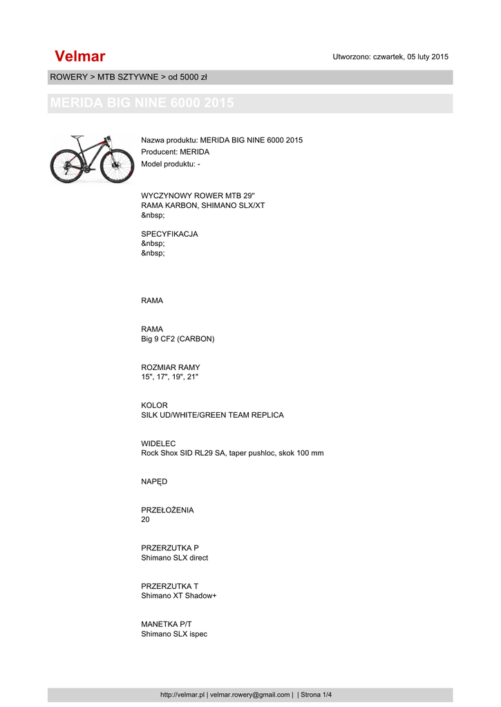 Velmar Utworzono: czwartek, 05 luty 2015 ROWERY > MTB SZTYWNE > od 5000 zł MERIDA BIG NINE 6000 2015 Nazwa produktu: MERIDA BIG NINE 6000 2015 Producent: MERIDA Model produktu: - WYCZYNOWY ROWER MTB 29'' RAMA KARBON, SHIMANO SLX/XT SPECYFIKACJA RAMA RAMA Big 9 CF2 (CARBON) ROZMIAR RAMY 15", 17", 19", 21" KOLOR SILK UD/WHITE/GREEN TEAM REPLICA WIDELEC Rock Shox SID RL29 SA, taper pushloc, skok 100 mm NAPĘD PRZEŁOŻENIA 20 PRZERZUTKA P Shimano SLX direct PRZERZUTKA T Shimano XT Shadow+ MANETKA P/T Shimano SLX ispec http://velmar.pl | [email protected] | | Strona 1/4 Velmar Utworzono: czwartek, 05 luty 2015 ROWERY > MTB SZTYWNE > od 5000 zł MERIDA BIG NINE 6000 2015 KORBA Shimano SLX 38-24 KASETA Shimano CS-HG50-10s 11-36 ŁAŃCUCH KMC X10-10s KOŁA ROZMIAR KÓŁ 29" PIASTA P/T Shimano SLX/SLX 12 OBRĘCZE DT Swiss 466D-29 SZPRYCHY Black stainless DĘTKI Ultralite-29 OPONA P/T Conti X-King 29x2.2 zw. KOMPONENTY HAMULEC P/T Shimano SLX 180/160 cen KIEROWNICA MERIDA pro OS 700 Flat MOSTEK MERIDA pro Carbon -5 SIODŁO http://velmar.pl | [email protected] | | Strona 2/4 Velmar Utworzono: czwartek, 05 luty 2015 ROWERY > MTB SZTYWNE > od 5000 zł MERIDA BIG NINE 6000 2015 Prologo Kappa 2 SZTYCA MERIDA carbon H SB0 27.2 Dołożono wszelkich starań, aby opisy i zdjęcia produktow były dokładne i aktualne. Specyfikacje i ceny mogą ulec zmianie bez uprzedzenia. NANO MATRIX CARBON Nanocząstki wzmacniają oparte na żywicy epoksydowej wiązanie, co daje nawet 40% wyższą odporność na uderzenia. BIO FIBER DAMPING COMPOUND Maksymalny komfort nawet przy zastosowaniu sztywnego tyłu oraz sztywnego widelca. Lniane biowłokna, wplecione w strukturę karbonu użytego do budowy gornych rur tylnego trojkąta i ramion widelca, pochłaniają drgania wysokiej częstotliwości. AWS – ANTI WRINKLE SYSTEM Technologia antyfałdowa pozwalająca na maksymalne wygładzenie wewnętrznych powierzchni rur karbonowych. Poprawiona struktura oznacza mniejszą wagę, większą wytrzymałość oraz poprawiony rozkład obciążeń. FLEX STAY Specjalne ukształtowanie rur tylnego widelca lepiej tłumi wibracje i poprawia komfort jazdy. To rozwiązanie zapewnia także optymalne przeniesienie siły pedałowania. INTERNAL CABLE Prowadzenie linki tylnego hamulca, a w niektorych modelach także linki przerzutek, wewnątrz rur ramy. To rozwiązanie nie tylko poprawia wygląd roweru, ale także chroni linki przed zabrudzeniem. http://velmar.pl | [email protected] | | Strona 3/4 Velmar Utworzono: czwartek, 05 luty 2015 ROWERY > MTB SZTYWNE > od 5000 zł MERIDA BIG NINE 6000 2015 POST MOUNT DISC Bezpośrednie mocowanie zacisku hamulca do ramy w systemie post-mount. Pozwala dopasować położenie zacisku do rożnej wielkości tarczy przy pomocy adapterow. X-TAPER HEADTUBE Rozszerzająca się rura sterowa z łożyskiem 1 1/8” na gorze i 1,5” na dole pozwala na usztywnienie głowki ramy, co zwiększa precyzję sterowania. DOUBLE CHAMBER TECHNOLOGY Wewnętrzne żebrowanie dzieli mocno obciążone rury z włokien węglowych na dwie osobne komory. Poprawia to wytrzymałość na skręcanie i uderzenia. Technologia ta jest stosowana w karbonowych ramach i widelcach, zapewniając także lepsze pochłanianie drgań. REMOTE LOCKOUT Blokada amortyzatora przedniego lub tylnego za pomocą dźwigni na kierownicy. Pozwala na optymalny transfer energii w zależności od rodzaju nawierzchni i ukształtowania terenu. 12-142 THRU-AXLE 12-mm oś thru-axle w tylnym kole daje wiele możliwości. Poza wysoką sztywnością skrętną, zapewnia też niezmienne położenie tarczy hamulcowej i łatwe wypięcie koła bez użycia narzędzi. W przeciwieństwie do rozwiązań typu quick-release, pozycja koła jest tu zawsze niezmienna. Cena: 10990.00zł Opcje dostępne dla MERIDA BIG NINE 6000 2015 : rozmiar ramy 17'', 19'', 21''. Dostępność: Ten produkt został dodany do sklepu w dniu sobota, 31 styczeń 2015 http://velmar.pl | [email protected] | | Strona 4/4