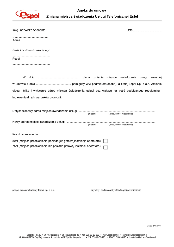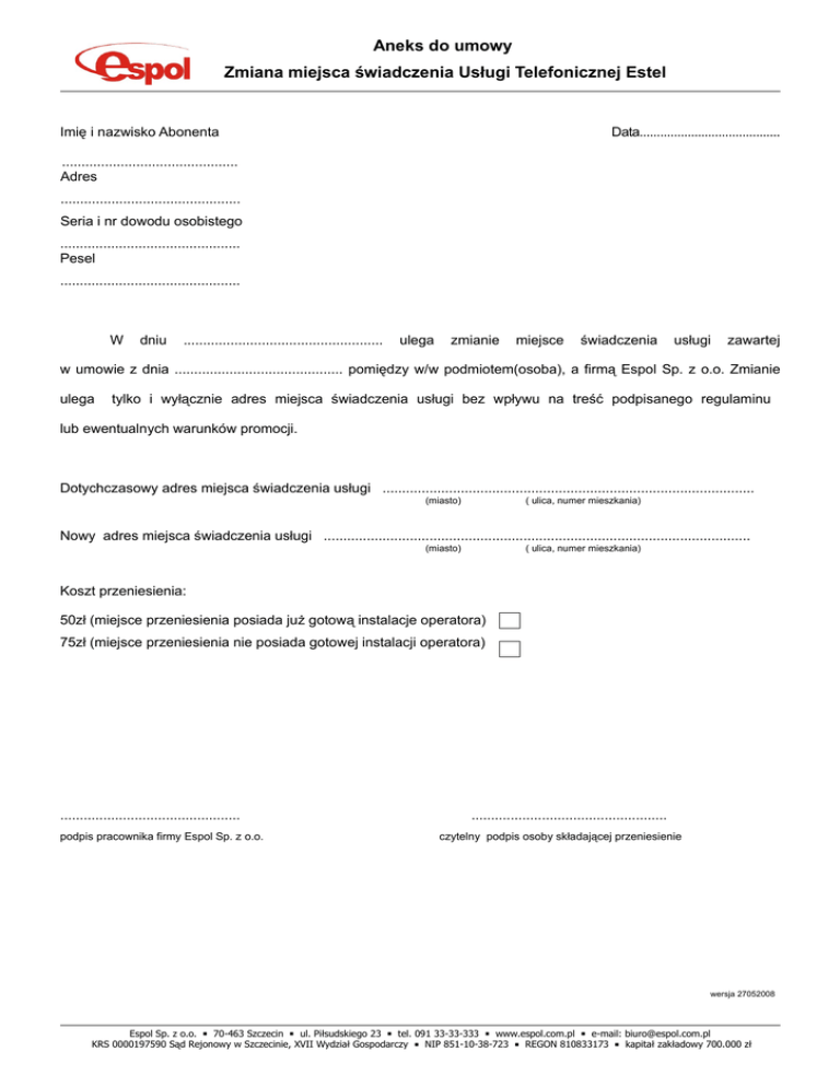 Aneks do umowy Zmiana miejsca świadczenia Usługi Telefonicznej Estel Imię i nazwisko Abonenta Data......................................... ............................................. Adres .............................................. Seria i nr dowodu osobistego .............................................. Pesel .............................................. W dniu ................................................... ulega zmianie miejsce świadczenia usługi zawartej w umowie z dnia ........................................... pomiędzy w/w podmiotem(osoba), a firmą Espol Sp. z o.o. Zmianie ulega tylko i wyłącznie adres miejsca świadczenia usługi bez wpływu na treść podpisanego regulaminu lub ewentualnych warunków promocji. Dotychczasowy adres miejsca świadczenia usługi ............................................................................................... (miasto) ( ulica, numer mieszkania) Nowy adres miejsca świadczenia usługi ............................................................................................................. (miasto) ( ulica, numer mieszkania) Koszt przeniesienia: 50zł (miejsce przeniesienia posiada już gotową instalacje operatora) 75zł (miejsce przeniesienia nie posiada gotowej instalacji operatora) .............................................. podpis pracownika firmy Espol Sp. z o.o. .................................................. czytelny podpis osoby składającej przeniesienie wersja 27052008 Espol Sp. z o.o. 70-463 Szczecin ul. Piłsudskiego 23 tel. 091 33-33-333 www.espol.com.pl e-mail: [email protected] KRS 0000197590 Sąd Rejonowy w Szczecinie, XVII Wydział Gospodarczy NIP 851-10-38-723 REGON 810833173 kapitał zakładowy 700.000 zł