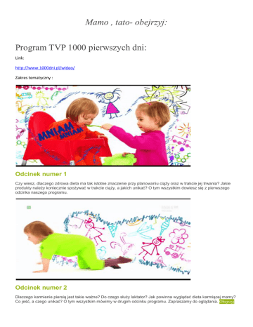 Mamo , tato- obejrzyj: Program TVP 1000 pierwszych dni: Link: http://www.1000dni.pl/wideo/ Zakres tematyczny : Odcinek numer 1 Czy wiesz, dlaczego zdrowa dieta ma tak istotne znaczenie przy planowaniu ciąży oraz w trakcie jej trwania? Jakie produkty należy koniecznie spożywać w trakcie ciąży, a jakich unikać? O tym wszystkim dowiesz się z pierwszego odcinka naszego programu. Odcinek numer 2 Dlaczego karmienie piersią jest takie ważne? Do czego służy laktator? Jak powinna wyglądać dieta karmiącej mamy? Co jeść, a czego unikać? O tym wszystkim mówimy w drugim odcinku programu. Zapraszamy do oglądania. Obejrzyj Odcinek numer 3 Czy wiesz w jaki sposób i o jakie produktu rozszerzać dietę swojego dziecka? Kiedy zacząć wprowadzać nowe pokarmy i czy jest różnica pomiędzy dziećmi karmionymi piersią i dziećmi karmionymi butelką? Tego dowiesz się oglądając trzeci odcinek naszego programu. Obejrzyj Odcinek numer 4 Czy wiesz, w jakiej kolejności wprowadzać warzywa i owoce do diety dziecka? Dlaczego wspólne przygotowywanie i jedzenie posiłków jest takie ważne? Jak zachęcać niejadka do poznawania nowych smaków? W czwartym odcinku naszego programu rozmawiamy też o roli taty w żywieniu. Zapraszamy serdecznie.Obejrzyj Odcinek numer 5 Jak przygotować bezpieczne menu na pierwsze urodziny? Dlaczego warto unikać niezdrowych przekąsek i jak to robić? Czego wymagać od żywienia w żłobku? Jak zdrowo i higienicznie karmić dziecko na spacerze? Na co zwrócić uwagę babci? O tym wszystkim dowiesz się, oglądając piąty odcinek naszego programu.Obejrzyj Odcinek numer 6 Talerzyk żywienia dziecka po 1. roku życia – co to takiego i jak to się je? O jakich produktach należy zawsze pamiętać? Czy dziecko może jeść te same potrawy co dorośli? Jak radzić sobie z buntem dwulatka w sklepie spożywczym? Co to jest neofobia? Jak zachęcać dziecko do jedzenia, a nie zmuszać? Zapraszamy na ostatni odcinek naszego programu. Obejrzyj