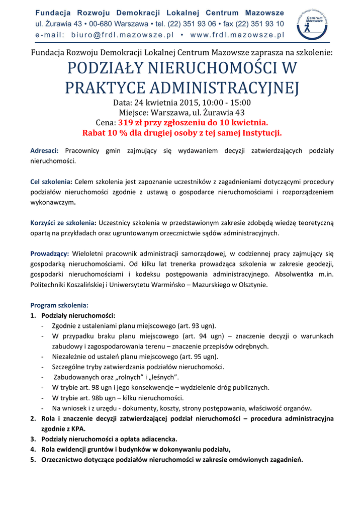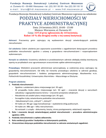 Fundacja Rozwoju Demokracji Lokalnej Centrum Mazowsze zaprasza na szkolenie: PODZIAŁY NIERUCHOMOŚCI W PRAKTYCE ADMINISTRACYJNEJ Data: 24 kwietnia 2015, 10:00 - 15:00 Miejsce: Warszawa, ul. Żurawia 43 Cena: 319 zł przy zgłoszeniu do 10 kwietnia. Rabat 10 % dla drugiej osoby z tej samej Instytucji. Adresaci: Pracownicy gmin zajmujący się wydawaniem decyzji zatwierdzających podziały nieruchomości. Cel szkolenia: Celem szkolenia jest zapoznanie uczestników z zagadnieniami dotyczącymi procedury podziałów nieruchomości zgodnie z ustawą o gospodarce nieruchomościami i rozporządzeniem wykonawczym. Korzyści ze szkolenia: Uczestnicy szkolenia w przedstawionym zakresie zdobędą wiedzę teoretyczną opartą na przykładach oraz ugruntowanym orzecznictwie sądów administracyjnych. Prowadzący: Wieloletni pracownik administracji samorządowej, w codziennej pracy zajmujący się gospodarką nieruchomościami. Od kilku lat trenerka prowadząca szkolenia w zakresie geodezji, gospodarki nieruchomościami i kodeksu postępowania administracyjnego. Absolwentka m.in. Politechniki Koszalińskiej i Uniwersytetu Warmińsko – Mazurskiego w Olsztynie. Program szkolenia: 1. Podziały nieruchomości: - Zgodnie z ustaleniami planu miejscowego (art. 93 ugn). - W przypadku braku planu miejscowego (art. 94 ugn) – znaczenie decyzji o warunkach zabudowy i zagospodarowania terenu – znaczenie przepisów odrębnych. - Niezależnie od ustaleń planu miejscowego (art. 95 ugn). - Szczególne tryby zatwierdzania podziałów nieruchomości. - Zabudowanych oraz „rolnych” i „leśnych”. - W trybie art. 98 ugn i jego konsekwencje – wydzielenie dróg publicznych. - W trybie art. 98b ugn – kilku nieruchomości. - Na wniosek i z urzędu - dokumenty, koszty, strony postępowania, właściwość organów. 2. Rola i znaczenie decyzji zatwierdzającej podział nieruchomości – procedura administracyjna zgodnie z KPA. 3. Podziały nieruchomości a opłata adiacencka. 4. Rola ewidencji gruntów i budynków w dokonywaniu podziału, 5. Orzecznictwo dotyczące podziałów nieruchomości w zakresie omówionych zagadnień. ZGŁOSZENIE PODZIAŁY NIERUCHOMOŚCI W PRAKTYCE ADMINISTRACYJNEJ Data: 24 kwietnia 2015, 10:00 - 15:00 Miejsce: Warszawa, ul. Żurawia 43 Cena: 319 zł przy zgłoszeniu do 10 kwietnia. Rabat 10 % dla drugiej osoby z tej samej Instytucji. Instytucja (dane do faktury): ................................................................................................ Adres: ................................................................................................................................. NIP: ..................................................................................................................................... L.p. Imię i nazwisko Wydział tel. e-mail 1.......................................................................................................................................... 2.......................................................................................................................................... 3.......................................................................................................................................... ........................................................... podpis i pieczątka osoby delegującej Zgłoszenia prosimy przesyłać do 17 kwietnia 2015 r. fax: (22) 351 93 10, e-mail: [email protected] lub wybrać opcje zapisu przez stronę www.frdl.mazowsze.pl Przy zgłoszeniu w ramach Forów prosimy o wpisanie w uwagach: „Zgłoszenie w ramach Forum (nazwa odpowiedniego Forum)”. Ewentualną rezygnację ze szkolenia można zgłosić najpóźniej na dwa dni robocze przed szkoleniem. W przypadku niewykorzystania zgłoszonego uczestnictwa - Urząd będzie zobowiązany do sfinansowania 60% odpłatności za uczestnictwo i materiały. FRDL zastrzega sobie prawo odwołania szkolenia. Miejsce szkolenia: Warszawa, ul. Żurawia 43. Lokalizacja 300 metrów od Metra Centrum. Cena: 319 zł netto przy zgłoszeniu do 10 kwietnia. Cena po 10 kwietnia to 369 zł. Rabat 10 % dla drugiej osoby z tej samej Instytucji. Zwolnienie z VAT w przypadku finansowania ze środków publicznych. W cenie materiały szkoleniowe, zaświadczenie, lunch oraz przerwy kawowe. Płatność przelewem, na podstawie faktury wystawionej w dniu szkolenia.
