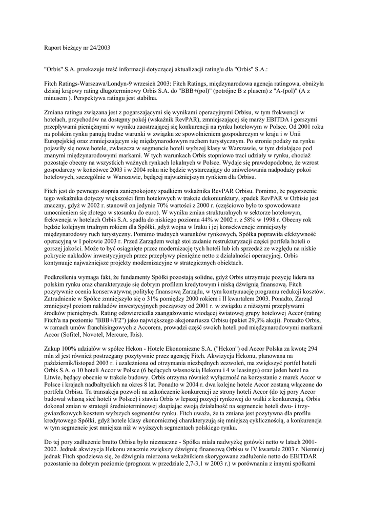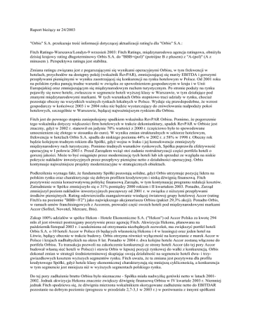 Fitch'a na poziomie "BBB+/F2") jako największego akcjonariusza Orbisu (pakiet 29,3% akcji). Ponadto Orbis,