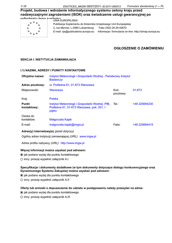 ENOTICES_IMiGW 08/07/2011- ID:2011-095512 1/ 29 Formularz standardowy 2 — PL Projekt, budowa i wdrożenie informatycznego systemu osłony kraju przed nadzwyczajnymi zagrożeniami (ISOK) oraz świadczenie usługi gwarancyjnej po wdrożeniu tego systemu. UNIA EUROPEJSKA Publikacja Suplementu do Dziennika Urzędowego Unii Europejskiej 2, rue Mercier, L-2985 Luksemburg Faks (352) 29 29-42670 E-mail: [email protected] Informacje i formularze on-line: http://simap.europa.eu OGŁOSZENIE O ZAMÓWIENIU SEKCJA I: INSTYTUCJA ZAMAWIAJĄCA I.1) NAZWA, ADRESY I PUNKTY KONTAKTOWE Oficjalna nazwa: Instytut Meteorologii i Gospodarki Wodnej - Państwowy Instytut Badawczy Adres pocztowy: ul. Podleśna 61, 01-673 Warszawa Miejscowość: Warszawa Kraj: Polska Punkt kontaktowy: Instytut Meteorologii i Gospodarki Wodnej -PIB, Podleśna 61, 01-673 Warszawa, pok. 201, I piętro Osoba do kontaktów: Małgorzata Kajak E-mail: [email protected] Kod pocztowy: 01-673 Tel.: +48 225694230 Faks: +48 225694415 Adres(y) internetowy(e) (jeżeli dotyczy) Ogólny adres instytucji zamawiającej (URL): www.imgw.pl Adres profilu nabywcy (URL): http://www.imgw.pl Więcej informacji można uzyskać pod adresem: jak podano wyżej dla punktu kontaktowego inny: proszę wypełnić załącznik A.I Specyfikacje i dokumenty dodatkowe (w tym dokumenty dotyczące dialogu konkurencyjnego oraz Dynamicznego Systemu Zakupów) można uzyskać pod adresem: jak podano wyżej dla punktu kontaktowego inny: proszę wypełnić załącznik A.II Oferty lub wnioski o dopuszczenie do udziału w postępowaniu należy przesyłać na adres: jak podano wyżej dla punktu kontaktowego inny: proszę wypełnić załącznik A.III ENOTICES_IMiGW 08/07/2011- ID:2011-095512 2/ 29 Formularz standardowy 2 — PL Projekt, budowa i wdrożenie informatycznego systemu osłony kraju przed nadzwyczajnymi zagrożeniami (ISOK) oraz świadczenie usługi gwarancyjnej po wdrożeniu tego systemu. I.2) RODZAJ INSTYTUCJI ZAMAWIAJĄCEJ I GŁÓWNY PRZEDMIOT LUB PRZEDMIOTY DZIAŁALNOŚCI Ministerstwo lub inny organ krajowy lub federalny, w tym jednostki regionalne i lokalne Agencja/Urząd krajowy lub federalny Ogólne usługi publiczne Organ władzy regionalnej lub lokalnej Środowisko Agencja/Urząd regionalny lub lokalny Podmiot prawa publicznego Instytucja/agencja europejska lub organizacja międzynarodowa Inne (proszę określić): Państwowy Instytut Badawczy Obrona Porządek i bezpieczeństwo publiczne Sprawy gospodarcze i finansowe Zdrowie Budownictwo i obiekty komunalne Ochrona socjalna Rekreacja, kultura i religia Edukacja Inne (proszę określić): meteorologia, hydrologia Instytucja zamawiająca dokonuje zakupu w imieniu innych instytucji zamawiających: tak nie ENOTICES_IMiGW 08/07/2011- ID:2011-095512 3/ 29 Formularz standardowy 2 — PL Projekt, budowa i wdrożenie informatycznego systemu osłony kraju przed nadzwyczajnymi zagrożeniami (ISOK) oraz świadczenie usługi gwarancyjnej po wdrożeniu tego systemu. SEKCJA II: PRZEDMIOT ZAMÓWIENIA II.1) OPIS II.1.1) Nazwa nadana zamówieniu przez instytucję zamawiającą Projekt, budowa i wdrożenie informatycznego systemu osłony kraju przed nadzwyczajnymi zagrożeniami (ISOK) oraz świadczenie usługi gwarancyjnej po wdrożeniu tego systemu. II.1.2) Rodzaj zamówienia oraz lokalizacja robót budowlanych, miejsce realizacji dostawy lub świadczenia usług (Wybrać wyłącznie jedną kategorię – roboty budowlane, dostawy lub usługi – która najbardziej odpowiada konkretnemu przedmiotowi zamówienia lub zakupu) a) Roboty budowlane Wykonanie b) Dostawy Kupno Zaprojektowanie i wykonanie Dzierżawa Wykonanie, za pomocą dowolnych środków, obiektu budowlanego, odpowiadającego wymogom określonym przez instytucję zamawiającą Najem c) Usługi Kategoria usługi: nr (dla usług kategorii 1-27 zob. załącznik II do dyrektywy 2004/18/ WE) Leasing Połączenie powyższych form Główne miejsce lub lokalizacja robót budowlanych Główne miejsce realizacji dostawy Główne miejsce świadczenia usług Kod NUTS II.1.3) Ogłoszenie dotyczy Zamówienia publicznego Zawarcia umowy ramowej Utworzenia dynamicznego systemu zakupów (DSZ) II.1.4) Informacje na temat umowy ramowej (jeżeli dotyczy) Umowa ramowa z kilkoma wykonawcami Umowa ramowa z jednym wykonawcą Liczba LUB, jeżeli dotyczy,maksymalna liczba uczestników planowanej umowy ramowej Czas trwania umowy ramowej: Okres w latach: lub miesiącach: Uzasadnienie dla umowy ramowej, której czas trwania przekracza okres czterech lat: Szacunkowa całkowita wartość zakupów w całym okresie obowiązywania umowy ramowej (jeżeli dotyczy; podać wyłącznie dane liczbowe): Szacunkowa wartość bez VAT: LUB Zakres: między Waluta: a Waluta: Częstotliwość oraz wartość zamówień, które zostaną udzielone (jeżeli możliwe do określenia):: 4/ 29 ENOTICES_IMiGW 08/07/2011- ID:2011-095512 Formularz standardowy 2 — PL Projekt, budowa i wdrożenie informatycznego systemu osłony kraju przed nadzwyczajnymi zagrożeniami (ISOK) oraz świadczenie usługi gwarancyjnej po wdrożeniu tegozamówienia systemu.lub zakupu(ów) II.1.5) Krótki opis IV. OPIS PRZEDMIOTU ZAMÓWIENIA Zamówienie pn. „Projekt, budowa i wdrożenie informatycznego systemu osłony kraju przed nadzwyczajnymi zagrożeniami oraz świadczenie usługi gwarancyjnej po wdrożeniu tego systemu” jest elementem projektu pn. „Informatyczny System Osłony Kraju przed nadzwyczajnymi zagrożeniami” (w skrócie Projekt ISOK), realizowanego w ramach VII osi priorytetowej Programu Operacyjnego Innowacyjna Gospodarka. Zasadniczym przedmiotem wykonania zamówienia jest system informatyczny pod nazwą System ISOK (System). Opracowany i wdrożony System ma stanowić wsparcie osłony kraju w momencie wystąpienia nadzwyczajnych zagrożeń, w szczególności ma służyć zwiększeniu bezpieczeństwa obywateli oraz ograniczeniu strat spowodowanych występowaniem zagrożeń. System ISOK będzie konsolidował informacje z istniej