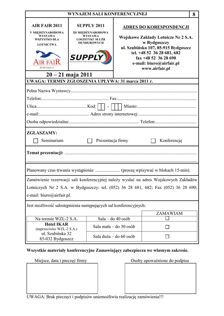 WYNAJEM SALI KONFERENCYJNEJ AIR FAIR 2011 SUPPLY 2011 V MIĘDZYNARODOWA WYSTAWA WSZYSTKO DLA III MIĘDZYNARODOWA WYSTAWA LOGISTYKI SŁUśB MUNDUROWYCH LOTNICTWA 8 ADRES DO KORESPONDENCJI Wojskowe Zakłady Lotnicze Nr 2 S.A. w Bydgoszczy ul. Szubińska 107, 85-915 Bydgoszcz tel. +48 52 36 28 681, 682 fax +48 52 36 28 690 e-mail: [email protected] www.airfair.pl 20 – 21 maja 2011 UWAGA: TERMIN ZGŁOSZENIA UPŁYWA: 31 marca 2011 r. Pełna Nazwa Wystawcy................................................................................................................ Telefon:........................................................... Fax:...................................................................... Ulica............................................ Kod: - Miasto:.................................................... e-mail:............................................ Adres strony internetowej:.................................................... Osoba odpowiedzialna:.............................................................. Telefon:.................................... ZGŁASZAMY: Seminarium Prezentacja firmy Konferencję Temat prezentacji: ..................................................................................................................... ....................................................................................................................................................... Planowany czas trwania wystąpienia: ...................... (proszę wpisywać w blokach 15-min). Zamówienie rezerwacji sali konferencyjnej naleŜy wysłać na adres Wojskowych Zakładów Lotniczych Nr 2 S.A. w Bydgoszczy: tel. (052) 36 28 681, 682; Fax (052) 36 28 690; e-mail: [email protected]. Jest moŜliwość udostępnienia następujących sal konferencyjnych: ZAMAWIAM Na terenie WZL-2 S.A. Hotel IKAR (naprzeciwko WZL-2 S.A.) ul. Szubińska 32 85-032 Bydgoszcz Sala – do 40 osób Sala mała – do 30 osób Sala duŜa – do 60 osób k k Wszystkie materiały konferencyjne Zamawiający zabezpiecza we własnym zakresie. Miejsce, data i pieczęć firmy Osoby upowaŜnione do podpisu UWAGA: Brak pieczęci i podpisów uniemoŜliwia realizację zamówienia!!!