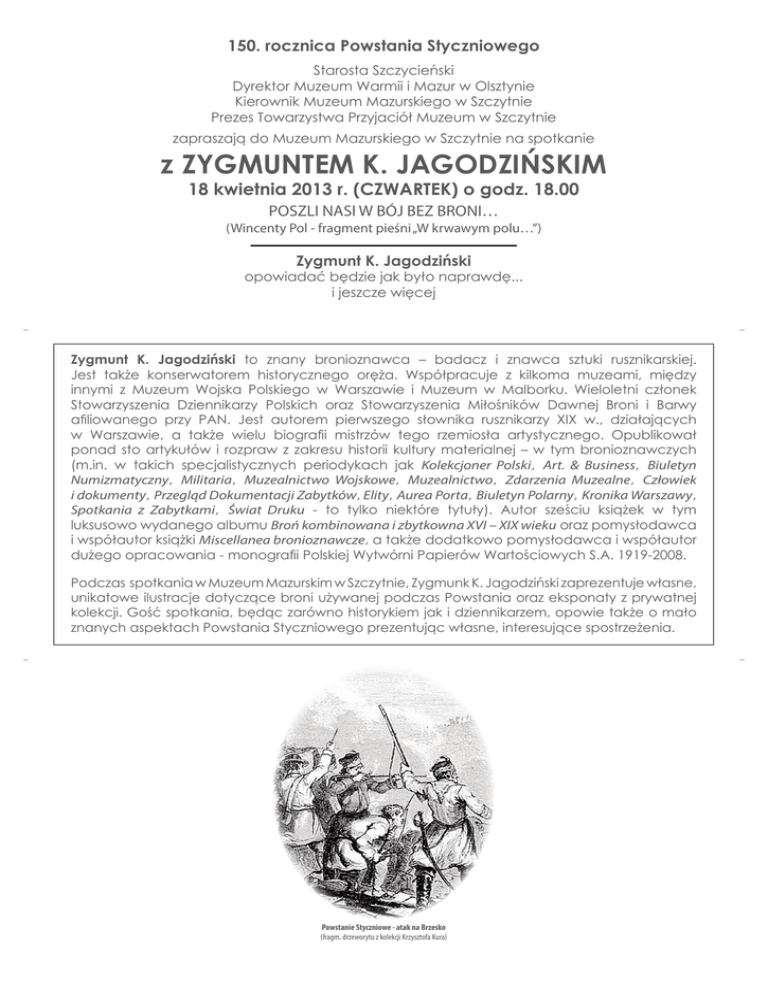 150. rocznica Powstania Styczniowego Starosta Szczycieński Dyrektor Muzeum Warmii i Mazur w Olsztynie Kierownik Muzeum Mazurskiego w Szczytnie Prezes Towarzystwa Przyjaciół Muzeum w Szczytnie zapraszają do Muzeum Mazurskiego w Szczytnie na spotkanie z ZYGMUNTEM K. JAGODZIŃSKIM 18 kwietnia 2013 r. (CZWARTEK) o godz. 18.00 POSZLI NASI W BÓJ BEZ BRONI… (Wincenty Pol - fragment pieśni „W krwawym polu…”) Zygmunt K. Jagodziński opowiadać będzie jak było naprawdę... i jeszcze więcej Zygmunt K. Jagodziński to znany bronioznawca – badacz i znawca sztuki rusznikarskiej. Jest także konserwatorem historycznego oręża. Współpracuje z kilkoma muzeami, między innymi z Muzeum Wojska Polskiego w Warszawie i Muzeum w Malborku. Wieloletni członek Stowarzyszenia Dziennikarzy Polskich oraz Stowarzyszenia Miłośników Dawnej Broni i Barwy afiliowanego przy PAN. Jest autorem pierwszego słownika rusznikarzy XIX w., działających w Warszawie, a także wielu biografii mistrzów tego rzemiosła artystycznego. Opublikował ponad sto artykułów i rozpraw z zakresu historii kultury materialnej – w tym bronioznawczych (m.in. w takich specjalistycznych periodykach jak Kolekcjoner Polski, Art. & Business, Biuletyn Numizmatyczny, Militaria, Muzealnictwo Wojskowe, Muzealnictwo, Zdarzenia Muzealne, Człowiek i dokumenty, Przegląd Dokumentacji Zabytków, Elity, Aurea Porta, Biuletyn Polarny, Kronika Warszawy, Spotkania z Zabytkami, Świat Druku - to tylko niektóre tytuły). Autor sześciu książek w tym luksusowo wydanego albumu Broń kombinowana i zbytkowna XVI – XIX wieku oraz pomysłodawca i współautor książki Miscellanea bronioznawcze, a także dodatkowo pomysłodawca i współautor dużego opracowania - monografii Polskiej Wytwórni Papierów Wartościowych S.A. 1919-2008. Podczas spotkania w Muzeum Mazurskim w Szczytnie, Zygmunk K. Jagodziński zaprezentuje własne, unikatowe ilustracje dotyczące broni używanej podczas Powstania oraz eksponaty z prywatnej kolekcji. Gość spotkania, będąc zarówno historykiem jak i dziennikarzem, opowie także o mało znanych aspektach Powstania Styczniowego prezentując własne, interesujące spostrzeżenia. Powstanie Styczniowe - atak na Brzesko (fragm. drzeworytu z kolekcji Krzysztofa Kura) ZADANIE ZREALIZOWANE PRZY WSPARCIU FINANSOWYM: ZAPROSZENIE ORGANIZACJA I WSPARCIE: POWIAT SZCZYCIEŃSKI MECENAS MUZEUM WARMII I MAZUR 2008, 2009, 2010, 2011 DZIAŁALNOŚĆ MUZEUM MAZURSKIEGO W SZCZYTNIE I TOWARZYSTWA PRZYJACIÓŁ MUZEUM W SZCZYTNIE WSPIERAJĄ POWIAT SZCZYCIEŃSKI MECENAS MUZEUM WARMII I MAZUR 2008, 2009, 2010, 2011 WIESŁAW KOBUS Firma Remontowo-Budowlana MECENAS MUZEUM WARMII I MAZUR 2006, 2009, 2010, 2011 BOGUSŁAWA I DARIUSZ HODKOWSCY MECENAS MUZEUM WARMII I MAZUR 2009 GRAŻYNA I ANDRZEJ ALBRECHT Restauracja ZACISZE MECENAS MUZEUM WARMII I MAZUR 2008 SAMORZĄD MIASTA SZCZYTNO MECENAS MUZEUM WARMII I MAZUR 2007, 2011 WITOLD CZUJAK Studio Foto ŁUCJA ZIPPER-NOWAKOWSKA Prezes Towarzystwa Przyjaciół Muzeum w Szczytnie DANUTA MORAWSKA ZBIGNIEW NOWAKOWSKI Muzeum Mazurskie w Szczytnie Oddział Muzeum Warmii i Mazur w Olsztynie Instytucja Województwa Warmińsko-Mazurskiego ul. Sienkiewicz 1, 12-100 Szczytno tel. 89 624 24 37, tel/faks 89 624 89 25, www.muzeumszczytno.art.pl, [email protected]