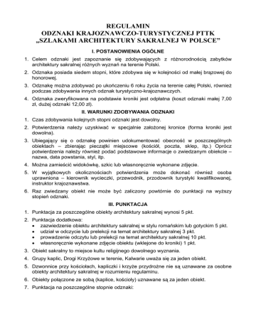 REGULAMIN ODZNAKI KRAJOZNAWCZO-TURYSTYCZNEJ PTTK „SZLAKAMI ARCHITEKTURY SAKRALNEJ W POLSCE” I. POSTANOWIENIA OGÓLNE 1. Celem odznaki jest zapoznanie się zdobywających z różnorodnością zabytków architektury sakralnej różnych wyznań na terenie Polski. 2. Odznaka posiada siedem stopni, które zdobywa się w kolejności od małej brązowej do honorowej. 3. Odznakę można zdobywać po ukończeniu 6 roku życia na terenie całej Polski, również podczas zdobywania innych odznak turystyczno-krajoznawczych. 4. Odznaka zweryfikowana na podstawie kroniki jest odpłatna (koszt odznaki małej 7,00 zł, dużej odznaki 12,00 zł). II. WARUNKI ZDOBYWANIA ODZNAKI 1. Czas zdobywania kolejnych stopni odznaki jest dowolny. 2. Potwierdzenia należy uzyskiwać w specjalnie założonej kronice (forma kroniki jest dowolna). 3. Ubiegający się o odznakę powinien udokumentować obecność w poszczególnych obiektach – zbierając pieczątki miejscowe (kościół, poczta, sklep, itp.) Oprócz potwierdzenia należy również podać podstawowe informacje o zwiedzanym obiekcie – nazwa, data powstania, styl, itp. 4. Można zamieścić widokówkę, szkic lub własnoręcznie wykonane zdjęcie. 5. W wyjątkowych okolicznościach potwierdzenia może dokonać również osoba uprawniona – kierownik wycieczki, przewodnik, przodownik turystyki kwalifikowanej, instruktor krajoznawstwa. 6. Raz zwiedzany obiekt nie może być zaliczony powtórnie do punktacji na wyższy stopień odznaki. III. PUNKTACJA 1. Punktacja za poszczególne obiekty architektury sakralnej wynosi 5 pkt. 2. Punktacja dodatkowa: • zazwiedzenie obiektu architektury sakralnej w stylu romańskim lub gotyckim 5 pkt. • udział w odczycie lub prelekcji na temat architektury sakralnej 3 pkt. • prowadzenie odczytu lub prelekcji na temat architektury sakralnej 10 pkt. • własnoręcznie wykonane zdjęcie obiektu (wklejone do kroniki) 1 pkt. 3. Obiekt sakralny to miejsce kultu religijnego dowolnego wyznania. 4. Grupy kaplic, Drogi Krzyżowe w terenie, Kalwarie uważa się za jeden obiekt. 5. Dzwonnice przy kościołach, kapliczki i krzyże przydrożne nie są uznawane za osobne obiekty architektury sakralnej w rozumieniu regulaminu. 6. Obiekty połączone ze sobą (kaplice, kościoły) uznawane są za jeden obiekt. 7. Punktacja na poszczególne stopnie odznaki: Stopień odznaki Liczba punktów Mały brązowy 100 Mały srebrny 250 Mały złoty 500 Duży brązowy 1000 Duży srebrny 2000 Duży złoty 3000 Honorowy 5000 8. Odznaka honorowa może być nadawana wielokrotnie po spełnieniu przynależnej normy. 9. Aby zdobyć odznakę w stopniu dużym złotym należy odwiedzić Łódź i zwiedzić kościoły przedstawione na odznace: Katedrę łódzką pw. Św. Stanisława Kostki, cerkiew katedralną pw. Św. Aleksandra Newskiego oraz kościół ewangelickoaugsburski pw. Św. Mateusza. IV. WERYFIKACJA ODZNAKI 1. Weryfikacji odznaki dokonuje się na podstawie kroniki zawierającej spełnienie warunków odpowiedniego stopnia odznaki. 2. Weryfikacji dokonuje Zespół Weryfikacyjny Odznaki „Szlakami Architektury Sakralnej w Polsce”. 3. Przy przedłożeniu kroniki do weryfikacji odznak dużych lub nadania odznaki honorowej należy dołączyć spis obiektów zwiedzonych na poprzednie stopnie odznaki. 4. Kroniki należy nadsyłać na adres: Komisja Krajoznawcza Oddziału Łódzkiego PTTK im. J. Czeraszkiewicza, 90-301 Łódź, ul. Wigury 12a lub PKS „ARKA” KSS RP – 139 przy Parafii Podwyższenia Św. Krzyża 90-009 Łódź, ul. Sienkiewicza 38. 5. Turyści spoza Łodzi przesyłają kronikę na podane adresy drogą pocztową, załączając zaadresowaną kopertę ze znaczkiem na przesyłkę zwrotną. 6. Na życzenie zdobywającego do zweryfikowanej kroniki po uiszczeniu opłaty dołącza się odznaki (kronika i odznaki zostają odesłane „za pobraniem”). V. POSTANOWIENIA KOŃCOWE 1. Odznaka została ustanowiona z inicjatywy Parafialnego Klubu Sportowego „ARKA” Katolickiego Stowarzyszenia Sportowego RP-139 oraz Komisji Kultury i Wychowania Rady Osiedla „Katedralna” w Łodzi przy współpracy Komisji Krajoznawczej Oddziału Łódzkiego PTTK. 2. Patronat nad odznaką w stopniu dużym objął Prezydent Miasta Łodzi. 3. Interpretacja niniejszego regulaminu należy do Zespołu Weryfikacyjnego Odznaki, który może przyznawać Odznaki Honorowe poza w/w wymaganiami. 4. Regulamin Odznaki został zaakceptowany przez Zarząd Oddziału Łódzkiego PTTK im. J. Czeraszkiewicza w dniu 17.03.2003 r. 5. Zarząd Główny PTTK zatwierdził niniejszy regulamin uchwałą nr 116 A/2003 z dnia 27.08.2003 r. 6. Regulamin został uzupełniony dnia 03.03.2004 r. 7. Regulamin opracowali Instruktorzy Krajoznawstwa: Krzysztof Góra i Paweł Jan Chmura. 8. Autor graficznego projektu Odznaki: Aneta Tomczak. 2