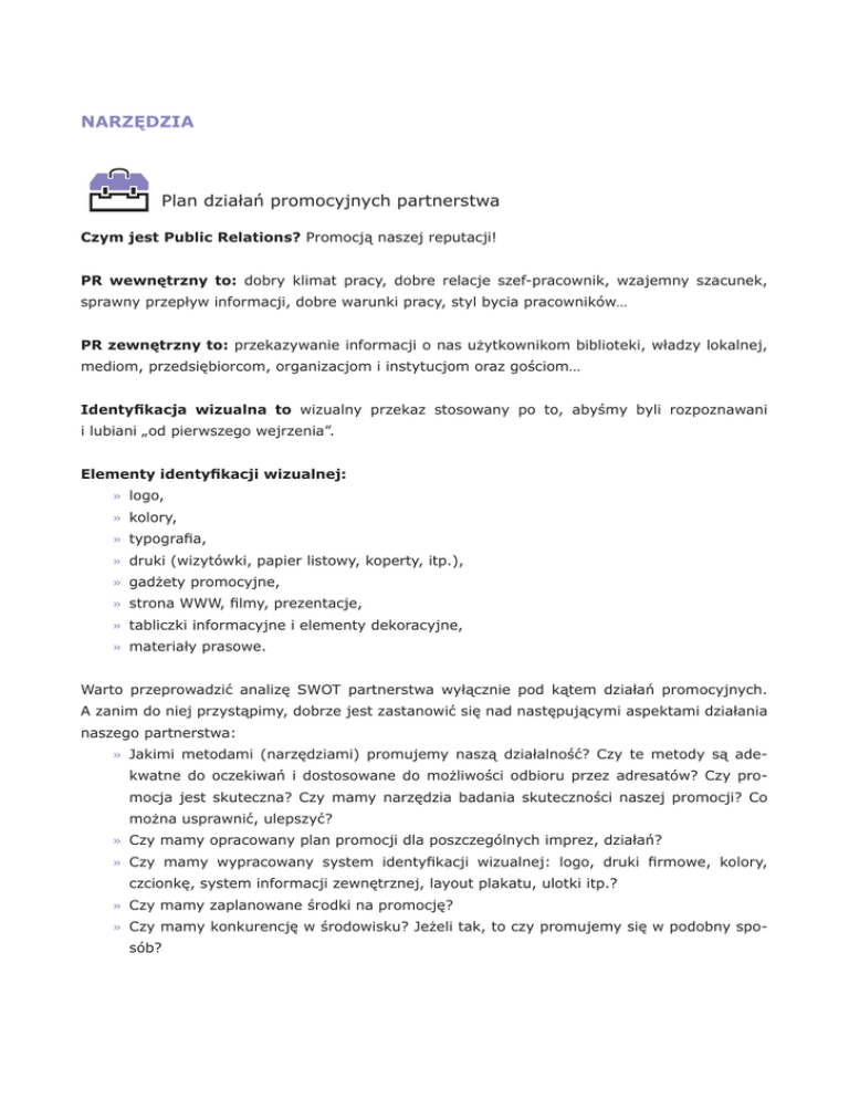 Przepis na współpracę w bibliotece Część II NARZĘDZIA Plan działań promocyjnych partnerstwa Czym jest Public Relations? Promocją naszej reputacji! PR wewnętrzny to: dobry klimat pracy, dobre relacje szef-pracownik, wzajemny szacunek, sprawny przepływ informacji, dobre warunki pracy, styl bycia pracowników… PR zewnętrzny to: przekazywanie informacji o nas użytkownikom biblioteki, władzy lokalnej, mediom, przedsiębiorcom, organizacjom i instytucjom oraz gościom… Identyfikacja wizualna to wizualny przekaz stosowany po to, abyśmy byli rozpoznawani i lubiani „od pierwszego wejrzenia”. Elementy identyfikacji wizualnej: »» logo, »» kolory, »» typografia, »» druki (wizytówki, papier listowy, koperty, itp.), »» gadżety promocyjne, »» strona WWW, filmy, prezentacje, »» tabliczki informacyjne i elementy dekoracyjne, »» materiały prasowe. Warto przeprowadzić analizę SWOT partnerstwa wyłącznie pod kątem działań promocyjnych. A zanim do niej przystąpimy, dobrze jest zastanowić się nad następującymi aspektami działania naszego partnerstwa: »» Jakimi metodami (narzędziami) promujemy naszą działalność? Czy te metody są adekwatne do oczekiwań i dostosowane do możliwości odbioru przez adresatów? Czy promocja jest skuteczna? Czy mamy narzędzia badania skuteczności naszej promocji? Co można usprawnić, ulepszyć? »» Czy mamy opracowany plan promocji dla poszczególnych imprez, działań? »» Czy mamy wypracowany system identyfikacji wizualnej: logo, druki firmowe, kolory, czcionkę, system informacji zewnętrznej, layout plakatu, ulotki itp.? »» Czy mamy zaplanowane środki na promocję? »» Czy mamy konkurencję w środowisku? Jeżeli tak, to czy promujemy się w podobny sposób? 136 Przepis na współpracę w bibliotece Część II Słabe/mocne strony – przykłady pytań: 1. W czym jesteśmy lepsi/gorsi od konkurencji, jeżeli chodzi o promocję? 2. Co nas pozytywnie wyróżnia? 3. Czy jesteśmy wystarczająco widoczni w lokalnym krajobrazie? 4. Czy mamy umiejętności i zaplecze technologiczne do korzystania z nowoczesnych narzędzi promocji? 5. Czy mamy stałą osobę (firmę), której zlecamy projekt i skład materiałów graficznych? 6. Czy jest w zespole osoba odpowiedzialna za aktualizację treści na waszych stronach WWW/ blogach/ forach? 7. Czy dysponujemy unikalnymi zdolnościami, zasobami, umiejętnościami, które można wykorzystać w promocji? 8. Czy mamy w zespole osoby odpowiedzialne za promocję? 9. Czy mają one dość czasu na pracę na rzecz promocji? Szanse/zagrożenia – przykłady pytań 1. Jakie są szanse na mocniejsze zaakcentowanie naszej obecności w najbliższym otoczeniu? 2. Czy pojawiają się nowe tendencje, trendy, które możemy wykorzystać? 3. Czy istnieją instytucje lub osoby, które chciałyby wspomóc nasze akcje promocyjne (uzdolnieni wolontariusze – graficy, informatycy, okna wystawowe sklepów, szkoły, kościół, komunikacja publiczna)? 4. Czy nasza gmina ma ciekawą identyfikację wizualną? 5. Czy ktoś z członków partnerstw (wolontariuszy, przyjaciół) interesuje się tematyką promocji, marki, reklamy? Działania PR-owe i promocyjne nie powinny zajmować partnerom zbyt wiele czasu. Warto dobrać sobie narzędzie odpowiednie do naszych możliwości. 137 Lp. Nazwa zadania Opis Harmonogram działań promocyjnych partnerstwa Narzędzia promocyjne Osoba odpowiedzialna Termin wykonania Koszt Przepis na współpracę w bibliotece Część II 138