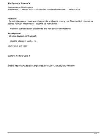 Konfiguracja dovecot'a Napisane przez Piotr Pośpiech Poniedziałek, 11 kwietnia 2011 11:12 - Ostatnio zmieniane Poniedziałek, 11 kwietnia 2011 Problem: Po zainstalowaniu nowej wersji dovecot'a w kliencie poczty (np. Thunderbird) nie można pobrać nowych wiadomości i pojawia się komunikat: Plaintext authentication disallowed one non-secure connections Rozwiązanie: W pliku dovecot.conf wpisać: disable_plaintext_auth = no (domyślnie jest yes) Systam: Fedora Core 4 Żródło: http://www.dovecot.org/list/dovecot/2007-January/019101.html 1/1