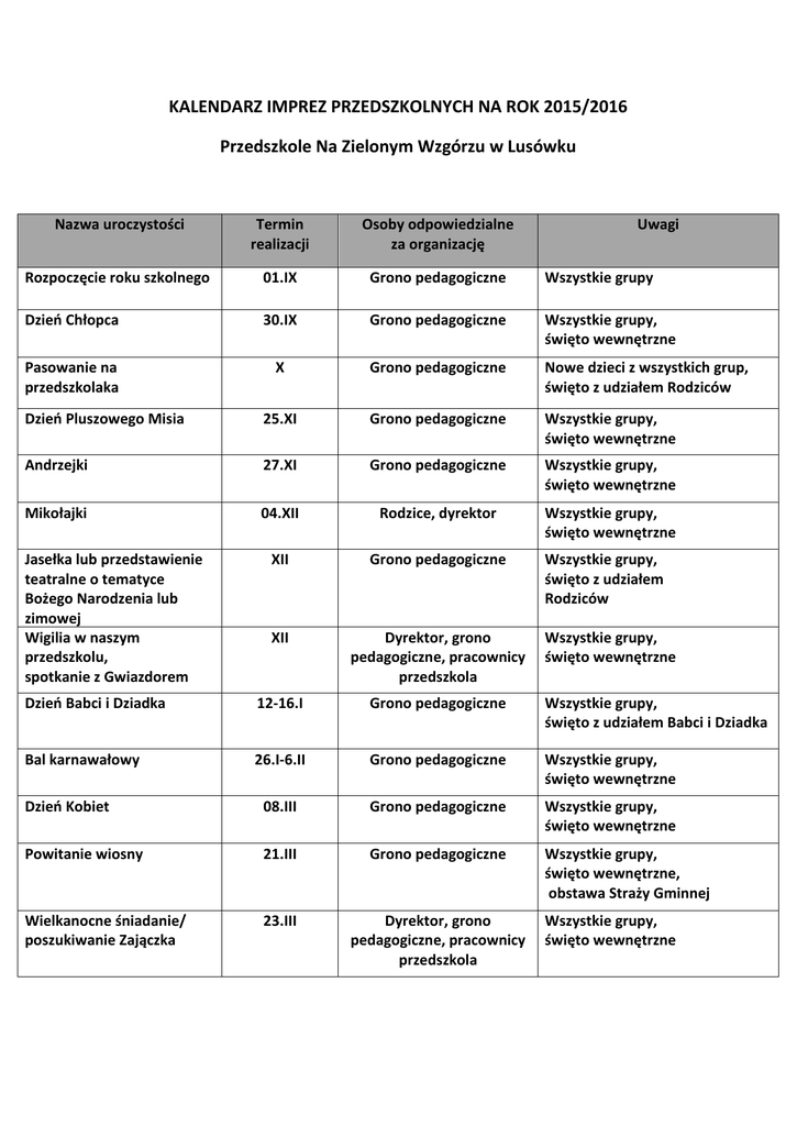 KALENDARZ IMPREZ PRZEDSZKOLNYCH NA ROK 2015/2016 Przedszkole Na Zielonym Wzgórzu w Lusówku Nazwa uroczystości Termin realizacji Osoby odpowiedzialne za organizację Rozpoczęcie roku szkolnego 01.IX Grono pedagogiczne Wszystkie grupy Dzień Chłopca 30.IX Grono pedagogiczne Wszystkie grupy, święto wewnętrzne Pasowanie na przedszkolaka X Grono pedagogiczne Nowe dzieci z wszystkich grup, święto z udziałem Rodziców Dzień Pluszowego Misia 25.XI Grono pedagogiczne Wszystkie grupy, święto wewnętrzne Andrzejki 27.XI Grono pedagogiczne Wszystkie grupy, święto wewnętrzne Mikołajki 04.XII Rodzice, dyrektor Wszystkie grupy, święto wewnętrzne XII Grono pedagogiczne XII Dyrektor, grono pedagogiczne, pracownicy przedszkola Dzień Babci i Dziadka 12-16.I Grono pedagogiczne Wszystkie grupy, święto z udziałem Babci i Dziadka Bal karnawałowy 26.I-6.II Grono pedagogiczne Wszystkie grupy, święto wewnętrzne Dzień Kobiet 08.III Grono pedagogiczne Wszystkie grupy, święto wewnętrzne Powitanie wiosny 21.III Grono pedagogiczne Wszystkie grupy, święto wewnętrzne, obstawa Straży Gminnej Wielkanocne śniadanie/ poszukiwanie Zajączka 23.III Dyrektor, grono pedagogiczne, pracownicy przedszkola Jasełka lub przedstawienie teatralne o tematyce Bożego Narodzenia lub zimowej Wigilia w naszym przedszkolu, spotkanie z Gwiazdorem Uwagi Wszystkie grupy, święto z udziałem Rodziców Wszystkie grupy, święto wewnętrzne Wszystkie grupy, święto wewnętrzne Dzień Matki Ziemi 22.IV Dyrektor, grono pedagogiczne, pracownicy przedszkola Wszystkie grupy, święto wewnętrzne, pasowanie na Młodych Miłośników Przyrody Międzynarodowy Dzień Rodziny - festyn Rodzinny 20.V Rodzice, dyrektor, grono pedagogiczne, pracownicy przedszkola Wszystkie grupy, święto z udziałem Rodziców Gminna spartakiada przedszkolna V/VI Grono pedagogiczne Dzień Dziecka - wycieczka VI Rodzice, dyrektor, grono pedagogiczne, pracownicy przedszkola Wszystkie grupy, wycieczka Pożegnanie przedszkola w grupach starszych 17.VI Nauczycielki grup starszych Grupy: Mrówki i Świerszcze, święto z udziałem Rodziców Zakończenie roku szkolnego 24.VI Grono pedagogiczne Wszystkie grupy Pro Sinfonika 1x w m-cu GOKiS Wszystkie grupy Teatr dla dzieci 1x w m-cu Dyrektor Wszystkie grupy Spotkania z książką Cały rok Grono pedagogiczne Wszystkie grupy Koła zainteresowań 1x w m-cu Grono pedagogiczne Wszystkie grupy Konkursy i quizy tematyczne dla dzieci i rodziców Wg potrzeb Grono pedagogiczne Wszystkie grupy Udział reprezentantów przedszkola Ustalone terminy mogą ulec zmianie Szczegółowe informacje o terminach i sposobie realizacji - u nauczycielek grup.