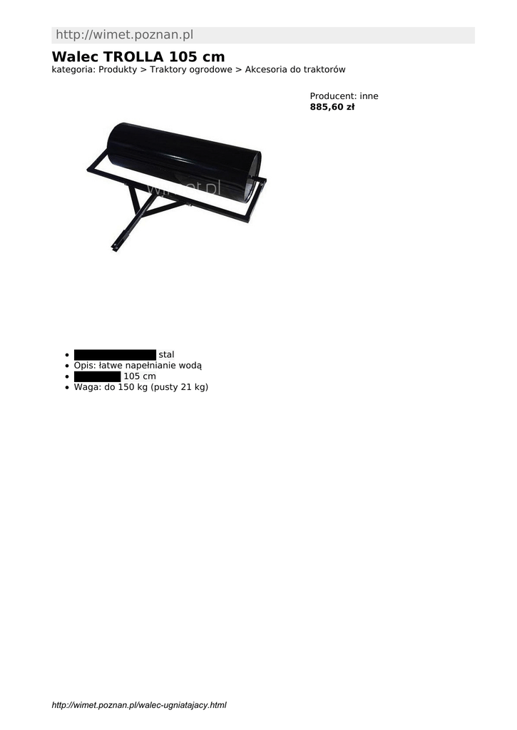 http://wimet.poznan.pl Walec TROLLA 105 cm kategoria: Produkty > Traktory ogrodowe > Akcesoria do traktorów Producent: inne 885,60 zł Materiał podwozia: stal Opis: łatwe napełnianie wodą Szerokość: 105 cm Waga: do 150 kg (pusty 21 kg) http://wimet.poznan.pl/walec-ugniatajacy.html