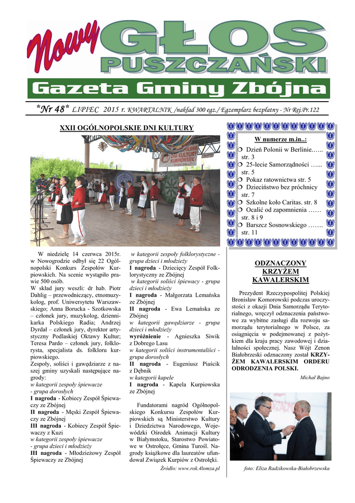 *Nr 48* LIPIEC 2015 r. KWARTALNIK /nakład 300 egz./ Egzemplarz bezpłatny - Nr Rej.Pr.122 XXII OGÓLNOPOLSKIE DNI KULTURY W numerze m.in..: Dzień Polonii w Berlinie.….. str. 3 25-lecie Samorządności …... str. 5 Pokaz ratownictwa str. 5 Dzieciństwo bez próchnicy str. 7 Szkolne koło Caritas. str. 8 Ocalić od zapomnienia …… str. 8 i 9 Barszcz Sosnowskiego ……. str. 11 W niedzielę 14 czerwca 2015r. w Nowogrodzie odbył się 22 Ogólnopolski Konkurs Zespołów Kurpiowskich. Na scenie wystąpiło prawie 500 osób. W skład jury weszli: dr hab. Piotr Dahlig – przewodniczący, etnomuzykolog, prof. Uniwersytetu Warszawskiego; Anna Borucka - Szotkowska – członek jury, muzykolog, dziennikarka Polskiego Radia; Andrzej Dyrdał – członek jury, dyrektor artystyczny Podlaskiej Oktawy Kultur; Teresa Pardo – członek jury, folklorysta, specjalista ds. folkloru kurpiowskiego. Zespoły, soliści i gawędziarze z naszej gminy uzyskali następujące nagrody: w kategorii zespoły śpiewacze - grupa dorosłych I nagroda - Kobiecy Zespół Śpiewaczy ze Zbójnej II nagroda - Męski Zespół Śpiewaczy ze Zbójnej III nagroda - Kobiecy Zespół Śpiewaczy z Kuzi w kategorii zespoły śpiewacze - grupa dzieci i młodzieży III nagroda - Młodzieżowy Zespół Śpiewaczy ze Zbójnej w kategorii zespoły folklorystyczne grupa dzieci i młodzieży I nagroda - Dziecięcy Zespół Folklorystyczny ze Zbójnej w kategorii soliści śpiewacy - grupa dzieci i młodzieży I nagroda - Małgorzata Lemańska ze Zbójnej II nagroda - Ewa Lemańska ze Zbójnej w kategorii gawędziarze - grupa dzieci i młodzieży wyróżnienie - Agnieszka Siwik z Dobrego Lasu w kategorii soliści instrumentaliści grupa dorosłych II nagroda - Eugeniusz Piaścik z Dębnik w kategorii kapele I nagroda - Kapela Kurpiowska ze Zbójnej ODZNACZONY KRZYŻEM KAWALERSKIM Prezydent Rzeczypospolitej Polskiej Bronisław Komorowski podczas uroczystości z okazji Dnia Samorządu Terytorialnego, wręczył odznaczenia państwowe za wybitne zasługi dla rozwoju samorządu terytorialnego w Polsce, za osiągnięcia w podejmowanej z pożytkiem dla kraju pracy zawodowej i działalności społecznej. Nasz Wójt Zenon Białobrzeski odznaczony został KRZYŻEM KAWALERSKIM ORDERU ODRODZENIA POLSKI. Michał Bajno Fundatorami nagród Ogólnopolskiego Konkursu Zespołów Kurpiowskich są Ministerstwo Kultury i Dziedzictwa Narodowego, Wojewódzki Ośrodek Animacji Kultury w Białymstoku, Starostwo Powiatowe w Ostrołęce, Gmina Turośl. Nagrody książkowe dla laureatów ufundował Związek Kurpiów z Ostrołęki. Źródło: www.rok.4lomza.pl foto: Eliza Radzikowska-Białobrzewska 23 FINAŁ WIELKIEJ ORKIESTRY ŚWIĄTECZNEJ POMOCY Temat 23 Finału Wielkiej Orkiestry Świątecznej Pomocy brzmiał: „Dla podtrzymania wysokich standardów leczenia dzieci na oddziałach pediatrycznych i onkologicznych oraz dla godnej opieki medycznej seniorów”. W tym roku w sztabie w Zbójnej kwestowało 53 wolontariuszy, którzy w kweście ulicznej zebrali łącznie 16590,00zł. Ponadto z aukcji gadżetów WOŚP zebrano 768,50zł i z innych aukcji 2052,50zł, co łącznie daje kwotę 19411,00zł. Na szczególne wyróżnienie zasługują ŚWIĄTECZNA PACZKA Co roku w okresie świątecznym w całej Polsce organizowane są akcje pomocy dla najbiedniejszych rodzin. W minione święta Bożego Narodzenia – dzięki zaangażowaniu Dzielnicowego Mariusza Czaplickiego oraz pracowników socjalnych naszego ośrodka pomocy społecznej w niesieniu pomocy swoim podopiecznym – świąteczne paczki trafiły również do rodzin z terenu naszej gminy. Finał akcji, czyli przekazanie prezentów miało miejsce dwa dni przed Wigilią Świąt Bożego Narodzenia. Były to środki czystości, żywność, odzież, jak również słodycze, zabawki dla dzieci i rabaty na paliwo. Odwiedzinom towarzyszyło mnóstwo radości i duże zaskoczenie, gdy z pojazdu wyglądającego jak karetka wysiadł Mikołaj w towarzystwie policjanta i pracownika socjalnego niosąc ogromne prezenty. Przeprowadzenie akcji było możliwe dzięki ofiarności osób, za sprawą których do potrzebujących dotarła pomoc dostosowana do potrzeb danej rodziny. Przedsiębiorstwa i osoby zaangażowane w świąteczną akcję: - Grupa Ratownicza Stowarzyszenie Pomocy Rodzinom „Nadzieja” w Łomży, - Mariusz Czaplicki, 2 najbardziej pracowici wolontariusze: - Igor Stankiewicz - zebrał 1657,27zł, - Małgosia Krajewska - zebrała 1021,17zł, - Izabela Wiktoria Kijek - zebrała 1003,62zł, - Adrianna Krajewska - zebrała 871,49zł, - Katarzyna Marczyk - zebrała 813,12zł, - Jan Zieliński - zebrał 796,68zł. Jak co roku punktualnie o godzinie 20:00 dzięki Państwu Karpińskim wystrzeliło w stronę nieba światełko, a całą imprezę zakończyła zabawa z zespołem ITEX. Orkiestra ogółem zebrała 53 109 702,83 zł. Wszystkim wolontariuszom oraz osobom zaangażowanym w przeprowadzenie Finału WOŚP w Zbójnej serdecznie dziękujemy i z niecierpliwością czekamy na kolejny w 2016 roku. A.S. - Jan Kurpiewski (PHU „Kurpiewski” w Łomży), - Krzysztof Mroczkowski (PUH Centrum Budownictwa Dociepleń w Łomży), - Ewa i Zbigniew Karwowscy (Hotel Zbyszko w Nowogrodzie), - Magdalena i Maciej Rakowscy – Sklep Spożywczy w Zbójnej, - Grzegorz Rytelewski – Prezes Zarządu PKS Łomża, - Gminny Ośrodek Pomocy Społecznej w Zbójnej. Wszystkim zaangażowanym serdecznie dziękujemy za okazaną bezinteresowną pomoc potrzebującym oraz gratulujemy szczerości i wielkoduszności serca! Mamy nadzieję, że w tym roku poszerzy się lista ofiarodawców tej szlachetnej akcji. NOWY GŁOS PUSZCZAŃSKI - NR 48 - ZESPÓŁ KOLĘDNICZY „Z GWIAZDĄ” 17.01.2015r. w Regionalnym Ośrodku Kultury w Łomży odbył się Przegląd Zespołów Kolędniczych i Jasełkowych. Dziewczęta z zespołu kolędniczego „Z Gwiazdą” w składzie: Weronika Wąsiewicz, Weronika Skowronek, Ela Skowronek, Ewa Skowronek i Adrianna Krajewska, uzys