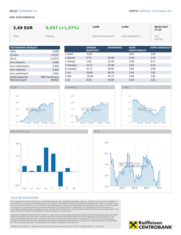 KARTA Raiffeisen Centrobank AG AKCJA CAIXABANK SA ISIN: ES0140609019 3,49 EUR 0,037 (+1,07%) 3,506 3,453 08.03.2017 17:12 CENA ZMIANA KURS MAKSYMALNY KURS NAJNIŻSZY OST. AKTUAL. NOTOWANIA BIEŻĄCE Cena 3,490 ZMIANA WARTOŚCI ZMIENNOŚĆ KURS MAKSYMALNY KURS NAJNIŻSZY +0,037 1 dzień -0,63 - 3,51 3,45 +1,07% 1 tydzień 4,70 28,38 3,49 3,32 Kurs otwarcia 3,460 1 miesiąc 1,65 31,35 3,49 3,17 Kurs maksymalny 3,506 3 miesiące 10,71 27,98 3,63 3,03 3,453 6 miesięcy 41,17 29,55 3,63 2,09 3,453 1 rok 30,80 38,74 3,63 1,82 BME Continuous Market 3 lata -24,61 34,72 5,00 1,82 5 lat 6,38 34,99 5,00 1,82 Zmiana Zm.% Kurs najniższy Kurs zamknięcia Giełda Papierów Wartościowych 10 dni Year performance 6 miesięcy 2 lata 20 lat ISTOTNE WSKAZÓWKI The contents offered herein shall serve informational purposes only. Raiffeisen Centrobank makes no warranty and will accept no liability for the correctness, accuracy and completeness of such contents. The offered contents shall neither be considered as an offer or invitation to buy or sell any type of securities nor as an incentive recommendation for buying or selling investment instruments. The contents shall not replace the necessary investment advice concerning the purchase or sale of securities or investments. Any charts offered herein shall serve as information of historical chart developments only. No performance information of the described investment instruments are given herein. The issuer shall bear no liability for updating the offered contents on a regular basis. Additionally, Raiffeisen Centrobank AG is subject to supervision by the European Central Bank (ECB), which ECB undertakes within the Single Supervisory Mechanism (SSM), which consists of the ECB on national responsible authorities (Council Regulation (EU) No 1024/2013). All products offered by RCB are subject to the base prospectus (including all supplements and amendments, if any) for the current issuance programme of RCB, which has been approved by the Austrian Financial Market Authority and deposited at the Oesterreichische Kontrollbank AG. The mentioned documents are published on the website of Raiffeisen Centrobank AG. Raiffeisen Centrobank AG, registered at the Vienna commercial register under FN 117507 f, Tegetthoffstraße 1, 1010 Wien. Powered by TCPDF (www.tcpdf.org)