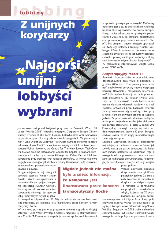 lobbing lobbing Z unijnych korytarzy Fot: Wspólnota Europejska, 2006 „Najgorsi” unijni lobbyści wybrani w sprawie dyrektyw patentowych”. McCreevy oskarżany jest o to, że pod naciskami wielkiego biznesu chce wprowadzić do prawa europejskiego zapisy odrzucone w dyrektywie patentowej z 2005 roku (o kampanii nonsoftware. com pisałem w poprzednich numerach „Piar. pl”). Na drugim i trzecim miejscu uplasowali się dwaj jego koledzy z Komisji: Günter Verheugen i Peter Mandelson za, jak stwierdzono, „szerokie otwarcie się na lobbystów korporacyjnych i powoływanie grup roboczych służących interesom jedynie dużych korporacji”. W głosowaniu internetowym wzięło udział ponad 9000 osób. Antykorupcyjny raport TI Również z końcem roku, w przededniu międzynarodowego dnia walki z korupcją, 7 grudnia 2006 roku „Transparency International” opublikował coroczny raport dotyczący korupcji. Barometr „Transparency International” bada wpływ korupcji na życie przeciętnych obywateli w 163 krajach świata. Okazuje się, że większość z nich bardzo nisko ocenia działania własnych rządów ‑ w skali globalnej prawie 70 proc. badanych twierdzi, że rząd niewystarczająco walczy z korupcją, a nawet sam do pewnego stopnia ją wspiera. Jedynie 22 proc. określiło działania podejmowane przez najwyższe władze jako efektywne lub bardzo efektywne. Z kolei w samej Unii Jak co roku, tuż przed świętami przyznano w Brukseli „Worst EU Europejskiej statystyki wydają się dużo barLobby Awards 2006”. Wspólna inicjatywa Corporate Europe Obserdziej optymistyczne. Jedynie 42 proc. Europejwatory, Friends of the Earth Europe, LobbyControl oraz Spinwatch czyków uważa, że ich rządy niewystarczająco przyznała w tym roku nagrody w dwóch kategoriach. W pierwszej z zwalczają korupcję. nich ‑ „The Worst EU Lobbying” ‑ pierwszą nagrodę otrzymał koncern Spośród wszystkich instytucji publicznych paliwowy „ExxonMobil” za wspieranie inicjatyw i think tanków (Internajmniejszym zaufaniem społeczeństwa jak national Policy Network, the Centre for The New Europe, Tech Cenzwykle cieszą się partie polityczne. Na kolejtral Station oraz the International Council for Capital Formation), kwenym miejscu uplasował się parlament, rząd, a stionujących zachodzące zmiany klimatyczne. Celem ExxonMobil jest następnie sektor prywatny jako obszary uwastworzenie przy pomocy tych fundacji atmosfery, w której naukowe żane za najbardziej skorumpowane. Niepokopoglądy kwestionujące jakiekolwiek zmiany klimatyczne będą uznawane jącym zjawiskiem jest zajęcie szóstego miejsca za racjonalne i powszechnie trakprzez policję. towane z powagą. Nigdzie jednak nie można Wśród obywateli korupcja Drugie miejsce w tej kategorii dotyczy mniejszej części Eurobyło znaleźć informacji, uzyskała agencja Weber Shanpejczyków. Jedynie 22 proc. z dwick, która przygotowała i nich twierdzi, że zjawisko to że kampania jest poprowadziła europejską kampadotyka ich w dużym stopniu. nię społeczną „Cancer United”. finansowana przez koncern To niewiele w porównaniu Za szczytny cel postawiono sobie na przykład z mieszkańcami farmaceutyczny Roche stworzenie równego dostępu do Afryki, których aż 70 proc. usług medycznych wysokiej jakotwierdzi, że korupcja bezpości wszystkim obywatelom UE. Nigdzie jednak nie można było znaśrednio wpływa na ich życie. Przy okazji opubleźć informacji, że kampania jest finansowana przez koncern farmalikowania raportu warto się dowiedzieć, co ceutyczny Roche. sądzą o korupcji nowi członkowie wspólnoty. W tym roku po raz pierwszy przyznano również nagrody w drugiej Według Bułgarów w 2006 roku najbardziej kategorii ‑ „The Worst Privileged Access”. Nagrodę tę otrzymał komiskorumpowany był sektor sprawiedliwości, sarz Charlie McCreevy za „manipulacje procesu społecznych konsultacji następnie partie polityczne, parlament i służba 70 lobbing zdrowia. W poprzednich latach na szczycie rankingów plasowała się służba celna (2005, 2004) oraz partie polityczne (2003). Pierwsze miejsce w rankingu najmniej skorumpowanych państw na świecie zajęły, już tradycyjnie, Islandia i Finlandia. Społeczne NGO testują Niemcy 1 stycznia 2007 roku przewodnictwo Unii Europejskiej przejęły Niemcy. W związku tym społeczne organizacje pozarządowe już po raz dziewiąty przygotowały dziewięciopunktowy program, na podstawie którego będą oceniać działanie Niemiec w najbliższym półroczu. Na zakończenie swojej prezydencji każdy kraj poddawany jest ocenie ze strony organizacji pozarządowych właśnie na podstawie „raportu Wartości społeczne Unii życzeń i oczekiwań” przedstawianego pół roku wcześniej. Tym razem Na konferencji „Wartości Spojednak oczekiwania wobec niełeczne i Demokracja: odnowiemieckiej prezydencji są szczeSpośród wszystkich nie podstawowych zasad Unii gólnie wysokie. Ma to związek Europejskiej”, zorganizowanej z ogłoszeniem przez Komisję instytucji publicznych przez zrzeszenie społecznych Europejską społecznych konnajmniejszym zaufaniem organiz acji poz ar z ądow ych sultacji na temat „Modernizacja Social Platform dyskutowano na prawa pracy wobec wyzwań społeczeństwa jak zwykle temat roli europejskiego modelu XXI wieku”, które mają być kluspołecznego w procesie democieszą się partie polityczne czem do nowego zdefiniowania kratyzacji Unii Europejskiej. roli flexicurity na europejskim Konferencja odbyła się nieprzyrynku pracy. Pytania, na podpadkowo w połowie grudnia, w momencie gdy stawie których Social Platform będzie oceniać niemiecką prezydencję Komisja Europejska przeprowadzała konsultadotyczą między innymi: ‑ przyszłości Unii – czy Niemcy stworzyły demokratyczną i przejrzystą cje w ramach Zielonej Księgi na temat prawa pracy. Podczas konferencji fińska minister poliprzestrzeń debaty publicznej na temat Traktatu Konstytu