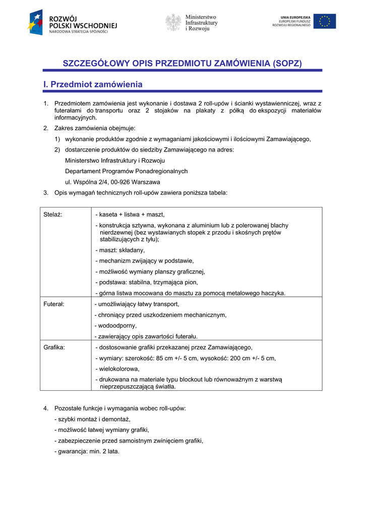 SZCZEGÓŁOWY OPIS PRZEDMIOTU ZAMÓWIENIA (SOPZ) I. Przedmiot zamówienia 1. Przedmiotem zamówienia jest wykonanie i dostawa 2 roll-upów i ścianki wystawienniczej, wraz z futerałami do transportu oraz 2 stojaków na plakaty z półką do ekspozycji materiałów informacyjnych. 2. Zakres zamówienia obejmuje: 1) wykonanie produktów zgodnie z wymaganiami jakościowymi i ilościowymi Zamawiającego, 2) dostarczenie produktów do siedziby Zamawiającego na adres: Ministerstwo Infrastruktury i Rozwoju Departament Programów Ponadregionalnych ul. Wspólna 2/4, 00-926 Warszawa 3. Opis wymagań technicznych roll-upów zawiera poniższa tabela: Stelaż: - kaseta + listwa + maszt, - konstrukcja sztywna, wykonana z aluminium lub z polerowanej blachy nierdzewnej (bez wystawianych stopek z przodu i skośnych prętów stabilizujących z tyłu); - maszt: składany, - mechanizm zwijający w podstawie, - możliwość wymiany planszy graficznej, - podstawa: stabilna, trzymająca pion, - górna listwa mocowana do masztu za pomocą metalowego haczyka. Futerał: - umożliwiający łatwy transport, - chroniący przed uszkodzeniem mechanicznym, - wodoodporny, - zawierający opis zawartości futerału. Grafika: - dostosowanie grafiki przekazanej przez Zamawiającego, - wymiary: szerokość: 85 cm +/- 5 cm, wysokość: 200 cm +/- 5 cm, - wielokolorowa, - drukowana na materiale typu blockout lub równoważnym z warstwą nieprzepuszczającą światła. 4. Pozostałe funkcje i wymagania wobec roll-upów: - szybki montaż i demontaż, - możliwość łatwej wymiany grafiki, - zabezpieczenie przed samoistnym zwinięciem grafiki, - gwarancja: min. 2 lata. 5. Opis wymagań technicznych stojaków zawiera poniższa tabela: Stelaż: - konstrukcja wykonana z aluminium lub z polerowanej blachy nierdzewnej, - stabilny, trzymający pion. Kieszeń: - transparentna, - wykonana z plastiku, - przeznaczona na plakat A3. Półki: - podwójna półka - przeznaczona na publikacje A4. 6. Pozostałe funkcje i wymagania wobec stojaków: - szybki montaż i demontaż, - możliwość łatwej wymiany plakatu, - gwarancja: min. 2 lata. 7. Rysunek poglądowy 8. Opis wymagań technicznych ścianki zawiera poniższa tabela: Stelaż: - konstrukcja sztywna wykonana z aluminium lub z polerowanej blachy nierdzewnej (bez wystawianych prętów stabilizujących z boku), - stabilny, trzymający pion, - wymiary: szerokość: 250 cm +/-25 cm, wysokość: 230 cm +/-10 cm, - w kształcie łuku horyzontalnego. Futerał: - umożliwiający łatwy transport, - chroniący przed uszkodzeniem mechanicznym, - wodoodporny, - zawierający opis zawartości futerału. Grafika: - elastyczna tkanina poliestrowa kalandrowana, - bez łączeń, - tkanina wytrzymała i odporna na odkształcenia i odbarwienia, - dostosowanie grafiki przekazanej przez Zamawiającego, - nadruk sublimacyjny wielokolorowy, - dwustronna - druga strona zadrukowana w sposób uniemożliwiający przenikanie 2 światła. 9. Pozostałe funkcje i wymagania wobec ścianki: - szybki montaż i demontaż, - gwarancja: min. 2 lata. II. Termin i sposób złożenia oferty 1. Oferty należy składać na adres: Monika Majewska Departament Programów Ponadregionalnych Ministerstwo Infrastruktury i Rozwoju ul. Wspólna 2/4, 00-926 Warszawa do dnia 18 września 2015 r. do godz. 16.00. 2. Do oferty należy dołączyć: - kosztorys, zgodnie z załącznikiem nr 1, - przykładowy/poglądowy wielokolorowy wydruk min. w formacie A4, na materiale z którego zostanie wykonana grafika roll-upu, - przykładowy/poglądowy wielokolorowy wydruk min. w formacie A4, na materiale z którego zostanie wykonana grafika ścianki, - wizualizację roll-upu, stojaka i ścianki, - poglądowe zdjęcia futerałów. III. Kryterium wyboru oferty 1. Główne kryterium oceny ofert stanowić będzie cena. 2. Zleceniodawca przy ocenie ofert uwzględni również: - jakość wykonania próbnych wydruków, - rodzaj materiałów zastosowanych w stelażach i futerałach, - wizualizację roll-upu, stojaka i ścianki. IV. Realizacja zamówienia Zamawiający w dniu przekazania zlecenia/podpisania umowy przekaże Wykonawcy na wskazany adres e-mail grafiki do dostosowania. W ciągu 3 dni roboczych od daty zlecenia/podpisania umowy Wykonawca przekaże Zamawiającemu próbne wydruki grafiki roll-upa i ścianki na materiałach, z których zostaną wykonane. Zamówienie zostanie zrealizowane w terminie do 5 dni roboczych od daty akceptacji przez Zamawiającego próbnych wydruków grafiki roll-upa i ścianki. Zamawiający dokona akceptacji za pośrednictwem poczty e-mail, na wskazany przez Wykonawcę adres. V. Informacje dodatkowe 1. Oferty, które wpłyną po terminie nie będą rozpatrywane. 3 2. Po wyborze Wykonawcy Zamawiający zastrzega sobie prawo negocjacji warunków zamówienia. 3. Zamawiający zastrzega sobie prawo do odpowiedzi tylko na wybraną ofertę. 4. Ministerstwo Infrastruktury i Rozwoju zawiera umowy na podstawie własnych wzorów umów, stosowanych w Ministerstwie. 5. Niniejsza oferta nie stanowi oferty w myśl art. 66 Kodeksu Cywilnego, jak również nie jest ogłoszeniem w rozumieniu ustawy Prawo zamówień publicznych (Dz. U. z 2010 r. Nr 113, poz. 759, z późn. zm.). 6. Zaproszenie nie jest postępowaniem o udzielenie zamówienia w rozumieniu przepisów ustawy Prawo zamówień publicznych oraz nie kształtuje zobowiązania Ministerstwa do przyjęcia którejkolwiek z ofert. 7. Ministerstwo zastrzega sobie prawo do rezygnacji z realizacji zadania bez wyboru którejkolwiek ze złożonych ofert lub do rezygnacji z części zadania bez podania przyczyny, przed złożeniem zamówienia/podpisaniem umowy. 8. Zamawiający zastrzega, że całościowa oferowana cena stanowi informację publiczną w rozumieniu przepisów Ustawy o dostępie do informacji publicznej i w przypadku zastrzeżenia jej przez oferenta jako tajemnicy przedsiębiorstwa lub tajemnicy przedsiębiorcy, jego oferta zostanie odrzucona. 9. Zamawiający nie ma możliwości zali