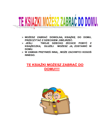 MOŻESZ ZABRAĆ DOWOLNĄ KSIĄŻKĘ DO DOMU, PRZECZYTAĆ Z DZIECKIEM ,OBEJRZEĆ. JEŚLI TWOJE DZIECKO ZECHCE POBYĆ Z KSIĄŻECZKĄ DŁUŻEJ MOŻESZ JĄ ZOSTAWIĆ W DOMU. W ZAMIAN PRZYNIEŚ INNĄ , MOŻE ZACHWYCI KOGOŚ INNEGO. TE KSIĄŻKI MOŻESZ ZABRAĆ DO DOMU!!!!