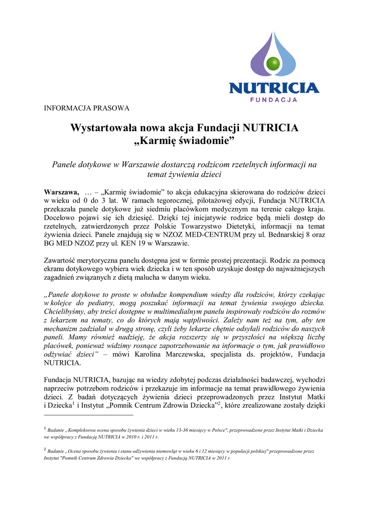 INFORMACJA PRASOWA Wystartowała nowa akcja Fundacji NUTRICIA „Karmię świadomie” Panele dotykowe w Warszawie dostarczą rodzicom rzetelnych informacji na temat żywienia dzieci Warszawa, … – „Karmię świadomie” to akcja edukacyjna skierowana do rodziców dzieci w wieku od 0 do 3 lat. W ramach tegorocznej, pilotażowej edycji, Fundacja NUTRICIA przekazała panele dotykowe już siedmiu placówkom medycznym na terenie całego kraju. Docelowo pojawi się ich dziesięć. Dzięki tej inicjatywie rodzice będą mieli dostęp do rzetelnych, zatwierdzonych przez Polskie Towarzystwo Dietetyki, informacji na temat żywienia dzieci. Panele znajdują się w NZOZ MED-CENTRUM przy ul. Bednarskiej 8 oraz BG MED NZOZ przy ul. KEN 19 w Warszawie. Zawartość merytoryczna panelu dostępna jest w formie prostej prezentacji. Rodzic za pomocą ekranu dotykowego wybiera wiek dziecka i w ten sposób uzyskuje dostęp do najważniejszych zagadnień związanych z dietą malucha w danym wieku. „Panele dotykowe to proste w obsłudze kompendium wiedzy dla rodziców, którzy czekając w kolejce do pediatry, mogą poszukać informacji na temat żywienia swojego dziecka. Chcielibyśmy, aby treści dostępne w multimedialnym panelu inspirowały rodziców do rozmów z lekarzem na tematy, co do których mają wątpliwości. Zależy nam też na tym, aby ten mechanizm zadziałał w drugą stronę, czyli żeby lekarze chętnie odsyłali rodziców do naszych paneli. Mamy również nadzieję, że akcja rozszerzy się w przyszłości na większą liczbę placówek, ponieważ widzimy rosnące zapotrzebowanie na informacje o tym, jak prawidłowo odżywiać dzieci” – mówi Karolina Marczewska, specjalista ds. projektów, Fundacja NUTRICIA. Fundacja NUTRICIA, bazując na wiedzy zdobytej podczas działalności badawczej, wychodzi naprzeciw potrzebom rodziców i przekazuje im informacje na temat prawidłowego żywienia dzieci. Z badań dotyczących żywienia dzieci przeprowadzonych przez Instytut Matki i Dziecka1 i Instytut „Pomnik Centrum Zdrowia Dziecka”2, które zrealizowane zostały dzięki 1 Badanie „Kompleksowa ocena sposobu żywienia dzieci w wieku 13-36 miesięcy w Polsce", przeprowadzone przez Instytut Matki i Dziecka we współpracy z Fundacją NUTRICIA w 2010 r. i 2011 r. 2 Badanie „Ocena sposobu żywienia i stanu odżywienia niemowląt w wieku 6 i 12 miesięcy w populacji polskiej" przeprowadzone przez Instytut "Pomnik Centrum Zdrowia Dziecka" we współpracy z Fundacją NUTRICIA w 2011 r grantom Fundacji NUTRICIA, wynika, że dieta dzieci jest nieprawidłowo zbilansowana. Dlatego tak ważne jest kształtowanie właściwych nawyków żywieniowych już u najmłodszych oraz edukacja rodziców. Akcja „Karmię świadomie” to kolejne przedsięwzięcie Fundacji skierowane do rodziców, którzy w coraz większym stopniu potrzebują i poszukują wiedzy na temat prawidłowego odżywiania ich dzieci. „Panel dotykowy dostępny w naszej przychodni cieszy się dużym zainteresowaniem rodziców. Podczas każdej wizyty profilaktycznej staramy się rozmawiać z nimi na temat żywienia dzieci, jednak nie zawsze starcza nam czasu na omówienie wszystkich kwestii związanych np. z rozszerzaniem diety maluchów. Urządzenie przygotowane przez Fundację NUTRICIA jest punktem wyjścia do rozmowy z pediatrą i cennym źródłem informacji dla mam. Przeglądając treści dostępne w panelu mogą one już podczas oczekiwania na wizytę zastanowić się nad pytaniami, które chciałyby zadać lekarzowi” – mówi lekarz pediatra Regina Kaliska, NZOZ MED-CENTRUM w Warszawie. Panele dotykowe dostępne są już w placówkach zdrowia publicznego we Wrocławiu, Lublinie, Poznaniu, Bydgoszczy oraz w Warszawie na okres od sierpnia do grudnia 2012 roku. Fundacja NUTRICIA powstała w 1996 roku. Misją Fundacji jest chronienie, promocja i zapewnienie zdrowia poprzez żywienie. Jej działania skupiają się na trzech obszarach: badań z zakresu żywienia człowieka, edukacji związanej z żywieniem kierowanej do społeczeństwa oraz edukacji związanej z żywieniem kierowanej do środowiska medycznego. Od początku swojego istnienia Fundacja finansuje badania naukowe z zakresu żywienia człowieka w formie grantów naukowych. Organizuje także seminaria poświęcone zasadom planowania badań naukowych, finansuje kursy i spotkania edukacyjne dla osób dotkniętych różnymi schorzeniami metabolicznymi oraz wspiera działania edukacyjne w środowisku medycznym. Więcej informacji udziela: Karolina Brylska Biuro prasowe Fundacji NUTRICIA tel.: 0 506 052 096 e-mail: [email protected]