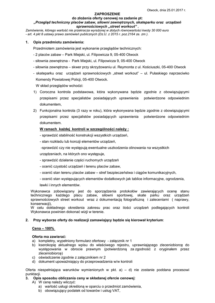 Otwock, dnia 25.01.2017 r. ZAPROSZENIE do złożenia oferty cenowej na zadanie pt: „Przegląd techniczny placów zabaw, siłowni zewnętrznych, skateparku oraz urządzeń sprawnościowych „street workout” . Zamówienie, którego wartość nie przekracza wyrażonej w złotych równowartości kwoty 30 000 euro - art. 4 pkt 8 ustawy prawo zamówień publicznych (Dz.U. z 2015 r. poz.2164 ze. zm ). 1. Opis przedmiotu zamówienia: Przedmiotem zamówienia jest wykonanie przeglądów technicznych: - 2 placów zabaw – Park Miejski, ul. Filipowicza 9, 05-400 Otwock - siłownia zewnętrzna - Park Miejski, ul. Filipowicza 9, 05-400 Otwock - siłownia zewnętrzna – skwer przy skrzyżowaniu ul. Reymonta z ul. Kościuszki, 05-400 Otwock - skateparku oraz urządzeń sprawnościowych „street workout” – ul. Pułaskiego naprzeciwko Komendy Powiatowej Policji, 05-400 Otwock. W skład przeglądów wchodzi: 1) Coroczna kontrola podstawowa, która wykonywana będzie zgodnie z obowiązującymi przepisami przez specjalistów posiadających uprawnienia potwierdzone odpowiednim dokumentem, 2) Funkcjonalna kontrola (3 razy w roku), która wykonywana będzie zgodnie z obowiązującymi przepisami przez specjalistów posiadających uprawnienia potwierdzone odpowiednim dokumentem. W ramach każdej kontroli w szczególności należy : - sprawdzić stabilność konstrukcji wszystkich urządzeń, - stan rozkładu lub korozji elementów urządzeń, -sprawdzić czy nie występują ewentualne uszkodzenia olinowania na wszystkich urządzeniach, na których ono występuje, - sprawdzić działanie części ruchomych urządzeń - ocenić czystość urządzeń i terenu placów zabaw, - ocenić stan terenu placów zabaw – stref bezpieczeństwa i ciągów komunikacyjnych, - ocenić stan występujących elementów dodatkowych jak tablice informacyjne, ogrodzenia, ławki i innych elementów. Wykonawca zobowiązany jest do sporządzenia protokołów zawierających ocenę stanu technicznego każdego placu zabaw, siłowni sportowej, skate parku oraz urządzeń sprawnościowych street workout wraz z dokumentacją fotograficzną i zaleceniami ( naprawy, konserwacji), W celu dokładnego określenia zakresu prac oraz ilości urządzeń podlegających kontroli Wykonawca powinien dokonać wizji w terenie. 2. Przy wyborze oferty do realizacji zamawiający będzie się kierował kryterium: Cena – 100% Oferta ma zawierać: a) kompletny, wypełniony formularz ofertowy - załącznik nr 1 b) kserokopię aktualnego wpisu do właściwego rejestru, uprawniającego zleceniobiorcę do występowania w obrocie prawnym (potwierdzoną za zgodność z oryginałem przez zleceniobiorcę) c) oświadczenie zgodnie z załącznikiem nr 2 d) dokument upoważniający do przeprowadzenia w/w kontroli Oferta niespełniająca warunków wymienionych w pkt. a) – d) nie zostanie poddana procesowi punktacji. 3. Opis sposobu obliczania ceny w składanej ofercie cenowej: A) W cenę należy wliczyć: a) wartość usługi określoną w oparciu o przedmiot zamówienia, b) obowiązujący podatek od towarów i usług VAT, 4. Miejsce i termin złożenia oferty cenowej: a) Ofertę cenową należy złożyć do dnia 03.02.2017 do godziny 12.00 w zaklejonej kopercie w siedzibie zamawiającego: Urząd Miasta Otwocka ul. Armii Krajowej 5 , Biuro Obsługi Mieszkańca budynek B p.1 b) Opis sposobu przygotowania oferty cenowej: ofertę należy złożyć w nieprzejrzystej i zamkniętej kopercie, na kopercie należy umieścić nazwę i adres zamawiającego, nazwę i adres wykonawcy oraz napis: Oferta dla WGK na: „Przegląd techniczny placów zabaw, siłowni zewnętrznych, skateparku oraz urządzeń sprawnościowych „street workout” - ceny w ofercie mają być wyrażone cyfrowo i słownie, oferta ma być napisana w języku polskim, czytelną i trwałą techniką. c) Oferta cenowa otrzymana przez zamawiającego po terminie poddanym powyżej zostanie zniszczona. d) Wykonawca może wprowadzić zmiany lub wycofać złożoną przez siebie ofertę cenową przed terminem upływu jej składania. 5. Osobami uprawnionymi do kontaktów z wykonawcami są: Michał Piłka Sebastian Witkowski tel. 22 779 20 01 w. 139 [email protected] 2 Załącznik nr 1 ...................................., dnia…………r. Zamawiający: Gmina Otwock, którą reprezentuje Prezydent Miasta Otwocka, ul. Armii Krajowej 5, 05-400 Otwock, tel. 22 779 20 01 Wykonawca / zarejestrowana nazwa/ imię i nazwisko: ......................................................................................... .............................................................................................. adres Wykonawcy: ulica ....................................... nr domu ..... kod ..................... miejscowość ........................................................... powiat ................................. województwo ........................................ tel.: ..................................... fax: ................................. REGON:................................ NIP: ................................ OFERTA CENOWA Odpowiadając na zaproszenie do złożenia oferty cenowej w ramach zadania pn.: „Przegląd techniczny placów zabaw, siłowni zewnętrznych, skateparku oraz sprawnościowych „street workout” urządzeń Oferuję wykonanie przedmiotu zamówienia, zgodnie z wymogami opisu przedmiotu zamówienia : Coroczna kontrola podstawowa : Kwota netto:..….….…...zł (słownie……………………………..……………….……………………….…………...…………………) podatek VAT……% tj: ….…………zł. (słownie:…………………………........…………………………) Kwota brutto: …………..zł. (słownie:……………………………………………………………………………………………………..) Funkcjonalna kontrola ( należy podać cenę za jedną kontrolę) Kwota netto:..….….…...zł (słownie……