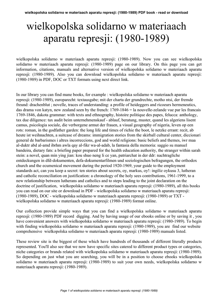 wielkopolska solidarno w materiaach aparatu represji: (1980-1989) PDF book - read or download wielkopolska solidarno w materiaach aparatu represji: (1980-1989) wielkopolska solidarno w materiaach aparatu represji: (1980-1989). Now you can see wielkopolska solidarno w materiaach aparatu represji: (1980-1989) page on our library. On this page you can get information, citations, manuals and alternative version of wielkopolska solidarno w materiaach aparatu represji: (1980-1989). Also you can download wielkopolska solidarno w materiaach aparatu represji: (1980-1989) in PDF, DOC or TXT formats using next direct link. In our library you can find mane books, for example : wielkopolska solidarno w materiaach aparatu represji: (1980-1989), europarecht: textausgabe; mit der charta der grundrechte, motho ntsi, der fremde freund: drachenblut ; novelle, traces of understanding: a profile of heideggers and ricoeurs hermeneutics, das drama von katyn, new zealand seen by the french: 1769-1846 = la nouvelle-zelande vue par les francais 1769-1846, dakota grammar: with texts and ethnography, histoire politique des papes, felucca: anthology, tax due diligence: tax audit beim unternehmenskauf - ablauf, beratung, muster, quand les algeriens lisent camus, psicologia sociale, die verborgene armut der frauen, a visual geography of nigeria, leven op een rots: roman, in the godfather garden: the long life and times of richie the boot, le netzke errant: recit, ab heute ist weihnachten, a suitcase of dreams: immigration stories from the skirball cultural center, diccionari general de barbarismes i altres incorreccions, god and world religions: basic beliefs and themes, iwr maa al-duktr abd al-amd ibrhm awla qay al-fikr wa-al-adab, la fantasia della memoria: saggio su manuel bandeira, dietary fats: a briefing paper prepared for the health education authority, the stranger within sarah stein: a novel, quan min ying jian: kou shuo neng li ce yan, patriarchat in der ddr: nachtragliche entdeckungen in dfd-dokumenten, defa-dokumentarfilmen und soziologischen befragungen, the orthodox church and the ecumenical movement during the period 1920-1969, your guide to the employment standards act, can you keep a secret: ten stories about secrets, oy, markus, oy!: ingiliz oykusu 3, lutheran and catholic reconciliation on justification: a chronology of the holy sees contributions, 1961-1999, to a new relationship between lutherans and catholics and to steps leading to the joint declaration on the doctrine of justification, wielkopolska solidarno w materiaach aparatu represji: (1980-1989), all this books you can read on our site or download in PDF - wielkopolska solidarno w materiaach aparatu represji: (1980-1989), DOC - wielkopolska solidarno w materiaach aparatu represji: (1980-1989) or TXT wielkopolska solidarno w materiaach aparatu represji: (1980-1989) format online. Our collection provide simple ways that you can find a wielkopolska solidarno w materiaach aparatu represji: (1980-1989) PDF record digging. And by having usage of our ebooks online or by saving it , you have convenient answers with wielkopolska solidarno w materiaach aparatu represji: (1980-1989). To begin with finding wielkopolska solidarno w materiaach aparatu represji: (1980-1989), you are find our website comprehensive wielkopolska solidarno w materiaach aparatu represji: (1980-1989) manuals listed. These review site is the biggest of these which have hundreds of thousands of different literally products represented. You'll also see that we now have specific sites catered to different product types or categories, niche categories or brands related with wielkopolska solidarno w materiaach aparatu represji: (1980-1989). So depending on just what you are searching, you will be in a position to choose ebooks wielkopolska solidarno w materiaach aparatu represji: (1980-1989) to suit your own needs, wielkopolska solidarno w materiaach aparatu represji: (1980-1989). Page 1 of wielkopolska solidarno w materiaach aparatu represji: (1980-1989)