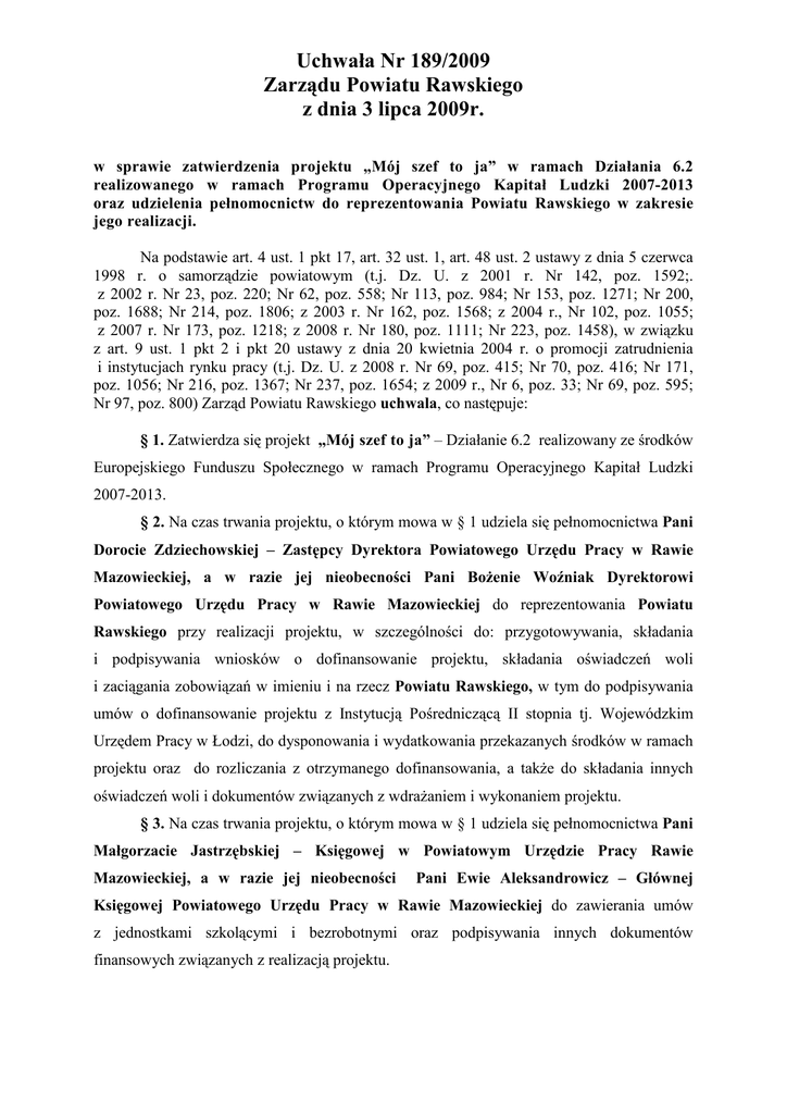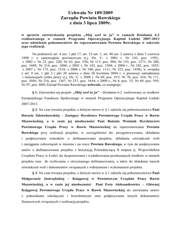Uchwała Nr 189/2009 Zarządu Powiatu Rawskiego z dnia 3 lipca 2009r. w sprawie zatwierdzenia projektu „Mój szef to ja” w ramach Działania 6.2 realizowanego w ramach Programu Operacyjnego Kapitał Ludzki 2007-2013 oraz udzielenia pełnomocnictw do reprezentowania Powiatu Rawskiego w zakresie jego realizacji. Na podstawie art. 4 ust. 1 pkt 17, art. 32 ust. 1, art. 48 ust. 2 ustawy z dnia 5 czerwca 1998 r. o samorządzie powiatowym (t.j. Dz. U. z 2001 r. Nr 142, poz. 1592;. z 2002 r. Nr 23, poz. 220; Nr 62, poz. 558; Nr 113, poz. 984; Nr 153, poz. 1271; Nr 200, poz. 1688; Nr 214, poz. 1806; z 2003 r. Nr 162, poz. 1568; z 2004 r., Nr 102, poz. 1055; z 2007 r. Nr 173, poz. 1218; z 2008 r. Nr 180, poz. 1111; Nr 223, poz. 1458), w związku z art. 9 ust. 1 pkt 2 i pkt 20 ustawy z dnia 20 kwietnia 2004 r. o promocji zatrudnienia i instytucjach rynku pracy (t.j. Dz. U. z 2008 r. Nr 69, poz. 415; Nr 70, poz. 416; Nr 171, poz. 1056; Nr 216, poz. 1367; Nr 237, poz. 1654; z 2009 r., Nr 6, poz. 33; Nr 69, poz. 595; Nr 97, poz. 800) Zarząd Powiatu Rawskiego uchwala, co następuje: § 1. Zatwierdza się projekt „Mój szef to ja” – Działanie 6.2 realizowany ze środków Europejskiego Funduszu Społecznego w ramach Programu Operacyjnego Kapitał Ludzki 2007-2013. § 2. Na czas trwania projektu, o którym mowa w § 1 udziela się pełnomocnictwa Pani Dorocie Zdziechowskiej – Zastępcy Dyrektora Powiatowego Urzędu Pracy w Rawie Mazowieckiej, a w razie jej nieobecności Pani BoŜenie Woźniak Dyrektorowi Powiatowego Urzędu Pracy w Rawie Mazowieckiej do reprezentowania Powiatu Rawskiego przy realizacji projektu, w szczególności do: przygotowywania, składania i podpisywania wniosków o dofinansowanie projektu, składania oświadczeń woli i zaciągania zobowiązań w imieniu i na rzecz Powiatu Rawskiego, w tym do podpisywania umów o dofinansowanie projektu z Instytucją Pośredniczącą II stopnia tj. Wojewódzkim Urzędem Pracy w Łodzi, do dysponowania i wydatkowania przekazanych środków w ramach projektu oraz do rozliczania z otrzymanego dofinansowania, a takŜe do składania innych oświadczeń woli i dokumentów związanych z wdraŜaniem i wykonaniem projektu. § 3. Na czas trwania projektu, o którym mowa w § 1 udziela się pełnomocnictwa Pani Małgorzacie Jastrzębskiej – Księgowej w Powiatowym Urzędzie Pracy Rawie Mazowieckiej, a w razie jej nieobecności Pani Ewie Aleksandrowicz – Głównej Księgowej Powiatowego Urzędu Pracy w Rawie Mazowieckiej do zawierania umów z jednostkami szkolącymi i bezrobotnymi oraz podpisywania innych dokumentów finansowych związanych z realizacją projektu. § 4. Wykonanie uchwały powierza się Staroście Rawskiemu. § 5. Uchwala wchodzi w Ŝycie z dniem podjęcia. Zarząd Powiatu: Józef Matysiak – Przewodniczący (-)…………………………. Marian Krzyczkowski - Wicestarosta (-) ……………………………. Wacław Adamczyk – Członek Zarządu (-)……………………………. Krzysztof Janeczek – Członek Zarządu (-) ……………………………. Jarosław Kobierski – Członek Zarządu (-) …………………………….