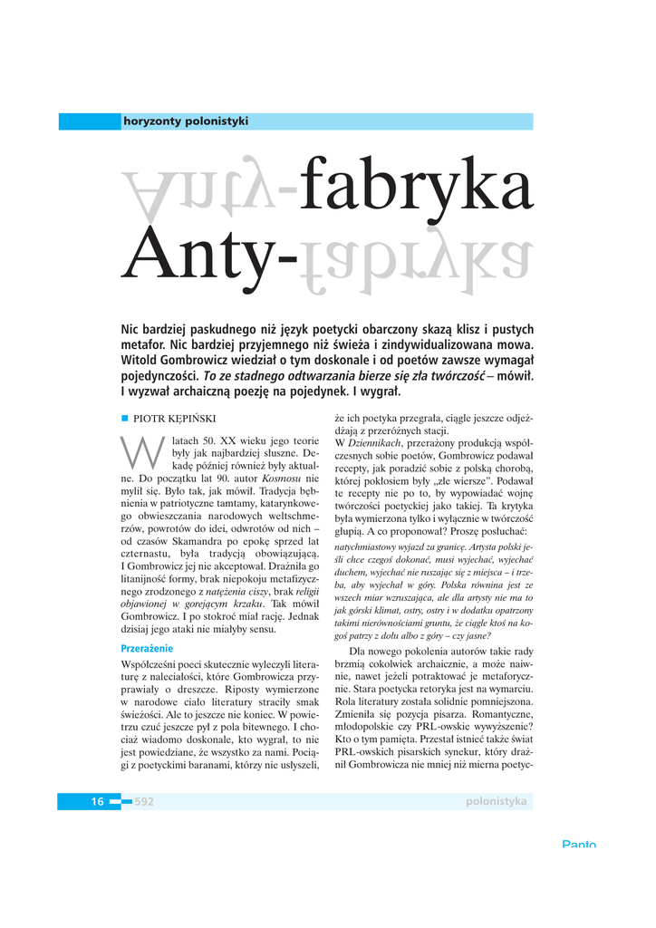 horyzonty polonistyki Anty-fabryka fabryka AntyNic bardziej paskudnego ni˝ j´zyk poetycki obarczony skazà klisz i pustych metafor. Nic bardziej przyjemnego ni˝ Êwie˝a i zindywidualizowana mowa. Witold Gombrowicz wiedzia∏ o tym doskonale i od poetów zawsze wymaga∏ pojedynczoÊci. To ze stadnego odtwarzania bierze si´ z∏a twórczoÊç – mówi∏. I wyzwa∏ archaicznà poezj´ na pojedynek. I wygra∏. PIOTR K¢PI¡SKI W latach 50. XX wieku jego teorie by∏y jak najbardziej s∏uszne. Dekad´ póêniej równie˝ by∏y aktualne. Do poczàtku lat 90. autor Kosmosu nie myli∏ si´. By∏o tak, jak mówi∏. Tradycja b´bnienia w patriotyczne tamtamy, katarynkowego obwieszczania narodowych weltschmerzów, powrotów do idei, odwrotów od nich – od czasów Skamandra po epok´ sprzed lat czternastu, by∏a tradycjà obowiàzujàcà. I Gombrowicz jej nie akceptowa∏. Dra˝ni∏a go litanijnoÊç formy, brak niepokoju metafizycznego zrodzonego z nat´˝enia ciszy, brak religii objawionej w gorejàcym krzaku. Tak mówi∏ Gombrowicz. I po stokroç mia∏ racj´. Jednak dzisiaj jego ataki nie mia∏yby sensu. Przera˝enie Wspó∏czeÊni poeci skutecznie wyleczyli literatur´ z nalecia∏oÊci, które Gombrowicza przyprawia∏y o dreszcze. Riposty wymierzone w narodowe cia∏o literatury straci∏y smak Êwie˝oÊci. Ale to jeszcze nie koniec. W powietrzu czuç jeszcze py∏ z pola bitewnego. I chocia˝ wiadomo doskonale, kto wygra∏, to nie jest powiedziane, ˝e wszystko za nami. Pociàgi z poetyckimi baranami, którzy nie us∏yszeli, 16 592 ˝e ich poetyka przegra∏a, ciàgle jeszcze odje˝d˝ajà z przeró˝nych stacji. W Dziennikach, przera˝ony produkcjà wspó∏czesnych sobie poetów, Gombrowicz podawa∏ recepty, jak poradziç sobie z polskà chorobà, której pok∏osiem by∏y „z∏e wiersze”. Podawa∏ te recepty nie po to, by wypowiadaç wojn´ twórczoÊci poetyckiej jako takiej. Ta krytyka by∏a wymierzona tylko i wy∏àcznie w twórczoÊç g∏upià. A co proponowa∏? Prosz´ pos∏uchaç: natychmiastowy wyjazd za granic´. Artysta polski jeÊli chce czegoÊ dokonaç, musi wyjechaç, wyjechaç duchem, wyjechaç nie ruszajàc si´ z miejsca – i trzeba, aby wyjecha∏ w góry. Polska równina jest ze wszech miar wzruszajàca, ale dla artysty nie ma to jak górski klimat, ostry, ostry i w dodatku opatrzony takimi nierównoÊciami gruntu, ˝e ciàgle ktoÊ na kogoÊ patrzy z do∏u albo z góry – czy jasne? Dla nowego pokolenia autorów takie rady brzmià cokolwiek archaicznie, a mo˝e naiwnie, nawet je˝eli potraktowaç je metaforycznie. Stara poetycka retoryka jest na wymarciu. Rola literatury zosta∏a solidnie pomniejszona. Zmieni∏a si´ pozycja pisarza. Romantyczne, m∏odopolskie czy PRL-owskie wywy˝szenie? Kto o tym pami´ta. Przesta∏ istnieç tak˝e Êwiat PRL-owskich pisarskich synekur, który dra˝ni∏ Gombrowicza nie mniej ni˝ mierna poetyc- polonistyka Panto horyzonty polonistyki ka jakoÊç. Outsidera, który na ˝ycie musia∏ zarabiaç pracà w banku, jak˝e musia∏ irytowaç system, który z urz´du promowa∏ miernoty. Jego wizja pisarza kszta∏towana by∏a przez rzeczywistoÊç rynkowà i przeÊwiadczenie, ˝e autor nie dzia∏a w imieniu grup spo∏ecznych czy narodowych. Autor Pornografii przestrzega∏: poeta winien pisaç tylko i wy∏àcznie dla siebie. Na swój w∏asny rachunek. Powtarza∏: ca∏à naszà prac´ winien weryfikowaç czytelnik, a nie bandy urz´dników. Krytycy te˝ winni zmieniç swojà mentalnoÊç. Czy literatura straci∏a na transformacji? W Polsce takie myÊlenie w ciàgu ostatnich minionych kilkudziesi´ciu lat praktycznie nie istnia∏o. Dyskusji o twórczoÊci te˝ praktycznie nie by∏o. Nawet w latach 90. miast o j´zyku i stylu rozprawiano o arcydzie∏ach. Dlaczego ich nie ma? Niewiele by∏o wnikliwych opinii. Niewiele cennych rozpoznaƒ. Krytycy z uporem pytali: ile literatura straci∏a na transformacji. Jak bardzo szkoda, ˝e nie jest jak dawniej, jak za PRL-u. Przyk∏ady? Prosz´ bardzo. Marek Zaleski w „Res Republice Nowej” (w 2004 r.) pisa∏: Nikomu (...) nie uda∏o si´ napisaç dzie∏a, które sta∏oby si´ dla nas wszystkich znaczàce, jakiegoÊ „nowego” „PrzedwioÊnia”, „Genera∏a Barcza” czy zgo∏a „Kariery Nikodema Dyzmy”. W tym wszystkim zainstalowali si´ najlepiej specjaliÊci od marketingu kultury sprowadzonej do poziomu rozrywki. To, co sk∏ada∏o si´ na etos SolidarnoÊci, zosta∏o doszcz´tnie zmarnowane. Profesor Maria Janion próbowa∏a reanimowaç w nowej sytuacji paradygmat romantyczny, ale w nowych realiach okazuje si´ to pobo˝nym ˝yczeniem. Z drugiej strony, zabiegi zmierzajàce do rekonstrukcji wspólnoty wartoÊci sà dzisiaj podejrzewane o zakusy uzurpatorskie, o to, ˝e zmierza si´ do tego, by znowu jakàÊ swojà „wielkà narracj´” narzuciç ogó∏owi, który przecie˝ sk∏ada si´ z pluralistycznych grup i wolnych wreszcie jednostek. Có˝, brakowa∏o i brakuje wypowiedzi, które pi´tnowa∏yby grzechy krytyków, którzy nie sà dostatecznie odwa˝ni, by mówiç prawdy niewygodne. Do tej pory chyba zaryzykowa∏a tylko Ma∏gorzata Dziewulska. Mówi∏a mniej wi´cej tak: jesteÊmy wszyscy dosyç kunktatorscy. Czy pogubieni? Uwik∏ani w interesy? Nie 10/2004 antone wiemy, czego si´ trzymaç? Ciàgle si´ wahamy, jak oceniç ró˝ne rzeczy? A mo˝e mamy za du˝o znajomych w ró˝nych instytucjach kultury? Mo˝e mówimy bardziej j´zykiem urazów ni˝ poglàdów? Czy te˝ jesteÊmy w szachu poprawnoÊci politycznej i Êrodowiskowej? Poeci wyzwolili si´ z okowów przesz∏oÊci. A krytyka? Ciàgle tkwi w uk∏adach i w XIX wieku. Ju˝ nikt nie mówi, co prawda, ˝e literatura polska musi oczarowaç jednostk´, poddaç jà masie, zn´ciç do patriotyzmu, obywatelstwa, wiary i s∏u˝by. Ale uk∏adanie zbiorowych puzzli z autorami, specyficzne promocje, wik∏anie pisarzy w polityk´ – to bez przerwy odró˝nia kry