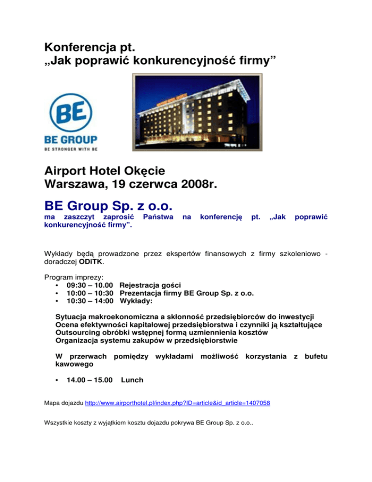 Airport Hotel Okęcie Warszawa, 19 czerwca 2008r. BE Group Sp. z oo
