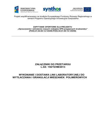 Projekt współfinansowany ze środków Europejskiego Funduszu Rozwoju Regionalnego w ramach Programu Operacyjnego Innowacyjna Gospodarka ZAPYTANIE OFERTOWE DLA PROJEKTU „Opracowanie i wdrożenie nowych rodzajów EPS przyjaznych środowisku” (POIG.01.04.00-12-125/09-POIG.04.01.00-12-125/09) ZAŁĄCZNIKI DO PRZETARGU L.DZ. 150/TZ/IM/2013 WYKONANIE I DOSTAWA LINII LABORATORYJNEJ DO WYTŁACZANIA I GRANULACJI MIESZANEK POLIMEROWYCH Projekt współfinansowany ze środków Europejskiego Funduszu Rozwoju Regionalnego w ramach Programu Operacyjnego Innowacyjna Gospodarka Oświęcim, dnia 21.05.2013 L.dz. 150/TZ/IM/2013 Dotyczy: zaproszenia do złożenia oferty cenowej dla projektu.: Opracowanie i wdrożenie nowych rodzajów EPS przyjaznych środowisku” (POIG.01.04.00-12-125/09 -POIG.04.01.00-12-125/09) 1. Zwracamy się z prośbą o złożenie oferty cenowej wykonanie i dostawę linii laboratoryjnej do wytłaczania i granulacji mieszanek polimerowych zgodnie z niżej podanymi wymaganiami technicznymi: Linia laboratoryjna do wytłaczania i granulacji mieszanek polimerowych: Wydajność: maksymalnie 100 kg/h granulatu. Dwu ślimakowy extruder do plastyfikacji i mieszania polimerów wraz z dodatkami w postaci stałej lub ciekłej. Ślimaki segmentowe z możliwością zmiany ich konfiguracji, możliwość zmiany położenia zbiorników zasypowych oraz systemów dozowania. Temperatura pracy: max 300 °C. Materiał śruby: odporny na korozję oraz abrazję. Materiał obudowy: odporny na korozję oraz abrazję. Strefy odgazowania: dwie strefy odgazowania z możliwością podłączenia układu próżniowego. Ogrzewanie: elektryczne System pracy: 2500 h/rocznie (ok. 8 h/dziennie – proces nieciągły, częste zatrzymywanie i uruchamianie linii – łatwość czyszczenia) Połączenie z dozownikiem bocznym do granulatów / proszków (wejścia boczne w 1/3 L i L 2/3) Inne akcesoria / części zgodnie z projektem linii: filtry, pompy stopu, etc. Grawimetryczne dozowanie surowców (Loss-in-Weight Feeders). Dozownik granulatu: wydajność 5 – 50 kg/h wraz z częścią transportującą materiał wlotowy. Dozownik granulatu (dodatków): wydajność 1 – 15 kg/h z możliwością podłączenia do wejścia bocznego extrudera (mobilny). Dozownik dodatków proszkowych, średnio i trudno przetwarzalnych: wydajność 1 – 30 kg/h. Dozownik dodatków ciekłych. Dozownik dodatków proszkowych, średnio i trudno przetwarzalnych, do małych wydajności: 0,1 – 2,5 kg/h (mobilny). Aparatura odgazowująca (pompa próżniowa, zbiornik na gaz odlotowy, zbiornik na odpady płynne). Granulacja żyłek: (minimum dwie żyłki) granulat 3 – 4 mm, kąpiel chłodząca (czynniki chłodzący: powietrze i woda), granulacja żyłek z możliwością kontroli prędkości. Projekt współfinansowany ze środków Europejskiego Funduszu Rozwoju Regionalnego w ramach Programu Operacyjnego Innowacyjna Gospodarka Obiekt zostanie wyposażony w izolację cieplną. Wszystkie elementy o temperaturze wyższej niż 65 °C muszą być izolowane. 2. Strony zaangażowane w postępowanie ofertowe: Zamawiający: firma Synthos Dwory 7 spółka z ograniczoną odpowiedzialnością S.K.A. Adres: ul,Chemików 1 32-600 Oświęcim 3. Oferta winna zawierać: a) b) c) d) e) f) g) h) pełną nazwę oferenta, siedzibę oferenta, numer telefonu oraz numer NIP, informacje techniczne o oferowanych urządzeniach cenę w rozbiciu na : cena poszczególnych elementów ( w przypadku kiedy urządzenia sa jednym z elementów oferty); okres gwarancji termin ważności oferty min. do 07.09.2013 Referencje: potwierdzony udział w przynamniej dwóch podobnych projektach oferta powinna zostać podpisana przez osobę lub osoby upoważnione do występowania w obrocie prawnym w imieniu oferenta, przy czym podpis musi być czytelny lub opisany pieczęciami imiennymi 4. Osoby uprawnione do kontaktów z oferentami: Izabela Musiał - tel. (033) 847-21-74 - sprawy handlowe Filip Kondratowicz - tel. 785 700 438 -sprawy techniczne Marcin Chylaszek – Tel (33) 667 761 713 - sprawy techniczne 5. Ofertę – należy złożyć w terminie do 07.06.2013 w formie elektronicznej lub w zamkniętej kopercie na adres: Synthos Dwory 7 spółka z ograniczoną odpowiedzialnością S.K.A. , ul. Chemików 1, 32-600 Oświęcim 6. Postępowanie przetargowe prowadzone będzie wg procedur własnych Zamawiającego. 7.Po rozpatrzeniu ofert o decyzji Zamawiającego oferenci zostaną powiadomieni pisemnie. 8. Umowa zostanie zawarta z wybranym kontrahentem. 9. Koszt przygotowania oferty ponosi wyłącznie oferent. 10. Zamawiającemu przysługuje prawo do swobodnego wyboru oferty. 11. Z tytułu nieuwzględnienia ofert, oferentom nie przysługują żadne roszczenia przeciwko Zamawiającemu. Projekt współfinansowany ze środków Europejskiego Funduszu Rozwoju Regionalnego w ramach Programu Operacyjnego Innowacyjna Gospodarka 12. W razie nieuwzględnienia żadnej z ofert, Zamawiający zastrzega sobie możliwość negocjacji z dowolnym oferentem. 13. Kryteria oceny ofert: cena (35%) rozwiązania techniczne i jakość wykonania (20%) referencje i rekomendacje klientów (15%) czas dostawy (5%) dostępność serwisu, dostępność cz. zamiennych , wsparcie techniczne ( 15%) gwarancja ( 10%) Prosimy o potwierdzenie gotowości do złożenia oferty cenowej na nasz nr fax’u: 033 847 21 19, telefonicznie 033/847 21 74 lub e-mail [email protected]