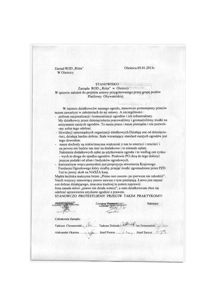01eśnica.03.01.2013r. Zarząd ROD „Róża W Oleśnicy STANOWISKO Zarządu ROD „ Róża" w Oleśnicy W sprawie założeń do projektu ustawy przygotowanego przez grupę posłów Platformy Obywatelskiej W imieniu działkowców naszego ogrodu, stanowczo protestujemy przeciw tezom zawartym w założeniach do tej ustawy. A szczególności : - próbom nacjonalizacji i komunalizacji ogrodów i ich infrastruktury. My działkowcy przez dziesięciolecia pracowaliśmy i gromadziliśmy środki na utrzymanie naszych ogrodów. To nasza praca i nasze pieniądze i nie pozwoli-my sobie tego odebrać. - likwidacji samorządnych organizacji działkowych.Działają one od dziesięcio-leci, działają bardzo dobrze. Stale wzrastający standard naszych ogrodów jest tego dowodem. - nasze dochody są niskie/znaczna większość z nas to emeryci i renciści/ i na pewno nie będzie nas stać na dodatkowe i to niemałe opłaty. Nałożenie dodatkowych opłat za użytkowanie ogrodu i to według cen rynko- wych to droga do upadku ogrodów. Posłowie PO chcą do tego dołożyć jeszcze podatki od altan i budynków ogrodowych. - kuriozalnym wręcz pomysłem jest propozycja utworzenia Krajowego Funduszu Ogrodowego który miałby przejąć środki zgromadzone przez PZD. Toż to jawny skok na NASZĄ kasę. Mądra łacińska maksyma brzmi „Primo non nocere- po pierwsze nie szkodzić". Niech wszyscy stanowiący prawo zawsze o tym pamiętają. Łatwo jest zepsuć coś dobrze działającego, znacznie trudniej to potem naprawić. Inna zasada mówi „prawo nie działa wstecz", a nam działkowcom chce się odebrać uprawnienia uzyskane zgodnie z prawem. STANOWCZO PROTESTUJEMY PRZECIW TAKIM PRAKTYKOM!!! Sekretarz Członkowie Zarządu: Tadeusz Chrzanowski4..i.V. 1Ci -: Tadeusz Dolniak W/^ś- Aleksander Okarma Józef Pietrus ^ n i..hyt,.. } ... JózefZarycz ....^.'...¿f. V