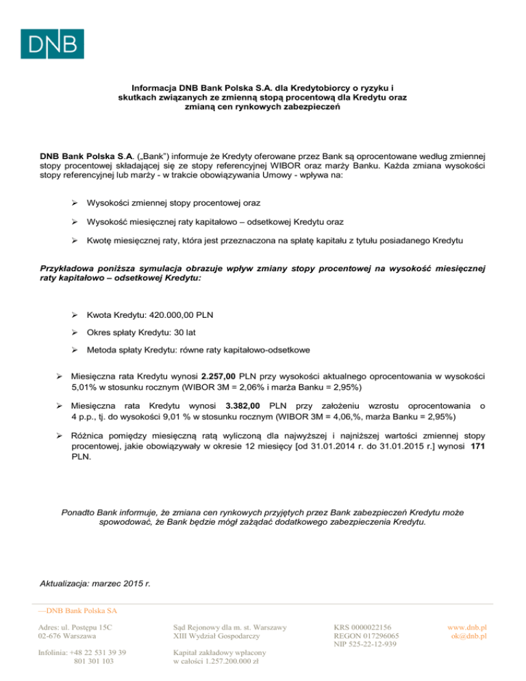 Informacja DNB Bank Polska S.A. dla Kredytobiorcy o ryzyku i skutkach związanych ze zmienną stopą procentową dla Kredytu oraz zmianą cen rynkowych zabezpieczeń DNB Bank Polska S.A. („Bank”) informuje że Kredyty oferowane przez Bank są oprocentowane według zmiennej stopy procentowej składającej się ze stopy referencyjnej WIBOR oraz marży Banku. Każda zmiana wysokości stopy referencyjnej lub marży - w trakcie obowiązywania Umowy - wpływa na: Wysokości zmiennej stopy procentowej oraz Wysokość miesięcznej raty kapitałowo – odsetkowej Kredytu oraz Kwotę miesięcznej raty, która jest przeznaczona na spłatę kapitału z tytułu posiadanego Kredytu Przykładowa poniższa symulacja obrazuje wpływ zmiany stopy procentowej na wysokość miesięcznej raty kapitałowo – odsetkowej Kredytu: Kwota Kredytu: 420.000,00 PLN Okres spłaty Kredytu: 30 lat Metoda spłaty Kredytu: równe raty kapitałowo-odsetkowe Miesięczna rata Kredytu wynosi 2.257,00 PLN przy wysokości aktualnego oprocentowania w wysokości 5,01% w stosunku rocznym (WIBOR 3M = 2,06% i marża Banku = 2,95%) Miesięczna rata Kredytu wynosi 3.382,00 PLN przy założeniu wzrostu oprocentowania 4 p.p., tj. do wysokości 9,01 % w stosunku rocznym (WIBOR 3M = 4,06,%, marża Banku = 2,95%) o Różnica pomiędzy miesięczną ratą wyliczoną dla najwyższej i najniższej wartości zmiennej stopy procentowej, jakie obowiązywały w okresie 12 miesięcy [od 31.01.2014 r. do 31.01.2015 r.] wynosi 171 PLN. Ponadto Bank informuje, że zmiana cen rynkowych przyjętych przez Bank zabezpieczeń Kredytu może spowodować, że Bank będzie mógł zażądać dodatkowego zabezpieczenia Kredytu. Aktualizacja: marzec 2015 r. —DNB Bank Polska SA Adres: ul. Postępu 15C 02-676 Warszawa Sąd Rejonowy dla m. st. Warszawy XIII Wydział Gospodarczy Infolinia: +48 22 531 39 39 801 301 103 Kapitał zakładowy wpłacony w całości 1.257.200.000 zł KRS 0000022156 REGON 017296065 NIP 525-22-12-939 www.dnb.pl [email protected]