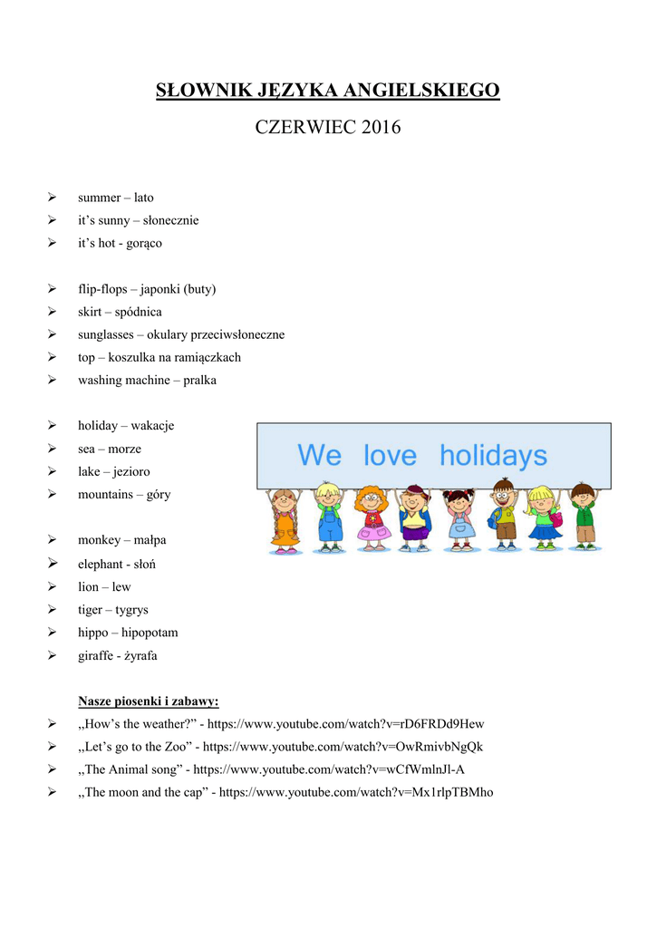 SŁOWNIK JĘZYKA ANGIELSKIEGO CZERWIEC 2016 summer – lato it’s sunny – słonecznie it’s hot - gorąco flip-flops – japonki (buty) skirt – spódnica sunglasses – okulary przeciwsłoneczne top – koszulka na ramiączkach washing machine – pralka holiday – wakacje sea – morze lake – jezioro mountains – góry monkey – małpa elephant - słoń lion – lew tiger – tygrys hippo – hipopotam giraffe - żyrafa Nasze piosenki i zabawy: ,,How’s the weather?” - https://www.youtube.com/watch?v=rD6FRDd9Hew ,,Let’s go to the Zoo” - https://www.youtube.com/watch?v=OwRmivbNgQk ,,The Animal song” - https://www.youtube.com/watch?v=wCfWmlnJl-A ,,The moon and the cap” - https://www.youtube.com/watch?v=Mx1rlpTBMho