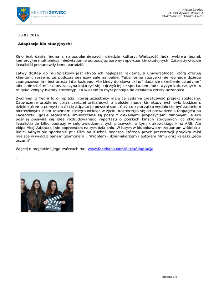 Miasto Żywiec 34-300 Żywiec, Rynek 2 33-475-42-00, 33-475-42-01 10.03.2016 Adaptacja kin studyjnych! Kino jest dzisiaj jedną z najpopularniejszych dziedzin kultury. Większość ludzi wybiera jednak komercyjne multipleksy, nieświadomie odrzucając barwny repertuar kin studyjnych. Cztery żywieckie licealistki postanowiły temu zaradzić. Łatwy dostęp do multipleksów jest chyba ich najlepszą reklamą, a uniwersalność, którą oferują klientom, sprawia, że podczas seansów sale są pełne. Taka forma rozrywki nie wymaga dużego zaangażowania - jest prosta i dla każdego. Ale kiedy do słowa „kino” doda się określenie „studyjne” albo „niezależne”, seans zaczyna kojarzyć się najczęściej ze spotkaniem ludzi wyżyn kulturalnych. A to tylko kolejny błędny stereotyp. To właśnie ta myśl pchnęła do działania cztery uczennice. Zwolnieni z Teorii to olimpiada, której uczestnicy mają za zadanie zrealizować projekt społeczny. Zauważenie problemu coraz częściej znikających z polskiej mapy kin studyjnych było bodźcem, dzięki któremu pomysł na Akcję Adpatację powstał sam. Coś, co z początku wydało się być zadaniem niemożliwym, z entuzjazmem zaczęto wcielać w życie. Rozpoczęło się od prowadzenia fanpage'a na Facebooku, gdzie regularnie umieszczane są posty z ciekawymi propozycjami filmowymi. Nieco później pojawiła się idea rozbudowanego reportażu o polskich kinach studyjnych, co skłoniło licealistki do kilku podróży w celu zwiedzenia tych placówek, w tym krakowskiego kina ARS. Ale ekipa Akcji Adpatacji nie poprzestała na tym działaniu. W lutym w klubokawiarni Aquarium w BielskuBiałej odbyło się spotkanie pt.: Film od Kuchni, podczas którego prócz prezentacji projektu miał miejsce wywiad z panem Szymonem J. Wróblem - dziennikarzem i autorem filmu oraz książki „Jego oczami”. Więcej o projekcie i jego twórcach na: www.facebook.com/AkcjaAdaptacja Strona 1/1 Powered by TCPDF (www.tcpdf.org)