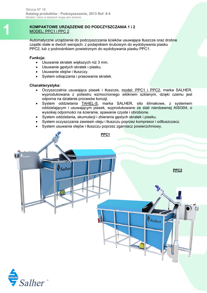 Strona Nº 18 Katalog produktów - Podczyszczanie, 2013 Ref: 8-4 Modele i dane w tabelach mogą ulec zmianie. KOMPAKTOWE URZĄDZENIE DO PODCZYSZCZANIA 1 i 2 MODEL: PPC1 i PPC 2 Automatyczne urządzenie do podczyszczania ścieków usuwające tłuszcze oraz drobne cząstki stałe w dwóch wersjach: z podajnikiem śrubowym do wydobywania piasku PPC2, lub z podnośnikiem powietrznym do wydobywania piasku PPC1. Funkcja: Usuwanie skratek większych niż 3 mm. Usuwanie gęstych skratek i piasku. Usuwanie olejów i tłuszczy. System odsączania i prasowania skratek. Charakterystyka: Oczyszczalnia usuwająca piasek i tłuszcze, model: PPC1 i PPC2, marka SALHER, wyprodukowana z poliestru wzmocnionego włóknem szklanym, dzięki czemu jest odporna na działanie procesów korozji. System oddzielania TAHEL-S, marka SALHER, sito ślimakowe, z systemem oddzielającym i usuwającym piasek, wyprodukowane ze stali nierdzewnej AISI304, o wysokiej odporności na ścieranie, spawanie czyste i obrobione. System oddzielania, akumulacji i zbierania gęstych skratek i piasku. System oczyszczania zawiesin oleju i tłuszczu poprzez kompresor i odtłuszczacz. System usuwania olejów i tłuszczu poprzez zgarniacz powierzchniowy. PPC1 PPC2 R Strona Nº 19 Katalog produktów - Podczyszczanie, 2013 Ref: 8-4 Modele i dane w tabelach mogą ulec zmianie. KOMPAKTOWE URZĄDZENIE DO PODCZYSZCZANIA 1 i 2 MODEL: PPC1 i PPC 2 SYSTEM SEPARACJI SKRATEK PPC1 i PPC2: Sito ślimakowe z odsączaniem zamontowane w obudowie, zawierające system transportujący i kompaktujący skratki. Posiada system czyszczący strefy roboczej (separującej skratki) złożony z elektrozaworu i dysz zraszających. SYSTEM SEPARACJI PIASKU PPC1 i PPC2: Podłużny zbiornik usuwania piasku, o wytrzymałej konstrukcji, wyposażony w demontowaną pokrywę, z systemem wtrysku powietrza w celu separacji części organicznych z piasku i wspomagania procesu flotacji substancji tłuszczowych. USUWANIE OSADÓW ZA POMOCĄ PODNOŚNIKA POWIETRZNEGO PPC1: Usuwanie osadów za pomocą systemu AIR-LIFT uruchamianego przez kompresor powietrza przystosowany do instalacji sieciowych o niskich napływach osadów. Opcjonalnie można dołączyć urządzenie odwadniające typu FILSA. USUWANIE OSADÓW ZA POMOCĄ PODNOŚNIKA ŚLIMAKOWEGO PPC2: Usuwanie osadów za pomocą śruby ślimakowej wykonanej ze stali o wysokiej odporności. Obudowa urządzenia wykonana jest zestali nierdzewnej AISI 304. Przystosowany do instalacji sieciowych o dużych napływach osadów. SYSTEM ODTŁUSZCZANIA W PPC1 i PPC2: Odtłuszczacz boczny, równoległy do piaskownika z automatycznym zgarniaczem separującym tłuszcze. R Strona Nº 20 Katalog produktów - Podczyszczanie, 2013 Ref: 8-4 Modele i dane w tabelach mogą ulec zmianie. KOMPAKTOWE URZĄDZENIE DO PODCZYSZCZANIA 1 i 2 MODEL: PPC1 i PPC 2 MODEL: PPC1 Z podnośnikiem powietrznym do wydobywania piasku MODEL Q Max [m3/h] DŁUG. SZEROK. WYS. [mm] [mm] [mm] PODŁĄCZENIA PPC 1 – 1 11.0 4868 932 3413 125/125/63/110 GRP / AISI 304 Moc zainstalowana [kW] 0,93 PPC 1 – 2 22.0 5368 932 3413 160/160/63/110 GRP / AISI 304 0,93 PPC 1 – 3 44.0 6168 1383 4453 200/200/63/110 GRP / AISI 304 1,03 PPC 1 – 4 88.0 7165 1383 4453 200/200/63/110 GRP / AISI 304 1,03 PPC 1 – 5 130.0 7868 1582 4828 250/250/63/110 GRP / AISI 304 1,94 PPC 1 – 6 173.0 8800 1582 4828 315/315/63/110 GRP / AISI 304 1,94 MATERIAŁ PPC / SITO Wlot/Wylot/ Opróżn./Wyładunek MATERIAŁ PPC / SITO [mm] MODEL: PPC2 Z podajnikiem śrubowym do wydobywania piasku MODEL Q Max [m3/h] DŁUG. SZEROK. WYS. [mm] [mm] [mm] PODŁĄCZENIA PPC 2 – 1 11.0 4868 932 3413 125/125/63/110 GRP / AISI 304 Moc zainstalowana [kW] 1,48 PPC 2 – 2 22.0 5368 932 3413 160/160/63/110 GRP / AISI 304 1,48 PPC 2 – 3 44.0 6168 1383 4453 200/200/63/110 GRP / AISI 304 1,58 PPC 2 – 4 88.0 7165 1383 4453 200/200/63/110 GRP / AISI 304 1,58 PPC 2 – 5 130.0 7868 1582 4828 250/250/63/110 GRP / AISI 304 3,04 PPC 2 – 6 173.0 8800 1582 4828 315/315/63/110 GRP / AISI 304 3,04 Wlot/Wylot/ Opróżn./Wyładunek [mm] UWAGA: MAKSYMALNY PRZEPŁYW DLA ŚCIEKÓW BYTOWYCH Materiały i podłączenia sita ślimakowego oraz podajnika śrubowego piasku PODŁĄCZENIA MODEL Model TAHEL MODEL Model TAHELPB PPC 1 – 1 TA-HEL200SP PPC 2 – 1 PB1500 [mm] 125/125 PPC 1 – 2 TA-HEL200SP PPC 2 – 2 PB1500 160/160 AISI 304 PPC 1 – 3 TA-HEL200 PPC 2 – 3 PB2000 200/200 AISI 304 PPC 1 – 4 TA-HEL200 PPC 2 – 4 PB2000 200/200 AISI 304 PPC 1 – 5 TA-HEL400 PPC 2 – 5 PB2500 250/250 AISI 304 PPC 1 – 6 TA-HEL400 PPC 2 – 6 PB2500 250/250 AISI 304 Wlot / Wylot UWAGA: Urządzenia dostarczane są zmontowane i są przeznaczone do transportu w standardowych kontenerach morskich. R MATERIAŁ AISI 304