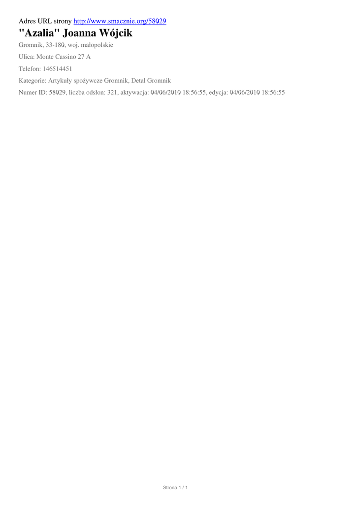 Adres URL strony http://www.smacznie.org/58029 "Azalia" Joanna Wójcik Gromnik, 33-180, woj. małopolskie Ulica: Monte Cassino 27 A Telefon: 146514451 Kategorie: Artykuły spożywcze Gromnik, Detal Gromnik Numer ID: 58029, liczba odsłon: 321, aktywacja: 04/06/2010 18:56:55, edycja: 04/06/2010 18:56:55 Strona 1 / 1