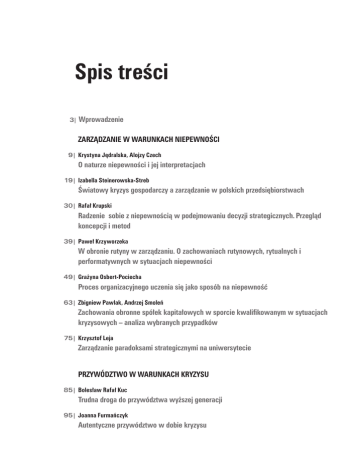 Spis treści 3| Wprowadzenie ZARZĄDZANIE W WARUNKACH NIEPEWNOŚCI 9 | Krystyna Jędralska, Alojzy Czech O naturze niepewności i jej interpretacjach 19 | Izabella Steinerowska-Streb Światowy kryzys gospodarczy a zarządzanie w polskich przedsiębiorstwach 30 | Rafał Krupski Radzenie sobie z niepewnością w podejmowaniu decyzji strategicznych. Przegląd koncepcji i metod 39 | Paweł Krzyworzeka W obronie rutyny w zarządzaniu. O zachowaniach rutynowych, rytualnych i performatywnych w sytuacjach niepewności 49 | Grażyna Osbert-Pociecha Proces organizacyjnego uczenia się jako sposób na niepewność 63 | Zbigniew Pawlak, Andrzej Smoleń Zachowania obronne spółek kapitałowych w sporcie kwalifikowanym w sytuacjach kryzysowych – analiza wybranych przypadków 75 | Krzysztof Leja Zarządzanie paradoksami strategicznymi na uniwersytecie PRZYWÓDZTWO W WARUNKACH KRYZYSU 85 | Bolesław Rafał Kuc Trudna droga do przywództwa wyższej generacji 95 | Joanna Furmańczyk Autentyczne przywództwo w dobie kryzysu 102 | Sławomir Winch Kulturowe uwarunkowania przywództwa w przedsiębiorstwie – wyniki badań 114 | Krzysztof Walczak Prawne aspekty zatrudniania pracowników w czasie kryzysu ANALIZY PRZYPADKÓW 124 | Wojciech Góral Raport o zarządzaniu w spółdzielni – przed, w trakcie i po wystąpieniu sytuacji kryzysowej 138 | Grażyna Paulina Wójcik Związek zmian organizacyjnych i strukturalnych w sektorze elektroenergetycznym z potrzebą poprawy jakości wykonywanych usług 152 | I S S U E S U M M A R Y MBA 3/2011 | Wprowadzenie | 3 | „Master of Business Administration” 3/2011 (110): s. 3–8, ISSN 1231-0328, Copyright by Akademia Leona Koźmińskiego Wprowadzenie Przedsiębiorstwa, a także inne organizacje, działają w warunkach nieustannych zmian makro i mikroekonomicznych. Wywoływana przez nie niepewność1 związana jest głównie z: 1) pojawianiem się zróżnicowanych czynników, kształtujących warunki produkcji, wymiany i wywierających tym samym – nie zawsze dokładnie dający się przewidzieć – wpływ na działalność podmiotu gospodarczego, 2) utrudnioną – w związku z ich zmiennością – identyfikacją i diagnozą tych czynników, 3) koniecznością szybkiego dostosowywania metod pracy (w tym nawyków i przyzwyczajeń pracowników) i zarządzania, do warunków obowiązujących w zmiennym otoczeniu. Dynamicznie zmieniające się uwarunkowania powodują, że przedsiębiorstwa zmuszone są baczniej obserwować swoje otoczenie oraz umiejętnie (elastycznie oraz efektywnie) na nie reagować. Różnorodne instrumenty, narzędzia i metody, wypracowane przez teorię, a także tzw. dobre praktyki, jak radzić sobie w takich trudnych sytuacjach, stoją do dyspozycji zarządzających. Z zaleceń teorii nauk o zarządzaniu, a także wspomnianych dobrych praktyk zarządczych wynika, że w każdych warunkach należy dostosować się do zmian w miarę szybko, inteligentnie i racjonalnie. Menedżerowie zmuszani są zatem analizować i oceniać zdarzenia dwutorowo, równolegle diagnozować czynniki destabilizujące, identyfikując je zarówno w otoczeniu, jak i wnętrzu przedsiębiorstwa. Umiejętne zarządzanie przedsiębiorstwem nie polega na biernym reagowaniu na zmieniające się otoczenie i zastosowaniu przez adaptację na gruncie przedsiębiorstwa, metod sprawdzonych, i wykorzystanych przez konkurencję, ale na wyjściu naprzeciw przyszłym potrzebom rynku, na umiejętnej adaptacji i wykorzystaniu metod rewolucyjnych, oryginalnych i nowych, stanowiących dla konkurencji istotne zaskoczenie. Warunki ekonomiczne to tylko jeden aspekt zarządzania przedsiębiorstwem. Drugi biegun stanowi dążenie do osiągania przez przedsiębiorstwo tego, co leży w jego interesie, czyli kształtowania środowiska ekonomicznego, planowania, inicjowania i przeprowadzania zmian w tym środowisku na własne potrzeby. W konsekwencji można stwierdzić, że nowoczesne zarządzanie – w turbulentnie zmiennych warunkach – jest wędrówką przez chaos i nieporządek wywoływanych niepewnością, konstru1 Niepewność zazwyczaj definiowana jest jako możliwość powstania odchyleń od zamierzonych efektów działania, przy czym odchylenia te nie mogą być przewidziane z żadnym określonym stopniem prawdopodobieństwa (Wierzbińska M. (1996), Ryzyko w gospodarce rynkowej. Lublin: Wydawnictwo Uniwersytetu M. Curie-Skłodowskiej, s. 12). Niepewność można określić także jako wątpliwość człowieka dotyczącą zdolności przewidywania, które z możliwych zdarzeń nastąpi (Williams C.A. Jr,. Heine R.M. (1981) Risk Management and Insurance. McGraw-Hill Books Company, IV wyd. 81, s. 8). 4 | Wprowadzenie | MBA 3/2011 owaniem rzeczywistości z dostępnych zarządzającemu elementów, pomysłów, ludzi i relacji m.in., instytucji formalno-prawnych, środków materialnych i pieniężnych oraz praw do dysponowania nimi tak, aby osiągnąć zamierzone cele rozwojowe. Nie jest prawdą, że między zmianami warunków zewnętrznych a decyzjami (strategiami) zarządów i właścicieli przedsiębiorstw zachodzi prosty związek przyczynowo-skutkowy. Samodzielność bądź przynajmniej autonomia decyzyjna powoduje, że przedsiębiorstwa zachowują się w różny sposób, różniący się poziomem wrażliwości na zmiany w otoczeniu. Dokonywanie zmian pozostaje w sprzeczności z powszechnie odczuwaną przez ludzi potrzebą pewności i bezpieczeństwa. Dotychczasowe sposoby zarządzania przedsiębiorstwem oraz jego formy organizacyjne nastawione są na unikanie niepewności2. Niestety warunkiem zastosowania form zarządzania przedsiębiorstwem, adekwatnych do nowej sytuacji (zwiększonej skali niepewności) jest zasadnicza zmiana kulturowa, polegająca na przejściu od kultury organizacyjnej sprzyjającej unikaniu niepewności do kultury ułatwiającej wysoką tolerancję niepewności w środowisku społecznym przedsiębiorstwa. Wzorce kulturowe wspierające tradycyjne systemy organizacyjne sprzyja