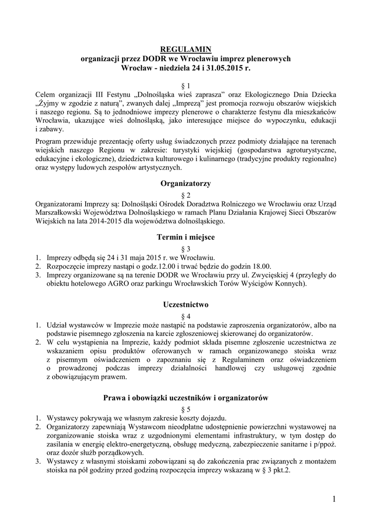 REGULAMIN organizacji przez DODR we Wrocławiu imprez plenerowych Wrocław - niedziela 24 i 31.05.2015 r. §1 Celem organizacji III Festynu „Dolnośląska wieś zaprasza” oraz Ekologicznego Dnia Dziecka „Żyjmy w zgodzie z naturą”, zwanych dalej „Imprezą” jest promocja rozwoju obszarów wiejskich i naszego regionu. Są to jednodniowe imprezy plenerowe o charakterze festynu dla mieszkańców Wrocławia, ukazujące wieś dolnośląską, jako interesujące miejsce do wypoczynku, edukacji i zabawy. Program przewiduje prezentację oferty usług świadczonych przez podmioty działające na terenach wiejskich naszego Regionu w zakresie: turystyki wiejskiej (gospodarstwa agroturystyczne, edukacyjne i ekologiczne), dziedzictwa kulturowego i kulinarnego (tradycyjne produkty regionalne) oraz występy ludowych zespołów artystycznych. Organizatorzy §2 Organizatorami Imprezy są: Dolnośląski Ośrodek Doradztwa Rolniczego we Wrocławiu oraz Urząd Marszałkowski Województwa Dolnośląskiego w ramach Planu Działania Krajowej Sieci Obszarów Wiejskich na lata 2014-2015 dla województwa dolnośląskiego. Termin i miejsce §3 1. Imprezy odbędą się 24 i 31 maja 2015 r. we Wrocławiu. 2. Rozpoczęcie imprezy nastąpi o godz.12.00 i trwać będzie do godzin 18.00. 3. Imprezy organizowane są na terenie DODR we Wrocławiu przy ul. Zwycięskiej 4 (przyległy do obiektu hotelowego AGRO oraz parkingu Wrocławskich Torów Wyścigów Konnych). Uczestnictwo §4 1. Udział wystawców w Imprezie może nastąpić na podstawie zaproszenia organizatorów, albo na podstawie pisemnego zgłoszenia na karcie zgłoszeniowej skierowanej do organizatorów. 2. W celu wystąpienia na Imprezie, każdy podmiot składa pisemne zgłoszenie uczestnictwa ze wskazaniem opisu produktów oferowanych w ramach organizowanego stoiska wraz z pisemnym oświadczeniem o zapoznaniu się z Regulaminem oraz oświadczeniem o prowadzonej podczas imprezy działalności handlowej czy usługowej zgodnie z obowiązującym prawem. Prawa i obowiązki uczestników i organizatorów §5 1. Wystawcy pokrywają we własnym zakresie koszty dojazdu. 2. Organizatorzy zapewniają Wystawcom nieodpłatne udostępnienie powierzchni wystawowej na zorganizowanie stoiska wraz z uzgodnionymi elementami infrastruktury, w tym dostęp do zasilania w energię elektro-energetyczną, obsługę medyczną, zabezpieczenie sanitarne i p/ppoż. oraz dozór służb porządkowych. 3. Wystawcy z własnymi stoiskami zobowiązani są do zakończenia prac związanych z montażem stoiska na pół godziny przed godziną rozpoczęcia imprezy wskazaną w § 3 pkt.2. 1 4. Demontaż stoisk przez wystawców jest możliwy po godzinie zakończenia imprezy wskazanej w § 3 pkt.2. 5. Zespoły Artystyczne, biorące udział w Imprezie pokrywają we własnym zakresie koszty ewentualnego ubezpieczenia od odpowiedzialności cywilnej, w tym odpowiedzialności za naruszenie praw autorskich osób trzecich oraz niedokonanie stosownej opłaty za publiczne wykonywanie utworów i muzyki ludowej albo utworów prawnie chronionych, na rzecz właściwych i licencjonowanych, przez Min. Kultury i Sztuki, instytucji. 6. Organizatorzy zapewniają Zespołom Artystycznym, biorącym udział w imprezie (zgodnie z kosztorysem Imprezy) zwrot kosztów poniesionych w związku z dojazdem i występem na estradzie w wys. 500 zł netto oraz posiłek i napoje (na podstawie przydzielonych talonów). 7. Występy odbywać się będą z wykorzystaniem sprzętu nagłośniającego zapewnionego przez organizatorów tj. mikrofony bezprzewodowe, mikrofony przewodowe, odtwarzacz DVD. 8. Impreza prowadzona będzie przez konferansjera zatrudnionego przez Organizatorów. Uprawnienia członków służb porządkowych §6 1. Służby porządkowe zorganizowane przez organizatora, w celu realizacji powierzonych im zadań, są uprawnione do sprawdzania uprawnień do przebywania na imprezie, legitymowania osób, wydawania poleceń porządkowych osobom zakłócającym porządek publiczny lub zachowującym się niezgodnie z regulaminem imprezy. 2. W przypadku stwierdzenia braku uprawnień do przebywania na imprezie lub niewykonania polecenia porządkowego służby mają prawo wezwać daną osobę do opuszczenia imprezy. 3. Służby wykonując swoje zadania muszą się posługiwać i legitymować odpowiednimi identyfikatorami. Sprawy różne 1. 2. 3. 4. 5. 6. §7 Każdy z uczestniczących Imprezy ma obowiązek respektować polecenia Organizatorów, w celu zapewnienia sprawnego przebiegu jak również bezpieczeństwa publicznego przedmiotowej imprezy otwartej. Ze względów bezpieczeństwa w trakcie trwania imprezy w godzinach wskazanych w § 3 pkt.2, zabrania się wystawowym poruszania po terenie pojazdami samochodowymi. Organizatorzy nie zapewniają wystawcom innych rzeczy wyraźnie nie zaznaczonych w nin. Regulaminie. Prawo interpretacji niniejszego regulaminu i wydawania zarządzeń organizacyjnych przysługuje wyłącznie organizatorom, które przekazywane będą uczestnikom Imprezy i publiczności za pośrednictwem konferansjera prowadzącego. W sprawach spornych lub nieuregulowanych niniejszym Regulaminem zastosowanie będą miały przepisy ustawy o organizacji imprez artystycznych i rozrywkowych oraz kodeksu cywilnego. W razie roszczeń finansowych sądem właściwym będzie sąd miejscowo i rzeczowo właściwy dla siedziby DODR we Wrocławiu. 2