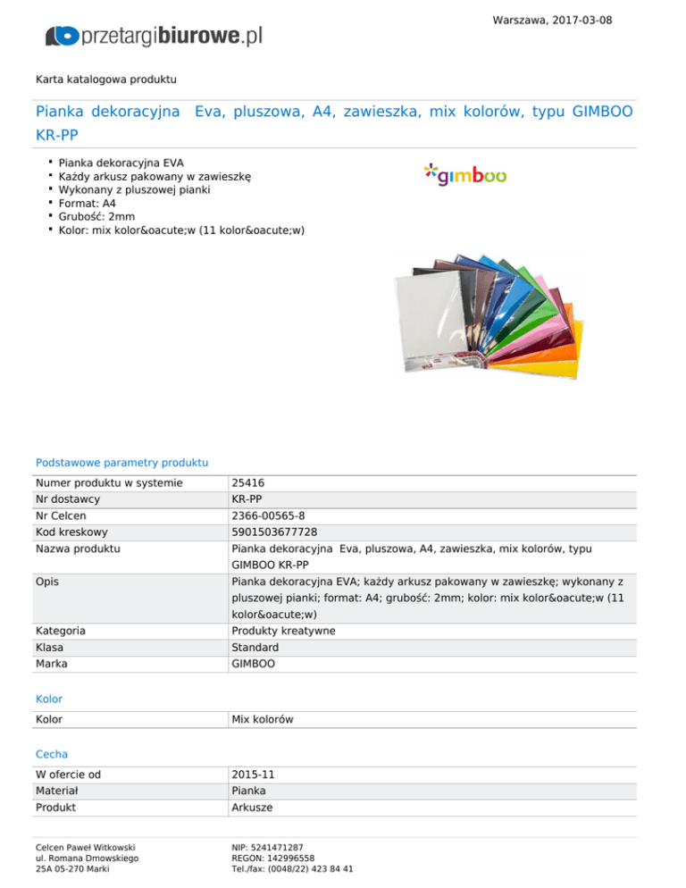 Warszawa, 2017-03-08 Karta katalogowa produktu Pianka dekoracyjna Eva, pluszowa, A4, zawieszka, mix kolorów, typu GIMBOO KR-PP Pianka dekoracyjna EVA Każdy arkusz pakowany w zawieszkę Wykonany z pluszowej pianki Format: A4 Grubość: 2mm Kolor: mix kolorów (11 kolorów) Podstawowe parametry produktu Numer produktu w systemie 25416 Nr dostawcy KR-PP Nr Celcen 2366-00565-8 Kod kreskowy 5901503677728 Nazwa produktu Pianka dekoracyjna Eva, pluszowa, A4, zawieszka, mix kolorów, typu GIMBOO KR-PP Opis Pianka dekoracyjna EVA; każdy arkusz pakowany w zawieszkę; wykonany z pluszowej pianki; format: A4; grubość: 2mm; kolor: mix kolorów (11 kolorów) Kategoria Produkty kreatywne Klasa Standard Marka GIMBOO Kolor Kolor Mix kolorów Cecha W ofercie od 2015-11 Materiał Pianka Produkt Arkusze Celcen Paweł Witkowski ul. Romana Dmowskiego 25A 05-270 Marki NIP: 5241471287 REGON: 142996558 Tel./fax: (0048/22) 423 84 41 Warszawa, 2017-03-08 Karta katalogowa produktu cd. Pianka dekoracyjna Eva, pluszowa, A4, zawieszka, mix kolorów, typu GIMBOO KR-PP Rodzaj EVA Typ Pluszowe Wymiary Format A4 Grubość (mm) 2 Szerokość (mm) 210 Wymiary (mm) 210x297 Wysokość (mm) 297 Certyfikaty Hit Standard Nowy produkt w ofercie Standard Wspólny słownik zamówień CPV 30197600-2 Papier i tektura gotowe Jesteśmy przekonani, że z pomocą przetargibiurowe.pl usprawnicie Państwo własne procesy biznesowe związane ze żmudnym poszukiwaniem odpowiadających Państwu produktów oraz opracowaniem specyfikacjii zapytań ofertowych. Serdecznie zapraszamy do wspópracy Zespół, PrzetargiBiurowe.pl Celcen Paweł Witkowski ul. Romana Dmowskiego 25A 05-270 Marki NIP: 5241471287 REGON: 142996558 Tel./fax: (0048/22) 423 84 41