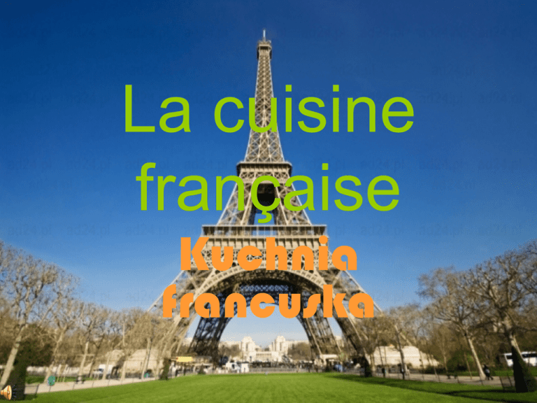 La cuisine française Kuchnia francuska Kuchnia francuska jest uważana za jedną z najlepszych na świecie. Najczęściej kojarzona jest z żabimi udkami, ślimakami, bagietkami, serami i winami. (na zdj. Żabie udka) Śniadanie (petit déjeuner) • Maślany rogalik-‐ croissant • Ciepła bułeczka z masłem-‐ brioche • Kawałek bagietki • Kromka chleba z masłem i dżemem • Ciastko z café au lait, czyli gorącą kawą z mlekiem albo małą czarną lub gorącą czekoladą (na zdj. Croissant) Obiad (déjeuner) • Przystawki, danie główne, deser. • Duży posiłek o tej porze dnia jest podawany w regionach wiejskich. • W miastach na lunch składa się raczej kanapka, sałatka, omlet lub inny mały posiłek w kawiarni lub w domu. (na zdj. Filet mignon) Kolacja (dîner) • Składa się z co najmniej trzech potraw. • Przystawka, zupa sałatka, danie z jaj lub terrine. • Do kolacji podaje się również sery i/lub deser. (na zdj. soupe au pistou- zupa jarzynowa z pistou) Typy lokali gastronomicznych • Auberge-‐gospoda • Bistrot-‐nieduża restauracja z niedużym wyborem dań • Brasserie-‐piwiarnia • Café-‐kawiarnia serwująca napoje • Crêperie-‐restauracja serwująca naleśniki • Restaurant-‐restauracja serwująca tzw. Haute cuisine(wysoka kuchnia) • Routier-‐zajazd przydrożny Kuchnie regionalne • Pikardia-‐ zupy jarzynowe, suflet czosnkowy, pasztet z kaczych wątróbek, tarta z rabarbarem, krem chantilly. • Alzacja-‐ wina, piwa, foie gras, ser munster. • Périgord-‐ trufle-‐ najdroższe grzyby na świecie. (na zdj. Flamique à porions-suflet czosnkowy) Kuchnie regionalne • Burgundia-‐ wina, boeuf bourguignon, musztarda Dijon, ślimaki (escargots). • Franche-‐Comté-‐ser comté z krowiego mleka. • Bretania-‐ owoce morza,cydr,naleśniki bretońskie. (na zdj. boeuf bourguignon) Kuchnie regionalne • Normandia-‐ owoce morza, zwłaszcza przegrzebki św. Jakuba, ser camembert, cydr i calvados. • Dolina Loary-‐ kozie sery, tarta jabłkowa, owoce, warzywa. • Prowansja-‐ owoce, warzywa, oliwki, ryby, zioła prowansalskie, zupa rybna, ratatouille, soupe au pistou. (na zdj. ratatouille) Francja to raj dla smakoszy serów. Francuskie sery zachwycają jakością, formą i niepowtarzalnym smakiem. (na zdj. camembert) Francja to kraj o bogatych tradycjach winiarskich. Wina z Francji na całym świecie traktowane są jako symbol dobrego smaku oraz doskonałej jakości. (na zdj. Chardonnay) Ślimaki-‐ escargots Tarta z jabłkami Maślana bułeczka „Brioche” Serek kozi w migdałach Foie gras Gougères -‐ ptysie serowe Sole Meunière Torcik truflowy z orzechami Pains aux Raisins -‐ drożdżówki z kremem i rodzynkami Crème brûlée Francuska bagietka Salmon en croûte Bouillabaisse Cassoulet Crepes Suzette Gruszki a la belle helene wykonała Klaudia Koperwas klasa II k