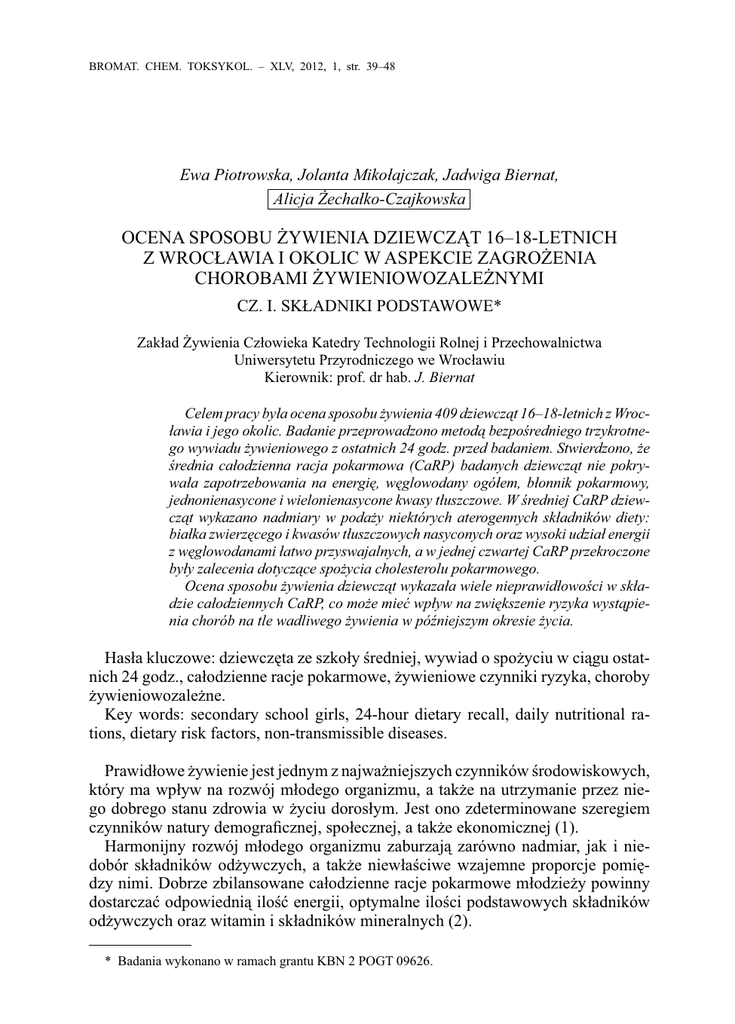 BROMAT. CHEM. TOKSYKOL. – XLV, 2012, 1, str. 39–48 Ewa Piotrowska, Jolanta Mikołajczak, Jadwiga Biernat, Alicja Żechałko-Czajkowska OCENA SPOSOBU ŻYWIENIA DZIEWCZĄT 16–18-LETNICH Z WROCŁAWIA I OKOLIC W ASPEKCIE ZAGROŻENIA CHOROBAMI ŻYWIENIOWOZALEŻNYMI CZ. I. SKŁADNIKI PODSTAWOWE* Zakład Żywienia Człowieka Katedry Technologii Rolnej i Przechowalnictwa Uniwersytetu Przyrodniczego we Wrocławiu Kierownik: prof. dr hab. J. Biernat Celem pracy była ocena sposobu żywienia 409 dziewcząt 16–18-letnich z Wrocławia i jego okolic. Badanie przeprowadzono metodą bezpośredniego trzykrotnego wywiadu żywieniowego z ostatnich 24 godz. przed badaniem. Stwierdzono, że średnia całodzienna racja pokarmowa (CaRP) badanych dziewcząt nie pokrywała zapotrzebowania na energię, węglowodany ogółem, błonnik pokarmowy, jednonienasycone i wielonienasycone kwasy tłuszczowe. W średniej CaRP dziewcząt wykazano nadmiary w podaży niektórych aterogennych składników diety: białka zwierzęcego i kwasów tłuszczowych nasyconych oraz wysoki udział energii z węglowodanami łatwo przyswajalnych, a w jednej czwartej CaRP przekroczone były zalecenia dotyczące spożycia cholesterolu pokarmowego. Ocena sposobu żywienia dziewcząt wykazała wiele nieprawidłowości w składzie całodziennych CaRP, co może mieć wpływ na zwiększenie ryzyka wystąpienia chorób na tle wadliwego żywienia w późniejszym okresie życia. Hasła kluczowe: dziewczęta ze szkoły średniej, wywiad o spożyciu w ciągu ostatnich 24 godz., całodzienne racje pokarmowe, żywieniowe czynniki ryzyka, choroby żywieniowozależne. Key words: secondary school girls, 24-hour dietary recall, daily nutritional rations, dietary risk factors, non-transmissible diseases. Prawidłowe żywienie jest jednym z najważniejszych czynników środowiskowych, który ma wpływ na rozwój młodego organizmu, a także na utrzymanie przez niego dobrego stanu zdrowia w życiu dorosłym. Jest ono zdeterminowane szeregiem czynników natury demograficznej, społecznej, a także ekonomicznej (1). Harmonijny rozwój młodego organizmu zaburzają zarówno nadmiar, jak i niedobór składników odżywczych, a także niewłaściwe wzajemne proporcje pomiędzy nimi. Dobrze zbilansowane całodzienne racje pokarmowe młodzieży powinny dostarczać odpowiednią ilość energii, optymalne ilości podstawowych składników odżywczych oraz witamin i składników mineralnych (2). * Badania wykonano w ramach grantu KBN 2 POGT 09626. 40 E. Piotrowska i inni Nr 1 Wyniki reprezentacyjnych ogólnokrajowych badań sposobu żywienia populacji polskiej z 2000 r., w tym populacji młodzieży, wykazują wysoką częstotliwość występowania żywieniowych czynników ryzyka zagrożenia zdrowia. Do najważniejszych należą: zbyt wysoka zawartość energii ogółem, zbyt duża podaż energii z tłuszczu ogółem i nasyconych kwasów tłuszczowych oraz zbyt duża zawartość cholesterolu, a zbyt niska błonnika pokarmowego w całodziennej racji pokarmowej (3). Monitorowanie sposobu żywienia młodzieży i edukacja żywieniowa umożliwią zniwelowanie błędów żywieniowych i sformułowanie odpowiednich zaleceń dietetycznych istotnych w prewencji chorób żywieniowozależnych (4). Celem pracy była ocena sposobu żywienia dziewcząt w wieku 16–18 lat w aspekcie zagrożenia chorobami żywieniowozależnymi w życiu dorosłym. MATERIAŁ I METODY Badania prowadzono w grupie 409 dziewcząt w wieku 16–18 lat ze szkół ponadginmazjalnych należących do Sieci Szkół Promujących Zdrowie we Wrocławiu. Średnia masa ciała dziewcząt, wyrażona za pomocą 50 percentyla, wynosiła 56 kg, a średni wzrost 1,65 m. Minimalne i maksymalne wartości masy ciała dziewcząt wynosiły odpowiednio 37 kg i 111 kg, a wzrostu 1,47 m i 1,82 m. Wartość 50 percentyla średniego wskaźnika wzrostowo-wagowego (BMI) wynosiła 20,5. Minimalna i maksymalna wartość BMI wynosiła odpowiednio 14,9 i 34,6. Do liceum ogólnokształcącego uczęszczało 47,4% dziewcząt, a do liceum zawodowego i technikum 52,6% dziewcząt. We Wrocławiu mieszkało 80,2% dziewcząt, natomiast 13,7% badanej grupy dojeżdżało z pobliskich wsi, a 6,1% z miasteczek. Rodzice badanych uczennic odznaczali się różnym poziomem wykształcenia. 90,0% dziewcząt miało jedno i więcej rodzeństwa. Ocenę składu średnich całodziennych racji pokarmowych (CaRP) dziewcząt przeprowadzono metodą trzykrotnego bezpośredniego wywiadu o spożyciu z ostatnich 24 godz. przed badaniem za pomocą programu komputerowego Dietetyk 2000 dla Windows 97. Bazę danych opracowano w Zakładzie Żywienia Człowieka UP we Wrocławiu na podstawie Tabel składu i wartości odżywczej produktów i potraw (5). Badanie dotyczyło dwóch dni roboczych i jednego dnia świątecznego. Do porównania z aktualnymi normami na poziomie średniego zapotrzebowania (EAR) dla badanej grupy dziewcząt przyjęto średnią masę ciała 56 kg i umiarkowaną aktywność fizyczną (4). Do oceny wielkości porcji produktów i potraw spożywanych przez badane dziewczęta wykorzystano Album fotografii produktów i potraw (6). Obliczono wartość energetyczną CaRP i średnią zawartość podstawowych składników odżywczych oraz udział energii, pochodzącej z białek, tłuszczów i węglowodanów wyrażony w procentach. Za optymalny, umownie przyjęto następujący udział energii z kwasów tłuszczowych w CaRP: nasycone kwasy tłuszczowe do 10%, jednonienasycone kwasy tłuszczowe 12%, wielonienasycone kwasy tłuszczowe 8%, a udział energii z tłuszczu do 30%. Zawartości składników odżywczych i energii w średniej CaRP mniejsze lub większe w stosunku do zaleceń o 10% nie były kwestionowane. Dla badanych racji obliczono także wskaźnik Keys’a uznawany za parametr oceniający aterogenność diety (7). Nr 1 Żywienie a zagrożenia chorobami żywieniowo zależnymi. Cz. I. 41 Obliczenia statystyczne wykonano programem Statistica 7,1 PL firmy St