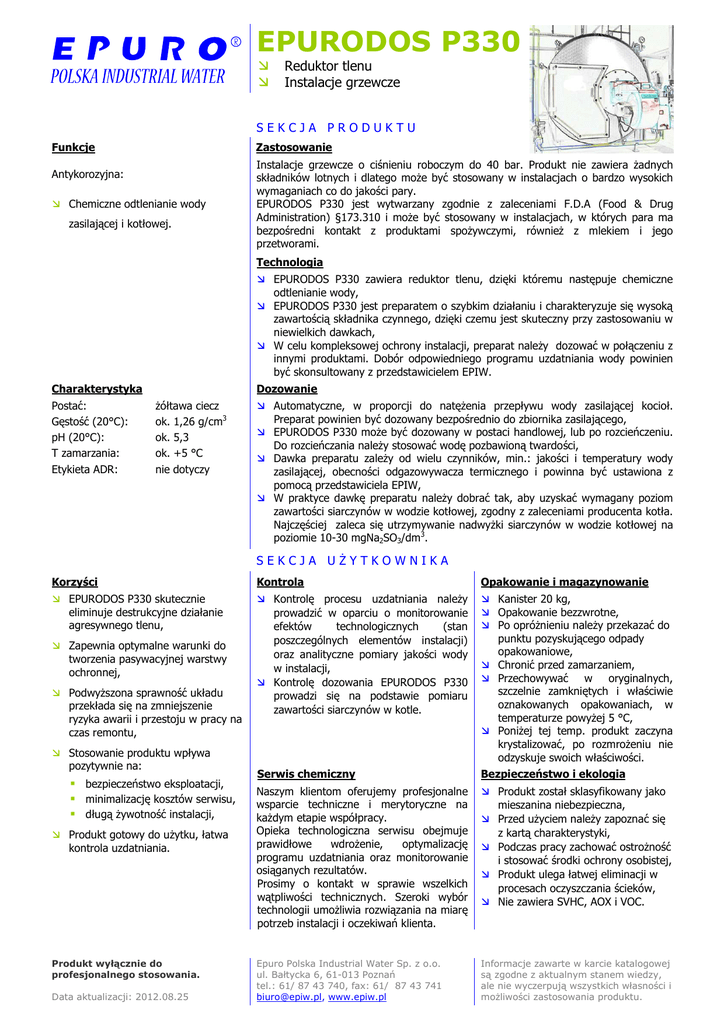 EPURODOS P330 Reduktor tlenu Instalacje grzewcze SEKCJA PRODUKTU Funkcje Zastosowanie Antykorozyjna: Chemiczne odtlenianie wody zasilającej i kotłowej. Instalacje grzewcze o ciśnieniu roboczym do 40 bar. Produkt nie zawiera Ŝadnych składników lotnych i dlatego moŜe być stosowany w instalacjach o bardzo wysokich wymaganiach co do jakości pary. EPURODOS P330 jest wytwarzany zgodnie z zaleceniami F.D.A (Food & Drug Administration) §173.310 i moŜe być stosowany w instalacjach, w których para ma bezpośredni kontakt z produktami spoŜywczymi, równieŜ z mlekiem i jego przetworami. Technologia EPURODOS P330 zawiera reduktor tlenu, dzięki któremu następuje chemiczne odtlenianie wody, EPURODOS P330 jest preparatem o szybkim działaniu i charakteryzuje się wysoką zawartością składnika czynnego, dzięki czemu jest skuteczny przy zastosowaniu w niewielkich dawkach, W celu kompleksowej ochrony instalacji, preparat naleŜy dozować w połączeniu z innymi produktami. Dobór odpowiedniego programu uzdatniania wody powinien być skonsultowany z przedstawicielem EPIW. Charakterystyka Postać: Gęstość (20°C): pH (20°C): T zamarzania: Etykieta ADR: Dozowanie Ŝółtawa ciecz ok. 1,26 g/cm3 ok. 5,3 ok. +5 °C nie dotyczy Automatyczne, w proporcji do natęŜenia przepływu wody zasilającej kocioł. Preparat powinien być dozowany bezpośrednio do zbiornika zasilającego, EPURODOS P330 moŜe być dozowany w postaci handlowej, lub po rozcieńczeniu. Do rozcieńczania naleŜy stosować wodę pozbawioną twardości, Dawka preparatu zaleŜy od wielu czynników, min.: jakości i temperatury wody zasilającej, obecności odgazowywacza termicznego i powinna być ustawiona z pomocą przedstawiciela EPIW, W praktyce dawkę preparatu naleŜy dobrać tak, aby uzyskać wymagany poziom zawartości siarczynów w wodzie kotłowej, zgodny z zaleceniami producenta kotła. Najczęściej zaleca się utrzymywanie nadwyŜki siarczynów w wodzie kotłowej na poziomie 10-30 mgNa2SO3/dm3. SEKCJA UśYTKOWNIKA Korzyści Kontrola Opakowanie i magazynowanie EPURODOS P330 skutecznie eliminuje destrukcyjne działanie agresywnego tlenu, Kontrolę procesu uzdatniania naleŜy prowadzić w oparciu o monitorowanie efektów technologicznych (stan poszczególnych elementów instalacji) oraz analityczne pomiary jakości wody w instalacji, Kontrolę dozowania EPURODOS P330 prowadzi się na podstawie pomiaru zawartości siarczynów w kotle. Kanister 20 kg, Opakowanie bezzwrotne, Po opróŜnieniu naleŜy przekazać do punktu pozyskującego odpady opakowaniowe, Chronić przed zamarzaniem, Przechowywać w oryginalnych, szczelnie zamkniętych i właściwie oznakowanych opakowaniach, w temperaturze powyŜej 5 °C, PoniŜej tej temp. produkt zaczyna krystalizować, po rozmroŜeniu nie odzyskuje swoich właściwości. Zapewnia optymalne warunki do tworzenia pasywacyjnej warstwy ochronnej, PodwyŜszona sprawność układu przekłada się na zmniejszenie ryzyka awarii i przestoju w pracy na czas remontu, Stosowanie produktu wpływa pozytywnie na: bezpieczeństwo eksploatacji, minimalizację kosztów serwisu, długą Ŝywotność instalacji, Produkt gotowy do uŜytku, łatwa kontrola uzdatniania. Produkt wyłącznie do profesjonalnego stosowania. Data aktualizacji: 2012.08.25 Serwis chemiczny Bezpieczeństwo i ekologia Naszym klientom oferujemy profesjonalne wsparcie techniczne i merytoryczne na kaŜdym etapie współpracy. Opieka technologiczna serwisu obejmuje prawidłowe wdroŜenie, optymalizację programu uzdatniania oraz monitorowanie osiąganych rezultatów. Prosimy o kontakt w sprawie wszelkich wątpliwości technicznych. Szeroki wybór technologii umoŜliwia rozwiązania na miarę potrzeb instalacji i oczekiwań klienta. Produkt został sklasyfikowany jako mieszanina niebezpieczna, Przed uŜyciem naleŜy zapoznać się z kartą charakterystyki, Podczas pracy zachować ostroŜność i stosować środki ochrony osobistej, Produkt ulega łatwej eliminacji w procesach oczyszczania ścieków, Nie zawiera SVHC, AOX i VOC. Epuro Polska Industrial Water Sp. z o.o. ul. Bałtycka 6, 61-013 Poznań tel.: 61/ 87 43 740, fax: 61/ 87 43 741 [email protected], www.epiw.pl Informacje zawarte w karcie katalogowej są zgodne z aktualnym stanem wiedzy, ale nie wyczerpują wszystkich własności i moŜliwości zastosowania produktu.