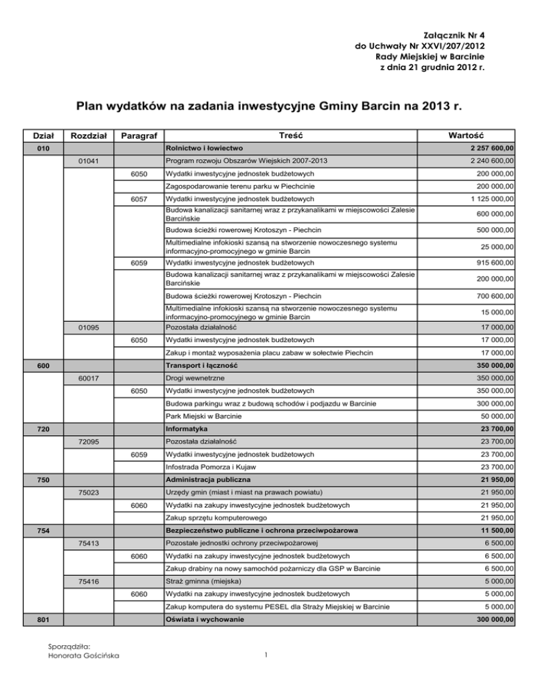 Załącznik Nr 4 do Uchwały Nr XXVI/207/2012 Rady Miejskiej w Barcinie z dnia 21 grudnia 2012 r. Plan wydatków na zadania inwestycyjne Gminy Barcin na 2013 r. Dział Rozdział Treść Paragraf 010 01041 6050 6057 2 257 600,00 Program rozwoju Obszarów Wiejskich 2007-2013 2 240 600,00 Wydatki inwestycyjne jednostek budżetowych 200 000,00 Zagospodarowanie terenu parku w Piechcinie 200 000,00 Wydatki inwestycyjne jednostek budżetowych 1 125 000,00 Budowa kanalizacji sanitarnej wraz z przykanalikami w miejscowości Zalesie Barcińskie 600 000,00 Budowa ścieżki rowerowej Krotoszyn - Piechcin 500 000,00 Multimedialne infokioski szansą na stworzenie nowoczesnego systemu informacyjno-promocyjnego w gminie Barcin 6059 01095 6050 600 60017 6050 720 72095 6059 750 75023 6060 754 75413 6060 75416 6060 801 Sporządziła: Honorata Gościńska Wartość Rolnictwo i łowiectwo 25 000,00 Wydatki inwestycyjne jednostek budżetowych 915 600,00 Budowa kanalizacji sanitarnej wraz z przykanalikami w miejscowości Zalesie Barcińskie 200 000,00 Budowa ścieżki rowerowej Krotoszyn - Piechcin 700 600,00 Multimedialne infokioski szansą na stworzenie nowoczesnego systemu informacyjno-promocyjnego w gminie Barcin 15 000,00 Pozostała działalność 17 000,00 Wydatki inwestycyjne jednostek budżetowych 17 000,00 Zakup i montaż wyposażenia placu zabaw w sołectwie Piechcin 17 000,00 Transport i łączność 350 000,00 Drogi wewnetrzne 350 000,00 Wydatki inwestycyjne jednostek budżetowych 350 000,00 Budowa parkingu wraz z budową schodów i podjazdu w Barcinie 300 000,00 Park Miejski w Barcinie 50 000,00 Informatyka 23 700,00 Pozostała działalność 23 700,00 Wydatki inwestycyjne jednostek budżetowych 23 700,00 Infostrada Pomorza i Kujaw 23 700,00 Administracja publiczna 21 950,00 Urzędy gmin (miast i miast na prawach powiatu) 21 950,00 Wydatki na zakupy inwestycyjne jednostek budżetowych 21 950,00 Zakup sprzętu komputerowego 21 950,00 Bezpieczeństwo publiczne i ochrona przeciwpożarowa 11 500,00 Pozostałe jednostki ochrony przeciwpożarowej 6 500,00 Wydatki na zakupy inwestycyjne jednostek budżetowych 6 500,00 Zakup drabiny na nowy samochód pożarniczy dla GSP w Barcinie 6 500,00 Straż gminna (miejska) 5 000,00 Wydatki na zakupy inwestycyjne jednostek budżetowych 5 000,00 Zakup komputera do systemu PESEL dla Straży Miejskiej w Barcinie 5 000,00 Oświata i wychowanie 300 000,00 1 Załącznik Nr 4 do Uchwały Nr XXVI/207/2012 Rady Miejskiej w Barcinie z dnia 21 grudnia 2012 r. Dział Rozdział Treść Paragraf 80104 6050 851 85195 6050 852 85219 6060 Przedszkola 300 000,00 Wydatki inwestycyjne jednostek budżetowych 300 000,00 Termomodernizacja budynku Przedszkola nr 1 w Barcinie 300 000,00 Ochrona zdrowia 43 000,00 Pozostała działalność 43 000,00 Wydatki inwestycyjne jednostek budżetowych 43 000,00 Likwidacja barier osobom niepełnosprawnych SPZOZ Barcin (platforma przyschodowa) 43 000,00 Pomoc społeczna 7 000,00 Ośrodki pomocy społecznej 7 000,00 Wydatki na zakupy inwestycyjne jednostek budżetowych 7 000,00 Zakup kserokopiarki dla MGOPS w Barcinie 7 000,00 Gospodarka komunalna i ochrona środowiska 900 90001 6050 6230 90015 6050 90019 6050 6050 62 000,00 Wydatki inwestycyjne jednostek budżetowych 42 000,00 Budowa przyłączy kanalizacyjnych do budynków gminnych 10 000,00 Odwodnienie ul. Prusa w kierunku ul. Reymonta w Barcinie 20 000,00 Wykonanie projektu sieci wodociągowej wraz z przykanalikami dla działek nr 128/1-128/17 w miejscowości Kania Dotacje celowe z budżetu na finansowanie lub dofinansowanie kosztów realizacji inwestycji i zakupów inwestycyjnych jednostek nie zaliczanych do sektora finansów publicznych Dofinansowanie budowy przydomowych oczyszczalni ścieków 12 000,00 20 000,00 20 000,00 Oświetlenie ulic, placów i dróg 60 000,00 Wydatki inwestycyjne jednostek budżetowych 60 000,00 Oświetlenie chodników w centrum Piechcina oraz placu zabaw przy ul. Słonecznej i Pałacowej 60 000,00 Wpływy i wydatki związane z gromadzeniem środków z opłat i kar za korzystanie ze środowiska 164 800,00 Wydatki inwestycyjne jednostek budżetowych 164 800,00 64 800,00 Zagospodarowanie terenu parku w Barcinie 100 000,00 Pozostała działalność 164 632,00 Wydatki inwestycyjne jednostek budżetowych 164 632,00 Budowa wiaty gospodarczej w sołectwie Szeroki Kamień 4 632,00 Wykonanie ogrodzenia placu zabaw w sołectwie Pturek 9 500,00 Wykonanie ogrodzenia świetlicy wiejskiej w Mamliczu 12 342,00 Wykonanie zadaszenia świetlicy wiejskiej w Złotowie 6 500,00 Zagospodarowanie terenu przy świetlicy wiejskiej w Kani 11 658,00 Zakup i montaż trzech słupów ogłoszeniowych 10 000,00 Zmiana sposobu użytkowania lokalu z przebudową na mieszkanie chronione w Piechcinie Sporządziła: Honorata Gościńska 451 432,00 Gospodarka ściekowa i ochrona wód Rekultywacja składowiska odpadów w miejscowości Barcin Wieś 90095 Wartość 2 110 000,00 Załącznik Nr 4 do Uchwały Nr XXVI/207/2012 Rady Miejskiej w Barcinie z dnia 21 grudnia 2012 r. Dział Rozdział Treść Paragraf Wartość Kultura i ochrona dziedzictwa narodowego 921 92109 6050 830 000,00 Domy i ośrodki kultury, świetlice i kluby 30 000,00 Wydatki inwestycyjne jednostek budżetowych 30 000,00 Przekształcenie systemu ogrzewania w świetlicy w Kani 30 000,00 Biblioteki 92116 6220 926 92601 6050 800 000,00 Dotacje celowe z budżetu na finansowanie lub dofinansowanie kosztów realizacji inwestycji i zakupów inwestycyjnych innych jednostek sektora finansów publicznych Budowa biblioteki w Barcinie 800 000,00 Kultura fizyczna 2 305 953,00 Obiekty sportowe 2 305 953,00 Wydatki inwestycyjne jednostek budżetowych 2 305 953,00 Budowa boiska sportowego w sołectwie Józefinka 3 000,00 Budowa boiska sportowego w sołectwie Krotoszyn 12 287,00 Budowa boiska sportowego w sołectwie Złotowo 5 924,00 Budowa stadionu z zapleczem i urządzeniami terenowymi 2 200 000,00 Pomost pływający przy stanicy NEPTUN 50 000,00 Wykonanie boisk
