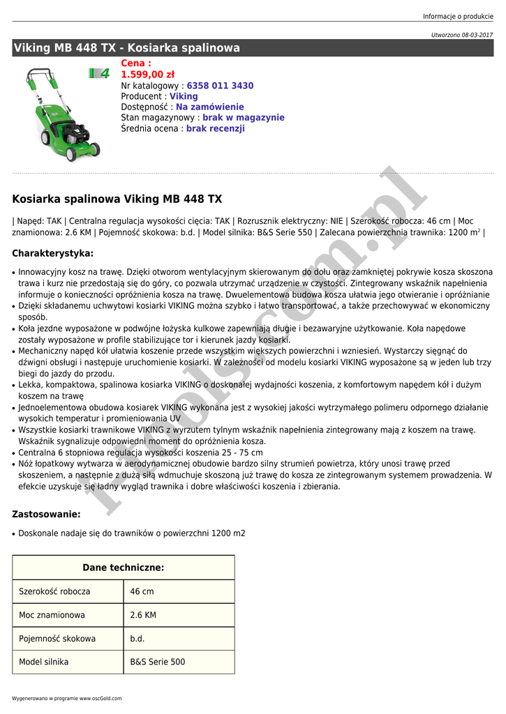 Informacje o produkcie Utworzono 08-03-2017 Viking MB 448 TX - Kosiarka spalinowa Cena : 1.599,00 zł Kosiarka spalinowa Viking MB 448 TX m .p l Nr katalogowy : 6358 011 3430 Producent : Viking Dostępność : Na zamówienie Stan magazynowy : brak w magazynie Średnia ocena : brak recenzji | Napęd: TAK | Centralna regulacja wysokości cięcia: TAK | Rozrusznik elektryczny: NIE | Szerokość robocza: 46 cm | Moc znamionowa: 2.6 KM | Pojemność skokowa: b.d. | Model silnika: B&S Serie 550 | Zalecana powierzchnia trawnika: 1200 m2 | Charakterystyka: ● ● ● ● ● i- ● co ● s. ● Innowacyjny kosz na trawę. Dzięki otworom wentylacyjnym skierowanym do dołu oraz zamkniętej pokrywie kosza skoszona trawa i kurz nie przedostają się do góry, co pozwala utrzymać urządzenie w czystości. Zintegrowany wskaźnik napełnienia informuje o konieczności opróżnienia kosza na trawę. Dwuelementowa budowa kosza ułatwia jego otwieranie i opróżnianie Dzięki składanemu uchwytowi kosiarki VIKING można szybko i łatwo transportować, a także przechowywać w ekonomiczny sposób. Koła jezdne wyposażone w podwójne łożyska kulkowe zapewniają długie i bezawaryjne użytkowanie. Koła napędowe zostały wyposażone w profile stabilizujące tor i kierunek jazdy kosiarki. Mechaniczny napęd kół ułatwia koszenie przede wszystkim większych powierzchni i wzniesień. Wystarczy sięgnąć do dźwigni obsługi i następuje uruchomienie kosiarki. W zależności od modelu kosiarki VIKING wyposażone są w jeden lub trzy biegi do jazdy do przodu. Lekka, kompaktowa, spalinowa kosiarka VIKING o doskonałej wydajności koszenia, z komfortowym napędem kół i dużym koszem na trawę Jednoelementowa obudowa kosiarek VIKING wykonana jest z wysokiej jakości wytrzymałego polimeru odpornego działanie wysokich temperatur i promieniowania UV Wszystkie kosiarki trawnikowe VIKING z wyrzutem tylnym wskaźnik napełnienia zintegrowany mają z koszem na trawę. Wskaźnik sygnalizuje odpowiedni moment do opróżnienia kosza. Centralna 6 stopniowa regulacja wysokości koszenia 25 - 75 cm Nóż łopatkowy wytwarza w aerodynamicznej obudowie bardzo silny strumień powietrza, który unosi trawę przed skoszeniem, a następnie z dużą siłą wdmuchuje skoszoną już trawę do kosza ze zintegrowanym systemem prowadzenia. W efekcie uzyskuje się ładny wygląd trawnika i dobre właściwości koszenia i zbierania. to ol ● Zastosowanie: ● Doskonale nadaje się do trawników o powierzchni 1200 m2 Dane techniczne: Szerokość robocza 46 cm Moc znamionowa 2.6 KM Pojemność skokowa b.d. Model silnika B&S Serie 500 Wygenerowano w programie www.oscGold.com Wysokość cięcia 25 - 75 mm Pojemność kosza 55 l Zalecana powierzchnia trawnika 1200 m2 Ciężar 26 kg GWARANCJA 12 m-cy (faktura VAT) 24 m-ce (zakup konsumencki) m .p l Wyposażenie standardowe: 1. Kosiarka spalinowa Viking MB 448 TX 2. Instrukcja obsługi 3. Opakowanie: karton Wyposażenie opcjonalne: to ol s. co Funkcja mulczowania. Jeśli zdemontowany zostanie kosz na trawę, a zamontowana przysłona do mulczowania, to kosiarka może pracować w trybie mulczowania. Skoszona trawa jest w tym przypadku dokładnie rozdrabniana i równomiernie rozrzucana po trawniku, co likwiduje konieczność opróżniania kosza. Takie rozwiązanie gwarantuje oszczędność czasu, a trawnik odzyskuje substancje odżywcze i wilgoć. i- ●