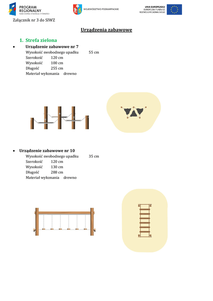 WOJEWÓDZTWO PODKARPACKIE Załącznik nr 3 do SIWZ Urządzenia zabawowe 1. Strefa zielona Urządzenie zabawowe nr 7 Wysokość swobodnego upadku Szerokość 120 cm Wysokość 100 cm Długość 255 cm Materiał wykonania drewno 55 cm Urządzenie zabawowe nr 10 Wysokość swobodnego upadku Szerokość 120 cm Wysokość 130 cm Długość 288 cm Materiał wykonania drewno 35 cm WOJEWÓDZTWO PODKARPACKIE Urządzenie zabawowe nr 8 Wysokość swobodnego upadku Szerokość 394 cm Wysokość 230 cm Długość 343 cm Materiał wykonania drewno Urządzenie zabawowe nr 11 Wysokość swobodnego upadku Wysokość 120 cm Materiał wykonania drewno 230 cm 25 cm WOJEWÓDZTWO PODKARPACKIE Urządzenie zabawowe nr 5 Wysokość swobodnego upadku Materiał wykonania drewno Urządzenie zabawowe nr 3 Szerokość 220 cm Wysokość 190 cm Długość 158 cm Materiał wykonania drewno Urządzenie zabawowe nr 9 Wysokość swobodnego upadku Materiał wykonania drewno 55 cm 50 cm WOJEWÓDZTWO PODKARPACKIE Urządzenie zabawowe nr 4 Wysokość 15 cm Materiał wykonania drewno Urządzenie zabawowe nr 6 Wysokość swobodnego upadku Szerokość 280 cm Wysokość 240 cm Długość 90 cm Materiał wykonania drewno 140 cm 2. Strefa żółta Urządzenie zabawowe nr 2 Wysokość swobodnego upadku Szerokość 25 cm Wysokość 87 cm Długość 91 cm Materiał wykonania metal 51 cm WOJEWÓDZTWO PODKARPACKIE Urządzenie zabawowe nr 1 3. Strefa czerwona Urządzenie zabawowe nr 15 Wysokość swobodnego upadku Szerokość 400 cm Wysokość 73 cm Długość 32 cm Materiał wykonania metal 77 cm Urządzenie zabawowe nr 16 Wysokość swobodnego upadku 75 cm Strefa bezpieczeństwa 560x560 Materiał wykonania metal Urządzenie zabawowe nr 14 wymiary: 541 x 243 x 210 cm strefa bezpieczeństwa: 38m2 max. wys. swobodnego upadku: 210cm WOJEWÓDZTWO PODKARPACKIE bezpieczne nawierzchnie: podłoże strefy bezpieczeństwa urządzenia zabawowego to płytki gumowe w kolorze czerwonym. Płytki połączone systemem łączników układane we wzór „na cegiełkę”. Płytki gumowe układać na utwardzonym podłożu (warstwa pospółki gr. 20 cm, warstwa klińca gr. 5 cm) 4. Strefa niebieska Urządzenie zabawowe nr 13 Wysokość swobodnego upadku 178 cm Szerokość 516 cm Wysokość 178 cm Długość 516 cm Materiał wykonania metal 5. Ścieżka zdrowia Urządzenie nr 19 Długość 90 cm Szerokość 12 cm Wysokość 180 cm WOJEWÓDZTWO PODKARPACKIE Urządzenie nr 17 Długość 180 cm Szerokość 100 cm Wysokość 140 cm Urządzenie nr 20 Długość 200 cm Szerokość 60 cm Wysokość 80 cm Urządzenie nr 18 Długość 230 cm Szerokość 12 cm Wysokość 180 cm WOJEWÓDZTWO PODKARPACKIE 6. Mała architektura Urządzenie nr 22 Długość 40 cm Szerokość 40 cm Wysokość 70 cm