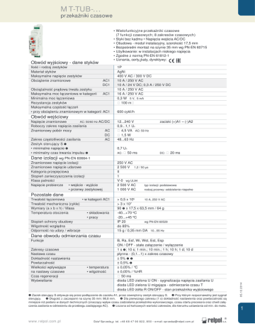 M T-TUB-... pr zekaźniki czasowe • Wielofunkcyjne przekaźniki czasowe (7 funkcji czasowych; 8 zakresów czasowych) • Styki bez kadmu • Napięcia wejścia AC/DC • Obudowa - moduł instalacyjny, szerokość 17,5 mm • Bezpośredni montaż na szynie 35 mm wg PN-EN 60715 • Użytkowanie: w instalacjach niskiego napięcia • Zgodne z normą PN-EN 61812-1 • Uznania, certy¿katy, dyrektywy: Obwód wyjściowy - dane styków Ilość i rodzaj zestyków Materiał styków Maksymalne napięcie zestyków Obciążenie znamionowe AC1 DC1 Obciążalność prądowa trwała zestyku Maksymalna moc łączeniowa w kategorii AC1 Minimalna moc łączeniowa Rezystancja zestyków Maksymalna częstość łączeń • przy obciążeniu znamionowym w kategorii AC1 1P AgNi 400 V AC / 300 V DC 10 A / 250 V AC 10 A / 24 V DC; 0,3 A / 250 V DC 10 A / 250 V AC 16 A / 250 V AC 0,3 W 5 V, 5 mA 100 m 600 cykli/h Obwód wejściowy Napięcie znamionowe AC: 50/60 Hz AC/DC Roboczy zakres napięcia zasilania Znamionowy pobór mocy AC DC Zakres częstotliwości zasilania AC Zestyk sterujący S ❶ • minimalne napięcie ❷ • minimalny czas trwania impulsu ❷ 12...240 V 0,9...1,1 Un 4,5 VA AC: 50 Hz 1,5 W 48...63 Hz zaciski (+)A1 – (-)A2 0,7 Un AC: 50 ms DC: 20 ms Dane izolacji wg PN-EN 60664-1 Znamionowe napięcie izolacji Znamionowe napięcie udarowe Kategoria przepięciowa Stopień zanieczyszczenia izolacji Klasa palności Napięcie probiercze • wejście - wyjście • przerwy zestykowej 250 V AC 2 500 V 1,2 / 50 µs II 1 V-0 wg UL94 2 500 V AC typ izolacji: podstawowa 1 000 V AC rodzaj przerwy: oddzielenie niepełne Pozostałe dane Trwałość łączeniowa • w kategorii AC1 Trwałość mechaniczna (cykle) Wymiary (a x b x h) / Masa Temperatura otoczenia • składowania • pracy Stopień ochrony obudowy Wilgotność względna Odporność na udary / wibracje > 0,5 x 105 10 A, 250 V AC > 3 x 107 90 ❸ x 17,5 x 63,5 mm / 64 g -40...+70 oC -20...+45 oC IP 20 wg PN-EN 60529 do 85% 15 g / 0,35 mm DA 10...55 Hz Funkcje Zakresy czasowe Nastawa czasu Dokładność nastawienia Powtarzalność Wielkości wpływające na nastawy czasowe Czas regeneracji Wyświetlanie • temperatura • wilgotność B, Ra, Esf, Wi, Wst, Est, Esp ON / OFF - stałe załączenie / wyłączenie 1 s ❹ ; 10 s; 1 min.; 10 min.; 1 h; 10 h; 1 d; 10 d płynna - (0,1...1) x zakres czasowy ± 5% ❺ ❹ ± 0,5% ❹ ± 0,05% / °C ± 0,05% / %HR 50 ms dioda LED zielona U ON - sygnalizacja napięcia zasilania U dioda LED zielona U migająca - odmierzanie czasu T dioda LED żółta R ON/OFF - stan przekaźnika wyjściowego ❶ Zacisk sterujący S aktywuje się przez podłączenie do zacisku A1, przez zewnętrzny zestyk sterujący S. ❷ Przy którym rozpoznawalny jest sygnał sterujący. ❸ Długość z zaczepami na szynę 35 mm: 98,8 mm. ❹ Dla pierwszego zakresu (1 s) dokładność nastawienia oraz powtarzalność są mniejsze niż podano w danych technicznych (znaczący wpływ czasu zadziałania przekaźnika wykonawczego, czasu startu procesora oraz chwili załączenia zasilania w odniesieniu do przebiegu zasilającego AC). ❺ Liczona od końcowych wartości zakresów, dla kierunku ustawiania od min. do maks. www.r elpol.com.pl Dzia³ Spr zeda¿y t el. +4 8 6 8 4 7 9 0 8 2 2 , 8 5 0 • e-m ail: spr zedaz@r elpol. com .pl 0 5 .1 2 .2 0 1 4 Dane obwodu odmierzania czasu 1 M T-TUB-... pr zekaźniki czasowe Funkcje czasowe ON / OFF - Stałe załączenie / wyłączenie. Wybór funkcji ON lub OFF następuje za pomocą potencjometru TIME. W trybie pracy ON przez cały czas zestyki zwierne są zam knięte, natomiast w trybie pracy OFF są otwarte. Przy funkcjach tych nie ma znaczenia położenie potencjometru FUNC oraz nastawiony czas odmierzania. Tryby stałego załączenia lub wyłączenia znajdują zastosowanie przy kontroli pracy przekaźnika czasowego w układzie elektrycznym. B - Praca cykliczna sterowana zamykaniem zestyku sterującego S. Wejście przekaźnika czasowego jest zasilane napięciem U w sposób ciągły. Zamknięcie zestyku sterującego S powoduje natychmiastowe załączenie przekaźnika wykonawczego R. Każde następne zamknięcie zestyku sterującego S powoduje zmianę stanu przekaźnika wykonawczego R na przeciwny (cecha przekaźnika bistabilnego). Wst - Załączenie na nastawiony czas, wyzwalane zamknięciem zestyku S, z przedłużaniem czasu T - przedłużaniem załączenia przekaźnika wykonawczego R. Wejście przekaźnika czasowego jest zasilane napięciem U w sposób ciągły. Zamknięcie zestyku sterującego S powoduje natychmiastowe załączenie przekaźnika wykonawczego R na nastawiony czas T. Po odmierzeniu czasu T przekaźnik wykonawczy wyłącza się. Kolejne zamknięcie zestyku sterującego S powoduje ponowne natychmiastowe załączenie przekaźnika wykonawczego R na czas T. Zamknięcie zestyku sterującego S w trakcie odmierzania czasu T powoduje skasowanie odmierzonego już czasu i rozpoczęcie odmierzania czasu T od początku. Est - Opóźnione załączenie wyzwalane zamknięciem zestyku S, z przedłużaniem czasu T. Ra - Opóźnione wyłączenie sterowane zestykiem S, bez przedłużania czasu T. Wejście przekaźnika czasowego jest zasilane napięciem U w sposób ciągły. Zamknięcie zestyku sterującego S powoduje natychmiastowe załączenie przekaźnika wykonawczego R. Otwarcie zestyku sterującego S rozpoczyna odmierzenie nastawionego czasu opóźnienia wyłączenia przekaźnika wykonawczego R. Po odmierzeniu czasu T przekaźnik wykonawczy R wyłącza się. Otwieranie i zamykanie zestyku sterującego S w trakcie odmierzania czasu T nie wpływa na realizowaną funkcję. Wejście przekaźnika czasowego jest zasilane napięciem U w sposób ciągły. Zamknięcie zestyku sterującego S rozpoczyna odmierzenie czasu T, a po jego upływie załącza się przekaźnik wykonawczy R i pozostaje w tym stanie do kolejnego zamknięcia zestyku sterującego S lub do momentu wyłączenia zasilania U. Zamknięcie zestyk