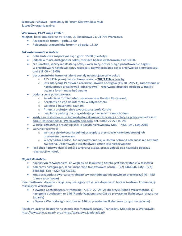 Szanowni Państwo – uczestnicy III Forum Kierowników MLD Szczegóły organizacyjne: Warszawa, 19-21 maja 2016 r. Miejsce: hotel DoubleTree by Hilton, ul. Skalnicowa 21, 04-797 Warszawa. Rozpoczęcie forum – godz.15.00 Rejestracja uczestników forum – od godz. 13.30 Zakwaterowanie w hotelu doba hotelowa rozpoczyna się o godz. 15.00 (niestety) jednak w miarę dostępności pokoi, możliwe będzie kwaterowanie od 13.00. ci z Państwa, którzy nie dostaną pokoju wcześniej, proszeni są o pozostawienie bagażu w przechowalni hotelowej (przy recepcji) i zakwaterowanie się w przerwie po pierwszej sesji czyli (18.00 – 19.00) dla uczestników forum ustalone zostały następujące ceny pokoi: o 415,8 PLN pokój dwuosobowy za noc – 207,9 PLN od osoby o jeśli zdecydują Państwo o rezerwacji dwóch noclegów (19/20 i 20/21), zamówienie w hotelu proszę zrealizować jednorazowo – rezerwacja drugiego noclegu w trakcie trwania forum może być trudne podana cena pokoi zawiera: o śniadanie w formie bufetu serwowane w Garden Restaurant, o bezpłatny dostęp do internetu w całym hotelu o wellness z basenem i saunami o fitness z profesjonalnie wyposażoną strefą Cardio o bezpłatny parking dla przyjeżdzających własnym samochodem każdy z uczestników musi indywidualnie dokonać rezerwacji i opłaty za pokój pod adresem: email: [email protected], tel.: 0048 22 278 00 28 w treści zgłoszenia proszę wpisać: III Forum Kierowników MLD – KIDL, 19-21.06.2016 warunki rezerwacji: o wymaga się dokonania pełniej przedpłaty przy użyciu karty kredytowej lub przelewem bankowym o w przypadku anulacji lub niepojawienia się w Hotelu pobrana należność nie zostanie zwrócona. Dokonywanie jakichkolwiek zmian jest niedozwolone jeśli chcą Państwo dzielić pokój z wybraną osobą, proszę zgłosić oba nazwiska podczas rezerwacji w hotelu Dojazd do hotelu: najlepszym rozwiązaniem, ze względu na lokalizację hotelu, jest skorzystanie w taksówki polecamy następujące, tanie korporacje taksówkowe: Grosik – (22) 6464646, City – (22) 8488888, Eco – (22) 731731231 koszt przejazdu z dworca centralnego czy wschodniego nie powinien przekroczyć 40 - 45zł (dane szacunkowe) Inne możliwości dojazdu - załączamy szczegóły dotyczące dojazdu do hotelu środkami komunikacji miejskiej w Warszawie: z Dworca Centralnego 07: tramwaje: 7, 8, 9, 22, 24, 25 do przyst. Rondo Waszyngtona, a następnie autobusem nr 146 (Rondo Waszyngtona 03) do przystanku Skalnicowa (przyst. na żądanie) z Dworca Wschodniego: autobus nr 146 do przystanku Skalnicowa (przyst. na żądanie) Rozkłady jazdy są dostępne na stronie internetowej Zarządu Transportu Miejskiego w Warszawie: http://www.ztm.waw.pl/ oraz http://warszawa.jakdojade.pl/