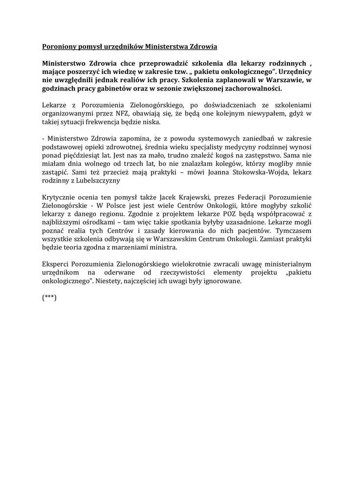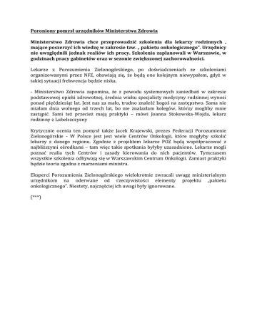 Poroniony pomysł urzędników Ministerstwa Zdrowia Ministerstwo Zdrowia chce przeprowadzić szkolenia dla lekarzy rodzinnych , mające poszerzyć ich wiedzę w zakresie tzw. „ pakietu onkologicznego”. Urzędnicy nie uwzględnili jednak realiów ich pracy. Szkolenia zaplanowali w Warszawie, w godzinach pracy gabinetów oraz w sezonie zwiększonej zachorowalności. Lekarze z Porozumienia Zielonogórskiego, po doświadczeniach ze szkoleniami organizowanymi przez NFZ, obawiają się, że będą one kolejnym niewypałem, gdyż w takiej sytuacji frekwencja będzie niska. - Ministerstwo Zdrowia zapomina, że z powodu systemowych zaniedbań w zakresie podstawowej opieki zdrowotnej, średnia wieku specjalisty medycyny rodzinnej wynosi ponad pięćdziesiąt lat. Jest nas za mało, trudno znaleźć kogoś na zastępstwo. Sama nie miałam dnia wolnego od trzech lat, bo nie znalazłam kolegów, którzy mogliby mnie zastąpić. Sami też przecież mają praktyki – mówi Joanna Stokowska-Wojda, lekarz rodzinny z Lubelszczyzny Krytycznie ocenia ten pomysł także Jacek Krajewski, prezes Federacji Porozumienie Zielonogórskie - W Polsce jest jest wiele Centrów Onkologii, które mogłyby szkolić lekarzy z danego regionu. Zgodnie z projektem lekarze POZ będą współpracować z najbliższymi ośrodkami – tam więc takie spotkania byłyby uzasadnione. Lekarze mogli poznać realia tych Centrów i zasady kierowania do nich pacjentów. Tymczasem wszystkie szkolenia odbywają się w Warszawskim Centrum Onkologii. Zamiast praktyki będzie teoria zgodna z marzeniami ministra. Eksperci Porozumienia Zielonogórskiego wielokrotnie zwracali uwagę ministerialnym urzędnikom na oderwane od rzeczywistości elementy projektu „pakietu onkologicznego”. Niestety, najczęściej ich uwagi były ignorowane. (***)