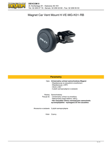 DEVCOM II Al. Korfantego 81 - Katowice 40-161 Tel. 32 259 27 19 - Serwis: 32 259 22 60 - Fax: 32 258 05 53 Magnet Car Vent Mount H-VE-MG-K01-RB Parametry Opis Uniwersalny uchwyt samochodowy Magnet - Współpracuje ze wszystkimi smartfonami - Współpracuje z GPS - Obrót o 360 ° - 2 płytki samoprzylepne w zestawie Rodzaj Samochodowy Pasuje do - Uniwersalny uchwyt na smartfony. - Maksymalna waga telefonu: 300 g - Nie wszystkie otwory wentylacyjne samochodu są kompatybilne - wymagana 25 mm szczelina Akcesoria w zestawie 2 płytki samoprzylepne Kolor Czarny 1/1 Powered by TCPDF (www.tcpdf.org)