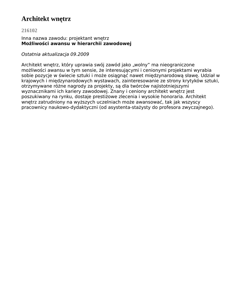 Architekt wnętrz 216102 Inna nazwa zawodu: projektant wnętrz Możliwości awansu w hierarchii zawodowej Ostatnia aktualizacja 09.2009 Architekt wnętrz, który uprawia swój zawód jako „wolny” ma nieograniczone możliwości awansu w tym sensie, że interesującymi i cenionymi projektami wyrabia sobie pozycje w świecie sztuki i może osiągnąć nawet międzynarodową sławę. Udział w krajowych i międzynarodowych wystawach, zainteresowanie ze strony krytyków sztuki, otrzymywane różne nagrody za projekty, są dla twórców najistotniejszymi wyznacznikami ich kariery zawodowej. Znany i ceniony architekt wnętrz jest poszukiwany na rynku, dostaje prestiżowe zlecenia i wysokie honoraria. Architekt wnętrz zatrudniony na wyższych uczelniach może awansować, tak jak wszyscy pracownicy naukowo-dydaktyczni (od asystenta-stażysty do profesora zwyczajnego).